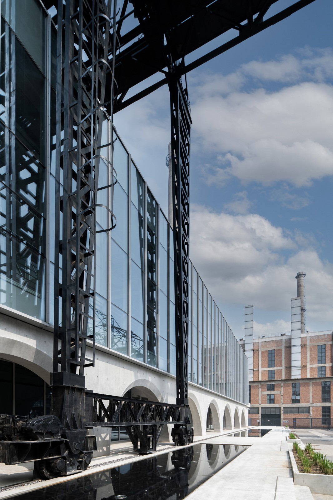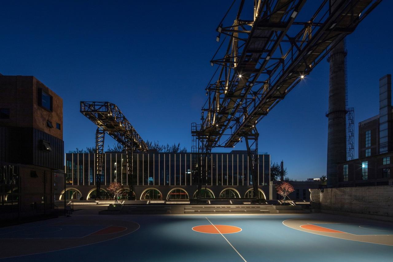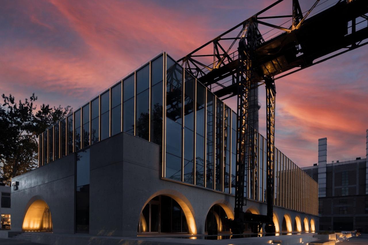 立面采用连续的清水混凝土拱券方式与周围粗旷的工业遗迹形成对比,并将保留的天⻋与建筑结合,不仅形成了独特的建筑形象,还利用其可移动的方式与屋顶形空间成互动。玻璃幕墙和大面积天窗将室外壮观的工业景观引入室内,同时也在建筑外立面上形成映射,产生奇妙空间对话。 室内设计追求最大的空间开放性,将地下一层的一半的空间打开,创造一个 3 层通高的几乎全透明空间,室外的丰富工业景观最大可能地渗透进室内,在紧凑的空间内重组,创造意外的戏剧性。
