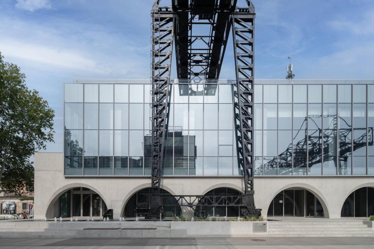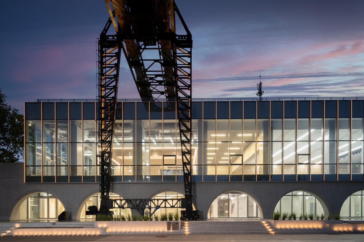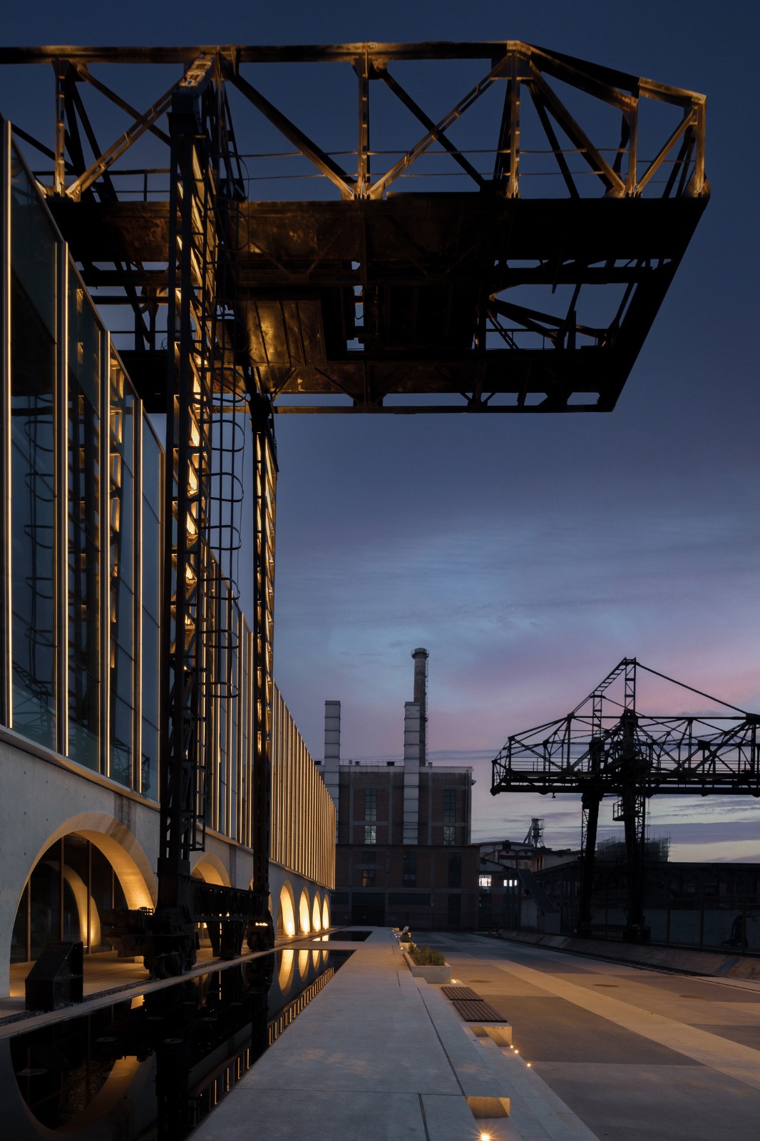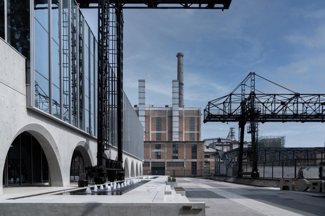 立面采用连续的清水混凝土拱券方式与周围粗旷的工业遗迹形成对比,并将保留的天⻋与建筑结合,不仅形成了独特的建筑形象,还利用其可移动的方式与屋顶形空间成互动。玻璃幕墙和大面积天窗将室外壮观的工业景观引入室内,同时也在建筑外立面上形成映射,产生奇妙空间对话。 室内设计追求最大的空间开放性,将地下一层的一半的空间打开,创造一个 3 层通高的几乎全透明空间,室外的丰富工业景观最大可能地渗透进室内,在紧凑的空间内重组,创造意外的戏剧性。