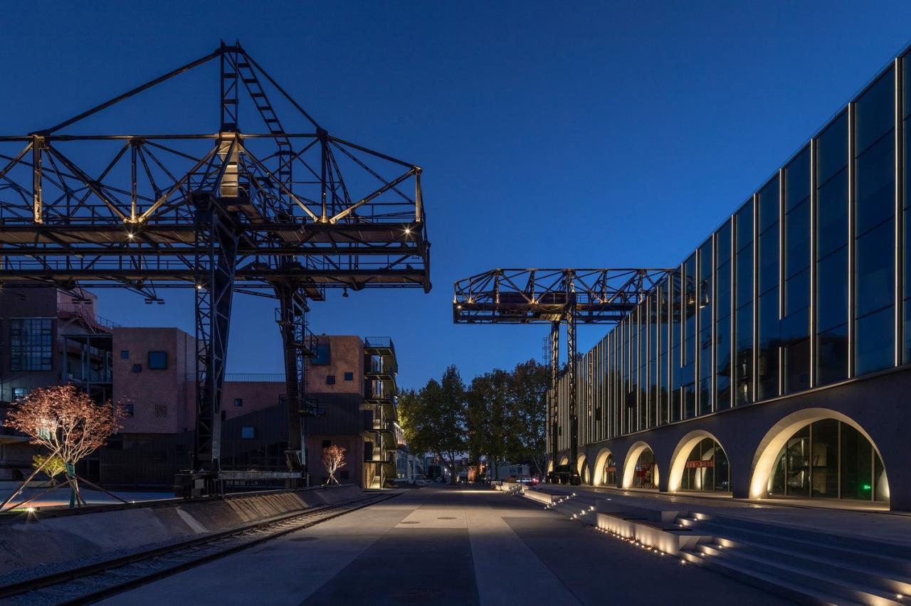 整体景观与火⻋头广场融为一体,并向厂区南北“腹地”延伸,形成活跃的“十字”街区。基地内散落的工业构筑物通过新旧的补充织补,再现了既有工业肌理,同时又将工艺导向的工业布局转化为的活力城市生活场景,以人性导向的方式表达了对工业文化的有机传承。