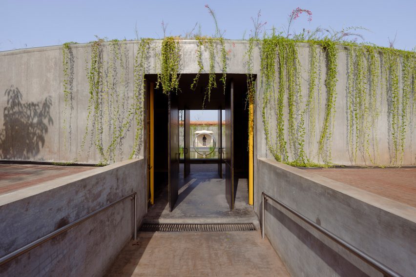 黄色的钢门和结构元素与结构的混凝土内部相得益彰。为了回应周围的乡村景观,一个绿色的屋顶覆盖在混凝土纪念碑的顶部,藤蔓覆盖在建筑的边缘。