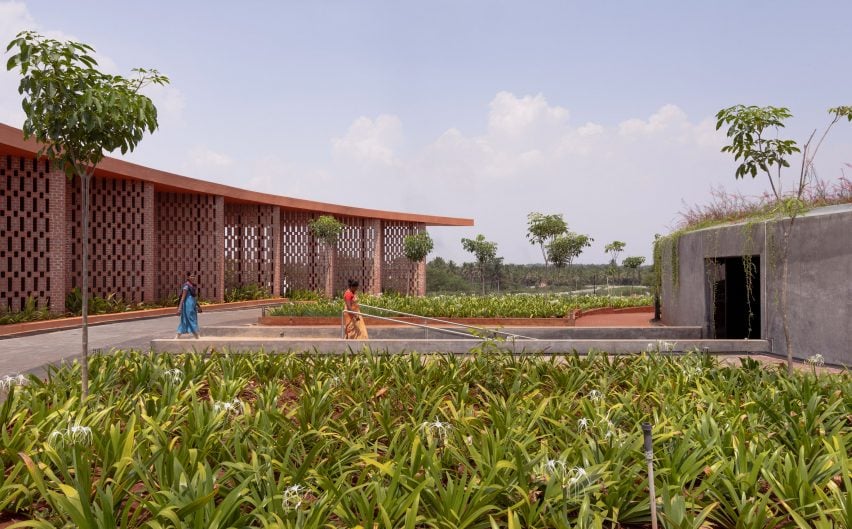 一个穿孔的红砖立面延伸穿过建筑砌块的长度,形成了一条粉红色的遮蔽走廊。M9设计工作室创始人尼查尔亚-布哈库马解释道:“(建筑物)是记忆纪念碑和照片库的背景,精心保护了空间的神圣性。”