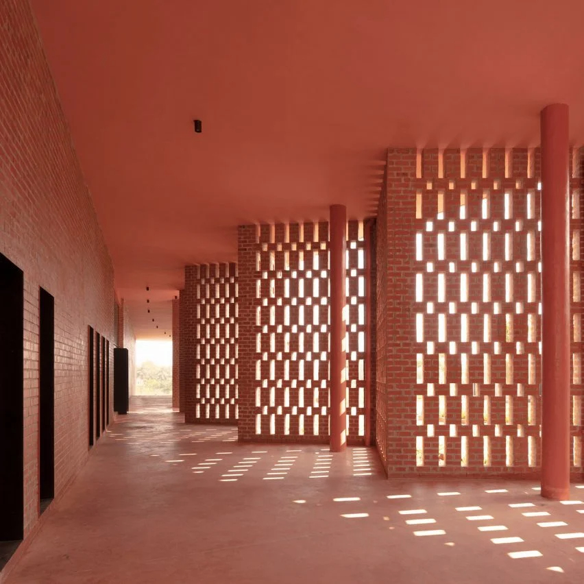 他说:“作为一种动态元素,多孔砖走廊连接着建筑内的不同空间。它与光影融为一体,类似于舞台表演中的窗帘,增加了视觉趣味。”装饰性的红砖与粉红色的墙壁和地板相结合,标志着建筑的入口,黑色金属开口和装饰衬托着它。尼查尔亚-布哈库马解释道:“我们选择砖和混凝土是因为它们的耐用性、象征性和多功能性。”。
