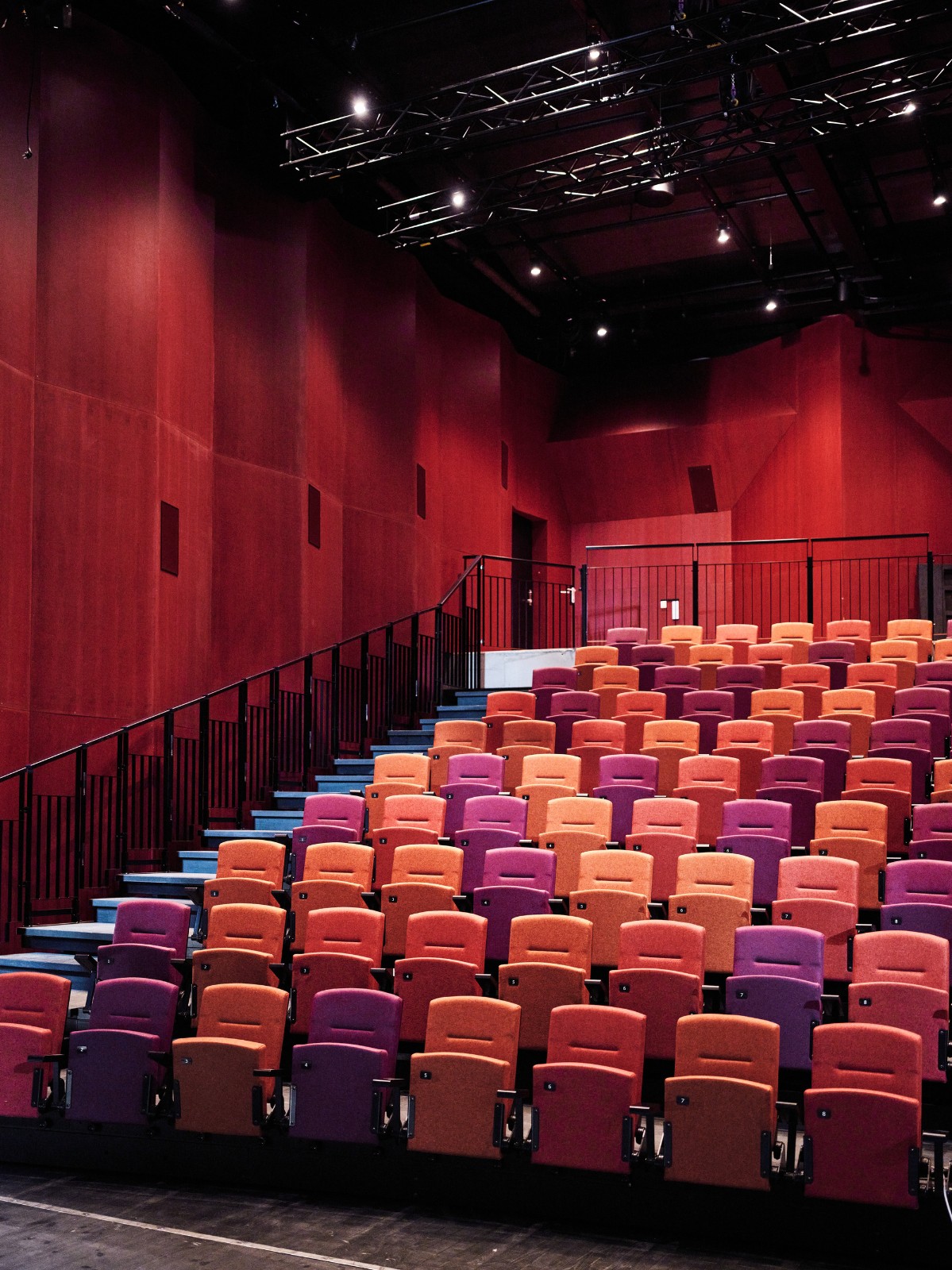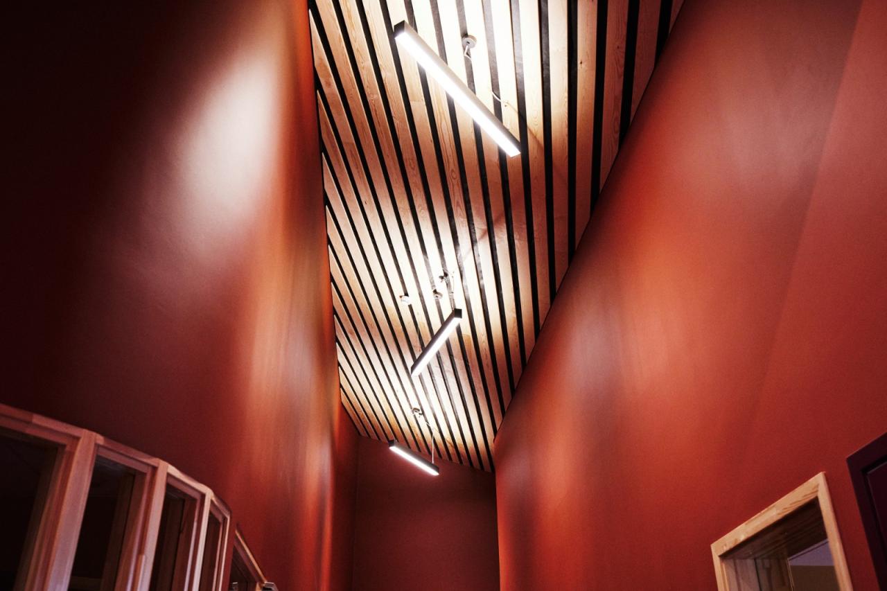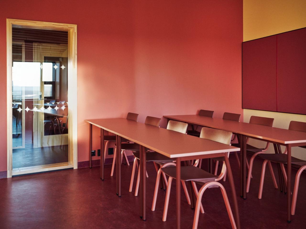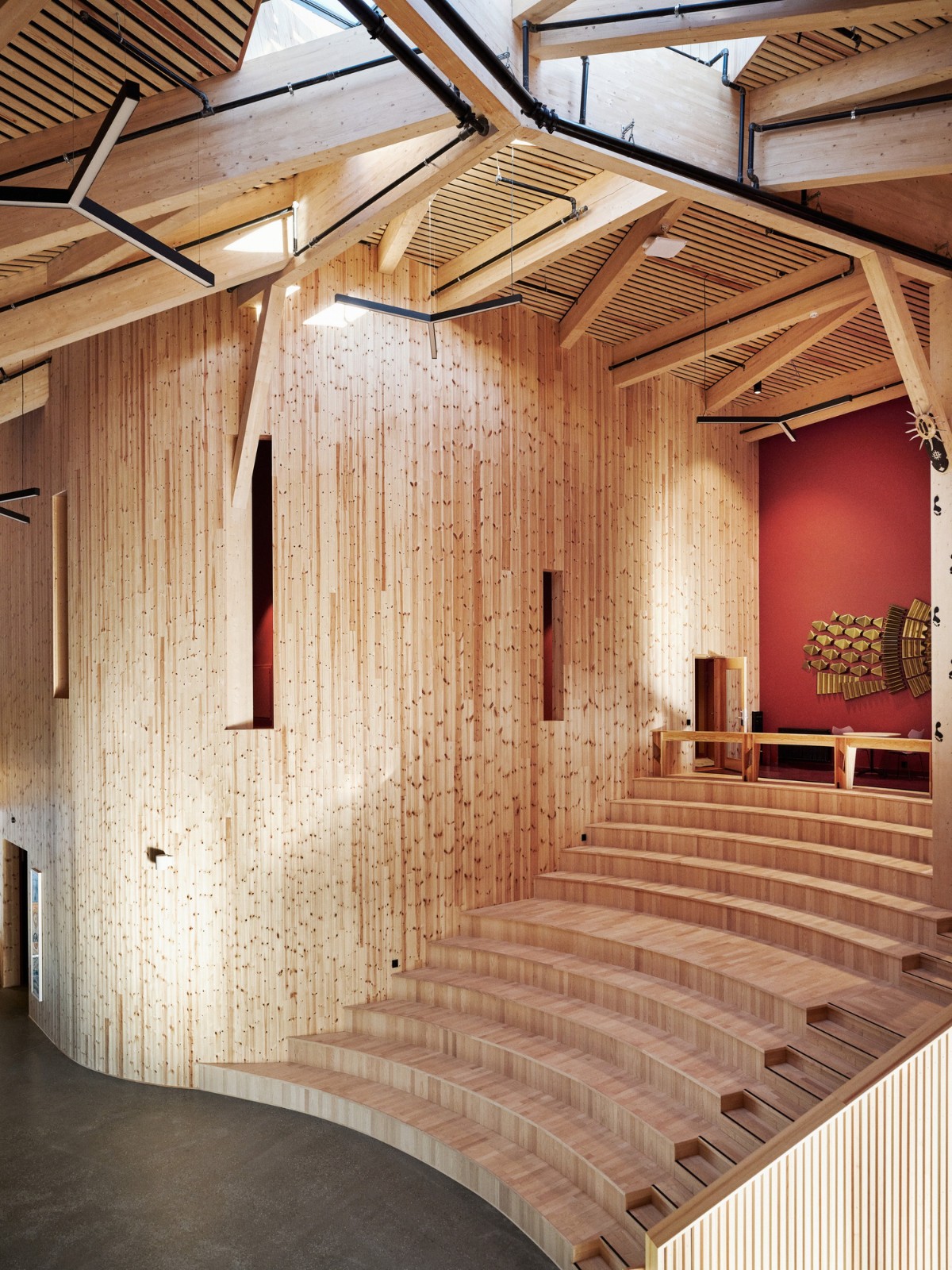 材料和颜色- 建筑物的正面由竖立的木材覆盖着矿松制成。巨大的屋顶面积为 4930 平方米,覆盖着 34,000 米的科本尼(一种碳化木材)。剧院山墙上的阿尔塔板岩来自该村已拆除的旧小学。在前厅和走廊内,抛光混凝土地板模仿了建筑物外部的地面,并融入了当地开采的石材元素,包括板岩和玛西石英岩,呈现出不同深浅的灰色和绿色。建筑物的中心区域,即门厅、前厅和剧院大厅周围,都被涂上了温暖的红色涂料。配色随着和中心距离的加大逐渐变冷,最终在尽端呈现出蓝色调。不同配色方案中门、墙和地板之间的颜色对比都借鉴了萨米人对色彩的运用。这与建筑物的大部分白色外观形成了鲜明对比。