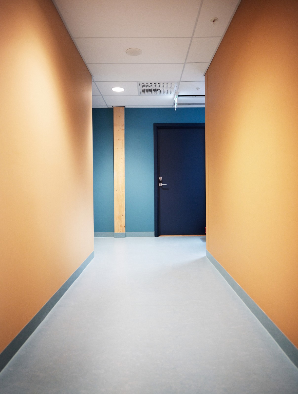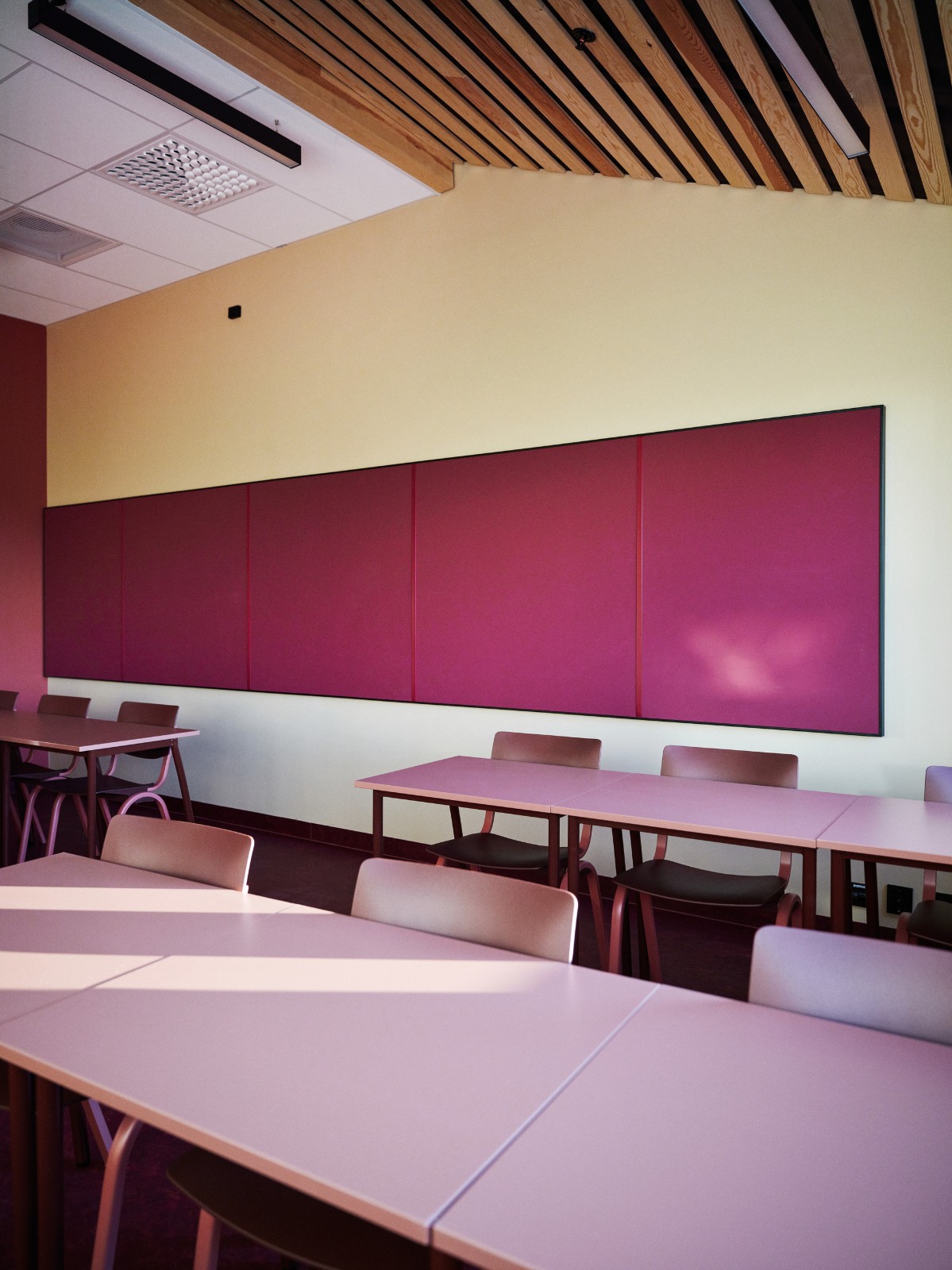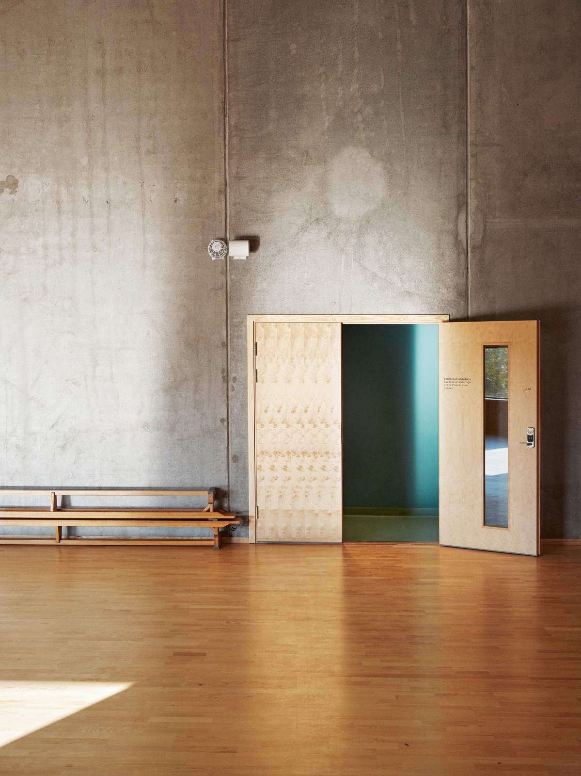 材料和颜色- 建筑物的正面由竖立的木材覆盖着矿松制成。巨大的屋顶面积为 4930 平方米,覆盖着 34,000 米的科本尼(一种碳化木材)。剧院山墙上的阿尔塔板岩来自该村已拆除的旧小学。在前厅和走廊内,抛光混凝土地板模仿了建筑物外部的地面,并融入了当地开采的石材元素,包括板岩和玛西石英岩,呈现出不同深浅的灰色和绿色。建筑物的中心区域,即门厅、前厅和剧院大厅周围,都被涂上了温暖的红色涂料。配色随着和中心距离的加大逐渐变冷,最终在尽端呈现出蓝色调。不同配色方案中门、墙和地板之间的颜色对比都借鉴了萨米人对色彩的运用。这与建筑物的大部分白色外观形成了鲜明对比。