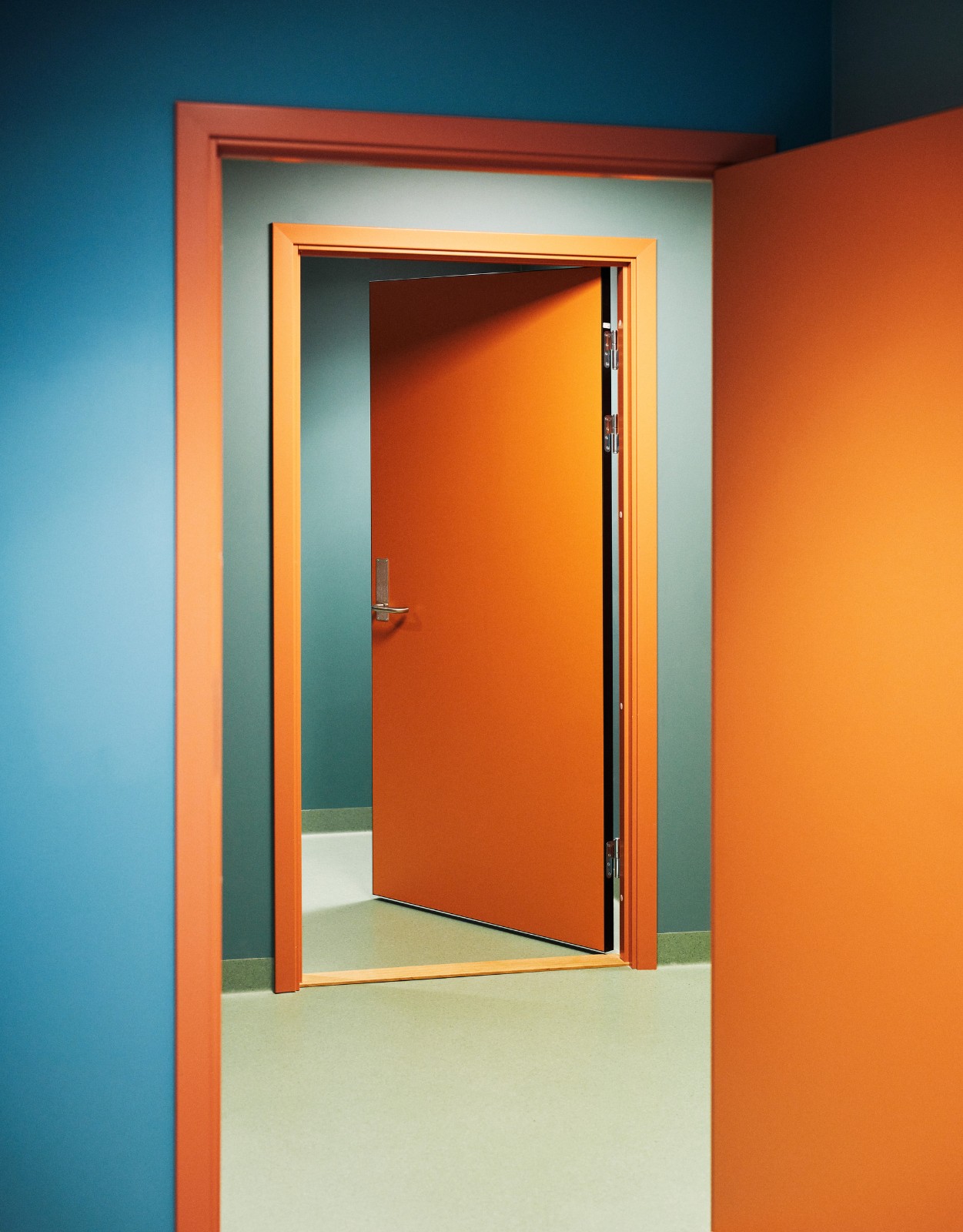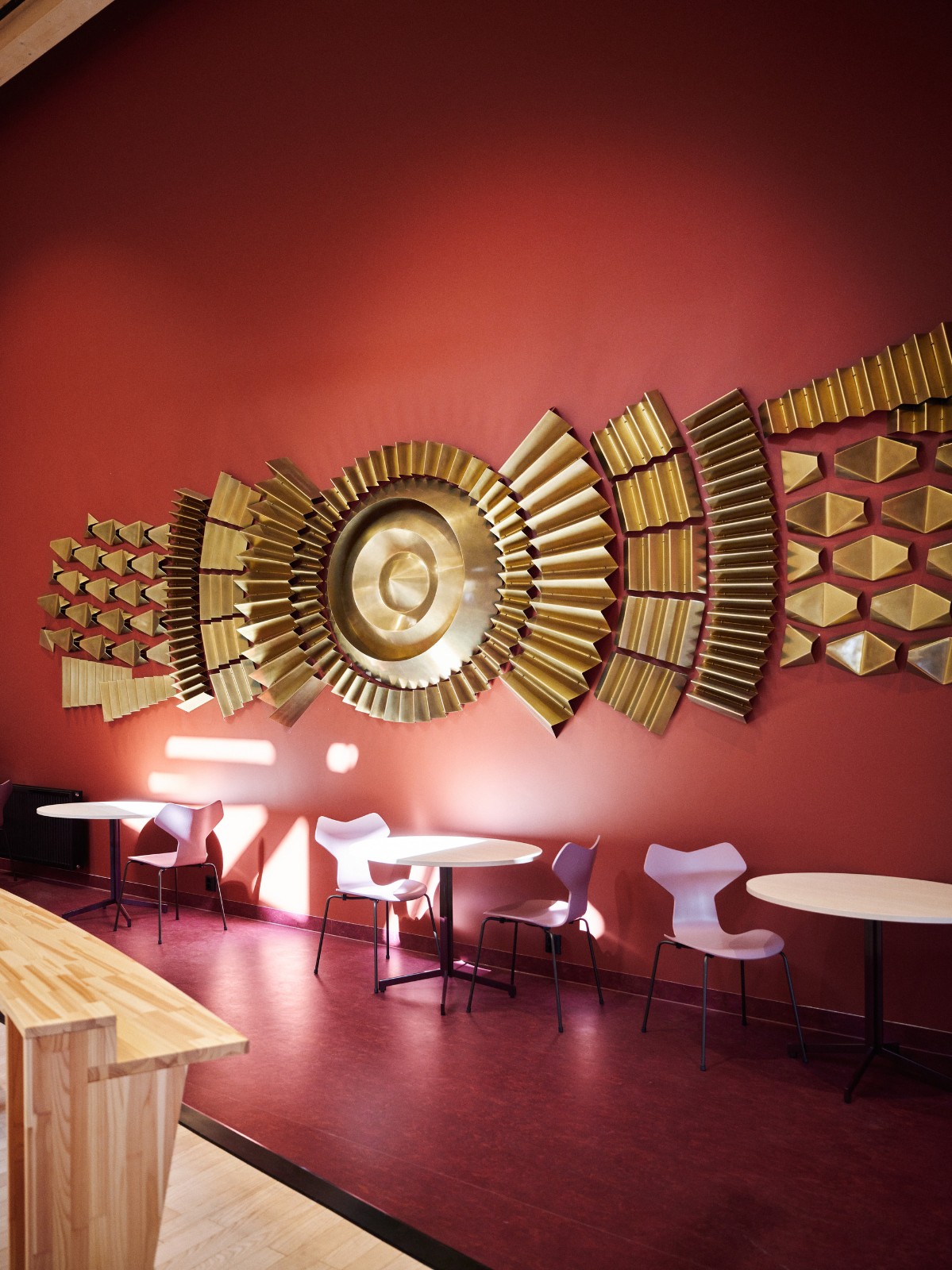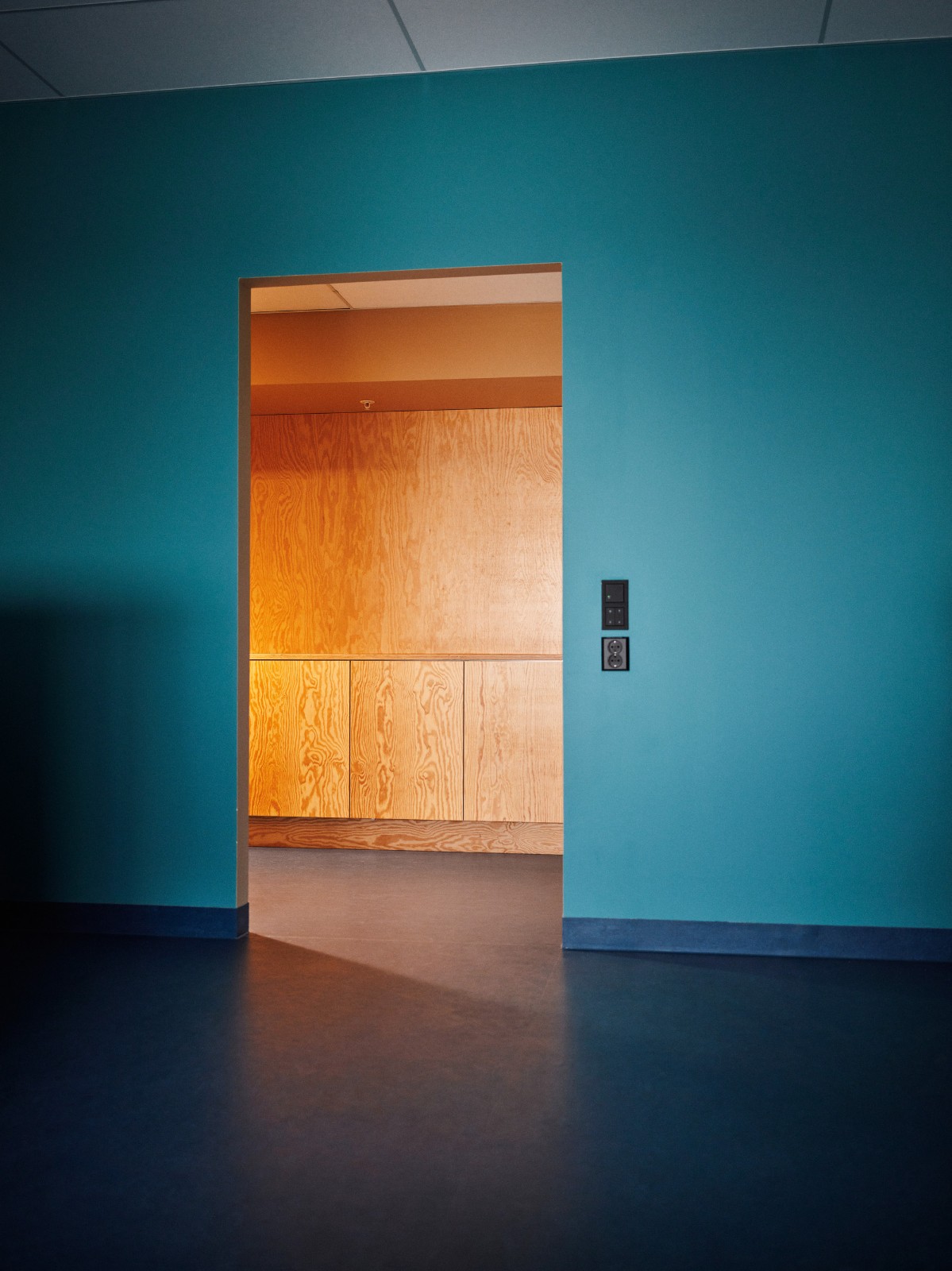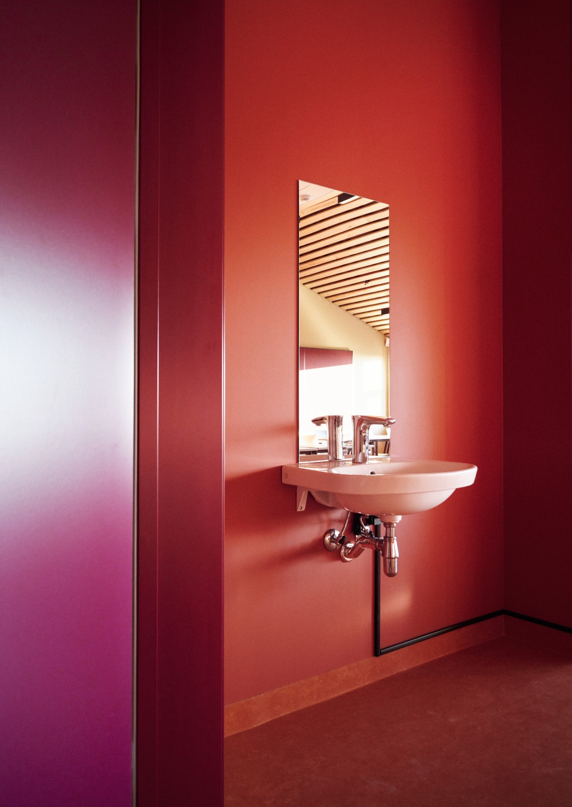 材料和颜色- 建筑物的正面由竖立的木材覆盖着矿松制成。巨大的屋顶面积为 4930 平方米,覆盖着 34,000 米的科本尼(一种碳化木材)。剧院山墙上的阿尔塔板岩来自该村已拆除的旧小学。在前厅和走廊内,抛光混凝土地板模仿了建筑物外部的地面,并融入了当地开采的石材元素,包括板岩和玛西石英岩,呈现出不同深浅的灰色和绿色。建筑物的中心区域,即门厅、前厅和剧院大厅周围,都被涂上了温暖的红色涂料。配色随着和中心距离的加大逐渐变冷,最终在尽端呈现出蓝色调。不同配色方案中门、墙和地板之间的颜色对比都借鉴了萨米人对色彩的运用。这与建筑物的大部分白色外观形成了鲜明对比。