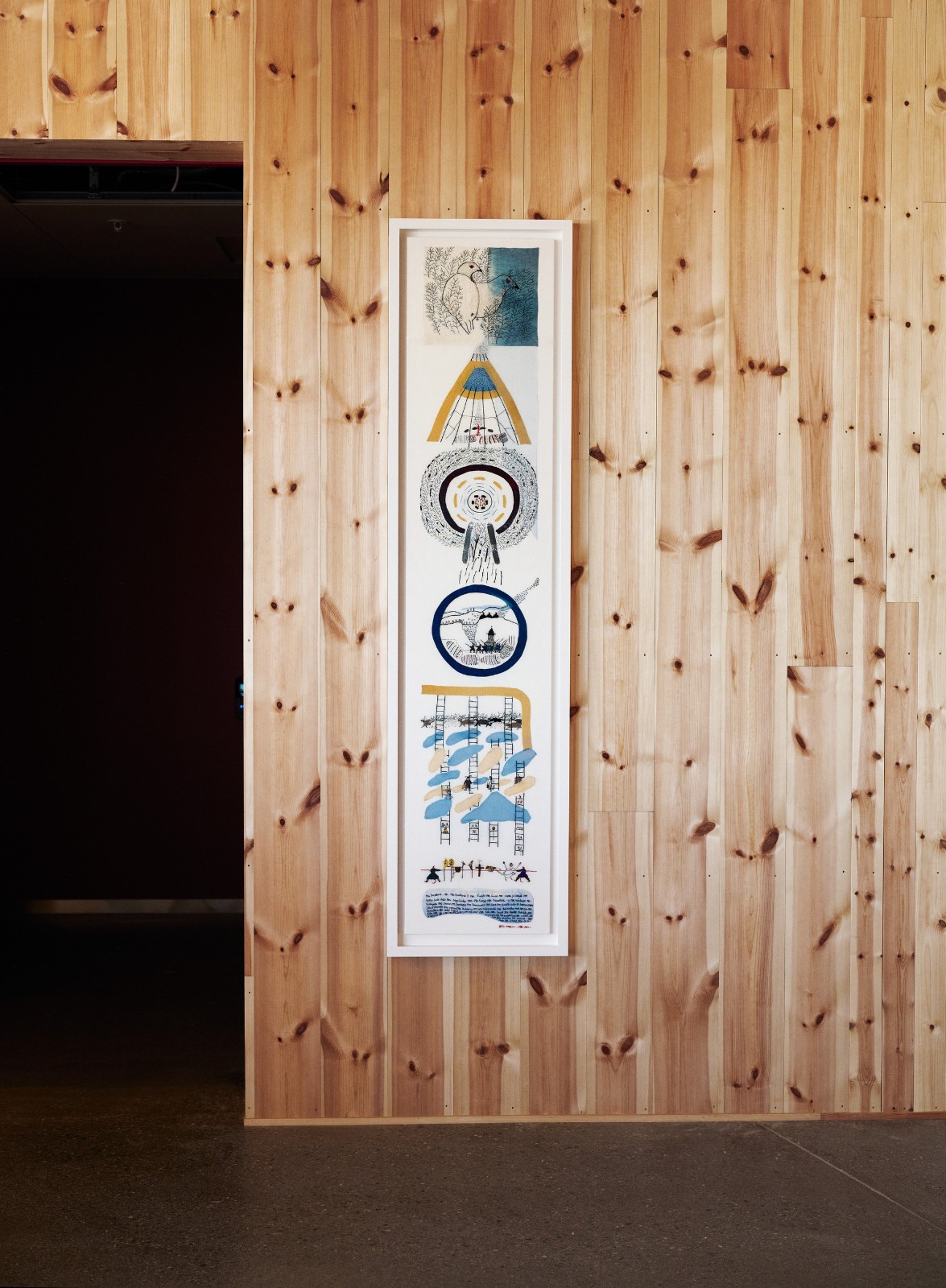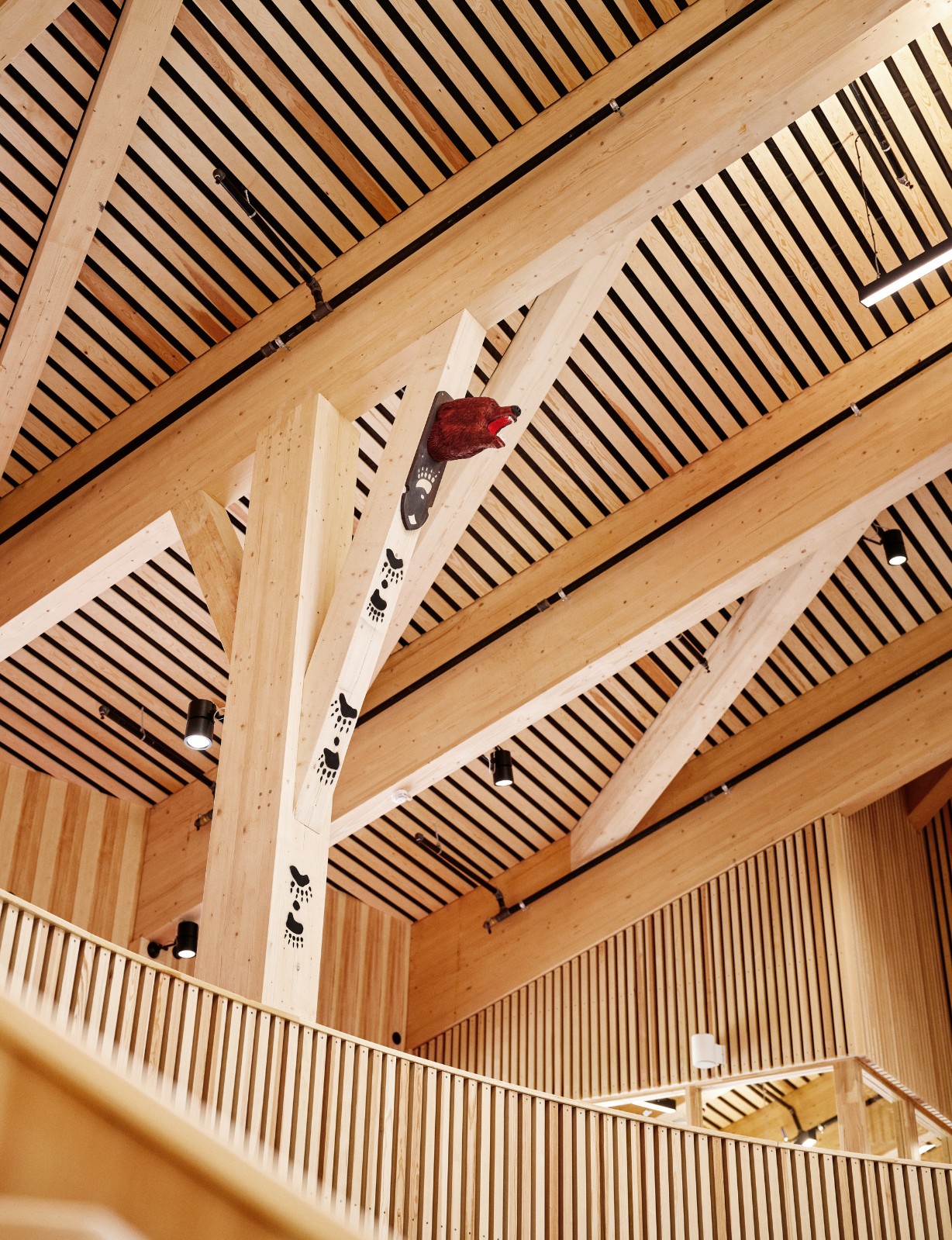 标识和导览- Snøhetta 建筑事务所还制定了标识和导览方案,该方案遵循项目的视觉效果,并与建筑、室内和景观设计相辅相成。它主要具有功能性,但和建筑一样,也微妙地体现了传统工艺和材料的使用。标识由喷粉钢和松木制成,图形元素(包括排版和象形图)则与建筑的布局相呼应。为了满足多语言(北萨米语、南萨米语、卢勒萨米语和书面挪威语)的要求,设计团队广泛使用了图标以提高远距离可读性。布里塔·马拉卡特-拉巴(Britta Marakatt-Labba,1951 年出生)是萨米地区最著名的当代艺术家之一,她为建筑的公共区域创作了刺绣作品《 Miin Duoddarat / Our Plains 》,直接引用了剧院的历史。此外,萨米地区两位最著名且最具影响力的艺术家阿格·高普(Aage Gaup,1943-2021)和艾弗·杰克斯(Iver Jåks,1932-2007)的两件大型现有艺术品也被移至了这栋新建筑中。