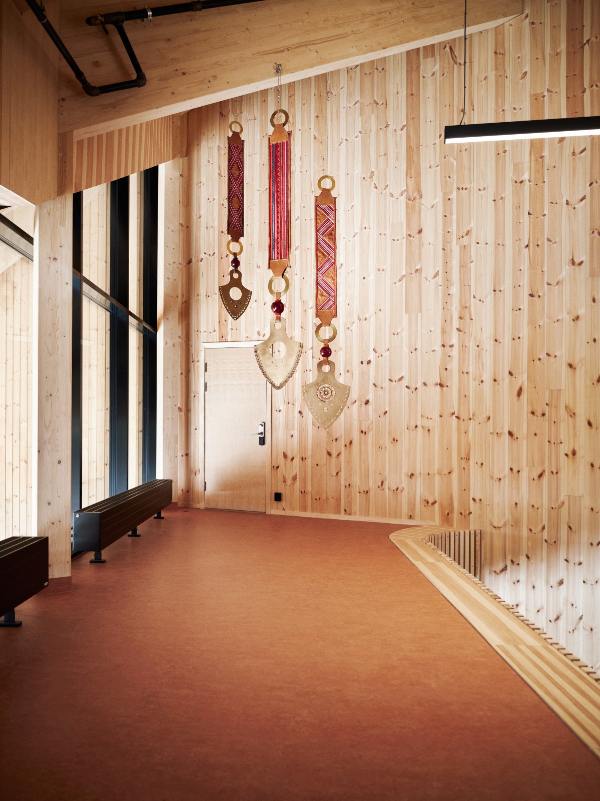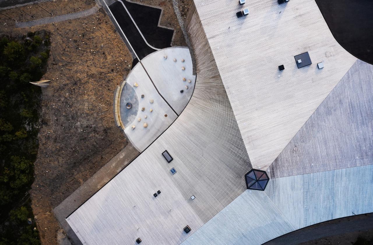 自然地面供暖- Čoarvemátta 符合被动式设计的要求,这意味着该建筑质量上乘,室内气候良好,且能耗极低。由于钻有 40 口深约 250 米的地热井,该建筑在供暖和制冷方面的能源自给率达到了 90%。这些地热井为两台热泵提供能源,热泵负责建筑的供暖和制冷,而能量井的换热器则将多余的热量排放回地下。在最寒冷的冬日里,该系统会辅以电锅炉。在整个建筑工地上,需要移除的土壤都得到了保留,表层土壤被临时储存起来,并在之后被重新铺设到建筑物周围的所有地面上,以确保种子库完好无损。“萨米文化没有将景观培育成公园和城市空间的传统。当你走出拉武(lavvu,一种传统的萨米帐篷)时,你就直接置身于大自然和景观之中,”高级景观建筑师西娅·克万姆·哈特曼(Thea Kvamme Hartmann)说道。