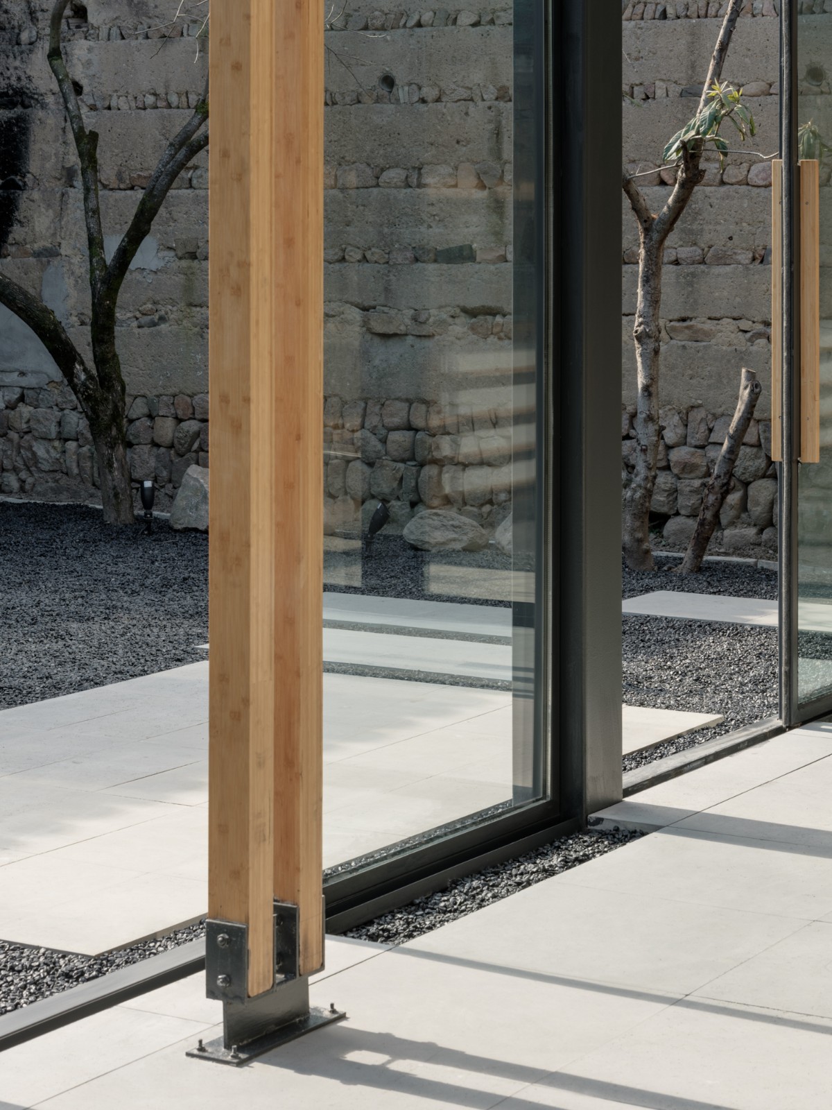 为了提升场地的舒适程度及功能需求,设计团队使用钢结构构筑了两栋自承重的玻璃屋。一处插入古民居中,与历史建筑的原始梁架进行穿插。在保留古民居整体视觉观感与传统抬梁结构的前提下增加了气候边界,便于客人在舒适温度中饮茶。一处独立建于庭院深处。其内部使用了与木梁架相呼应的竹钢材质来对茶饮吧台、卫生间和遮阳顶棚进行构筑。复合竹顶棚抽象模拟了老屋中的木头梁架,还原了与古宅屋面近似的反宇向阳效果。