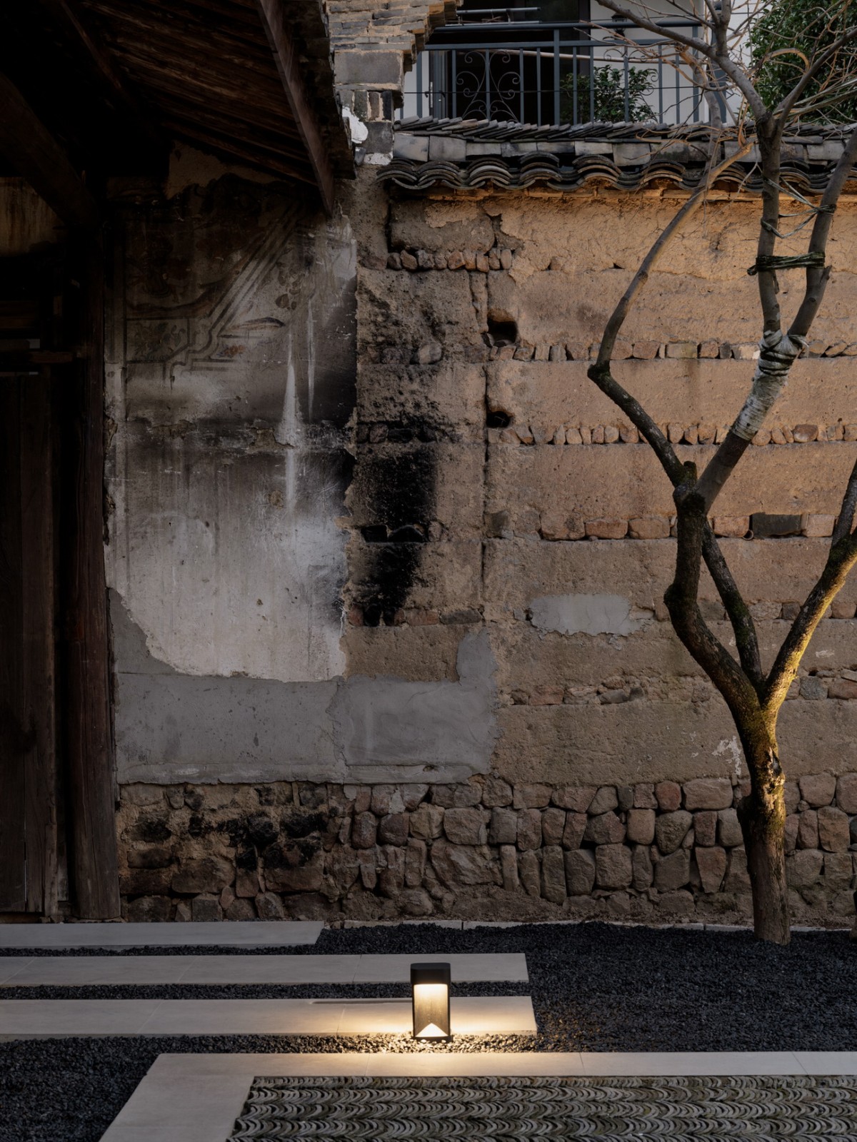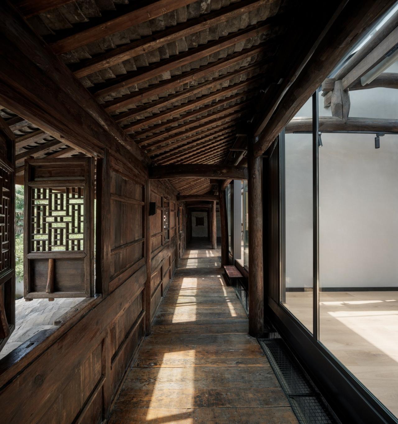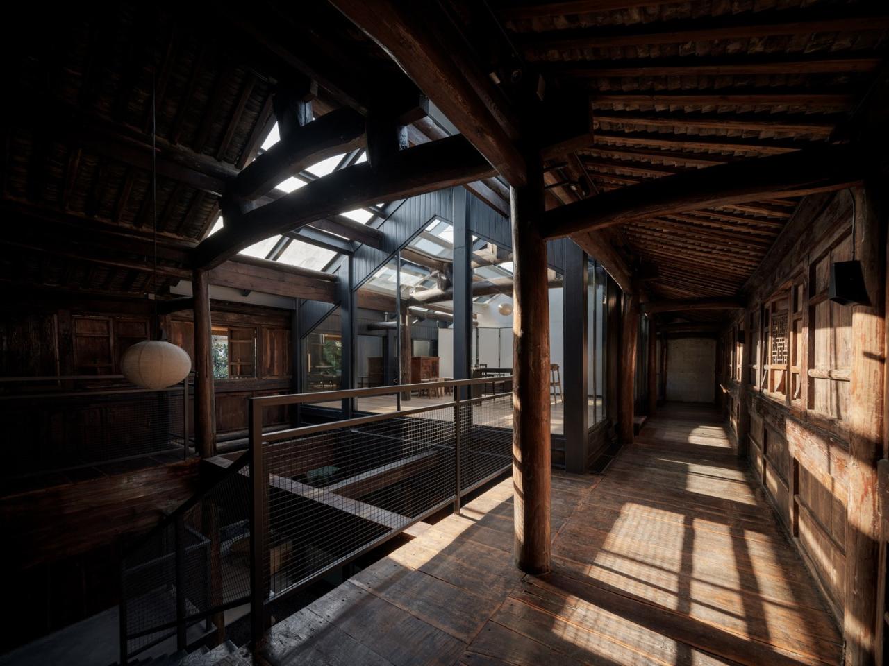 为了引入大量自然光和空气,设计团队裁切掉使古民居室内空间阴暗封闭的部分表皮、屋面和二层楼板,并让庭院的水景穿过立面进入室内。因裁切而暴露出的批檐和柱子在屋前和屋后创造出两个面向庭院的檐下空间,南北透的布局让风可以穿堂而过。局部拆除的二层楼板产生了大屋檐下的挑空空间。这些“修剪”手法模糊了建筑的内外边界,创造了陌生而充满活力的空间体验。