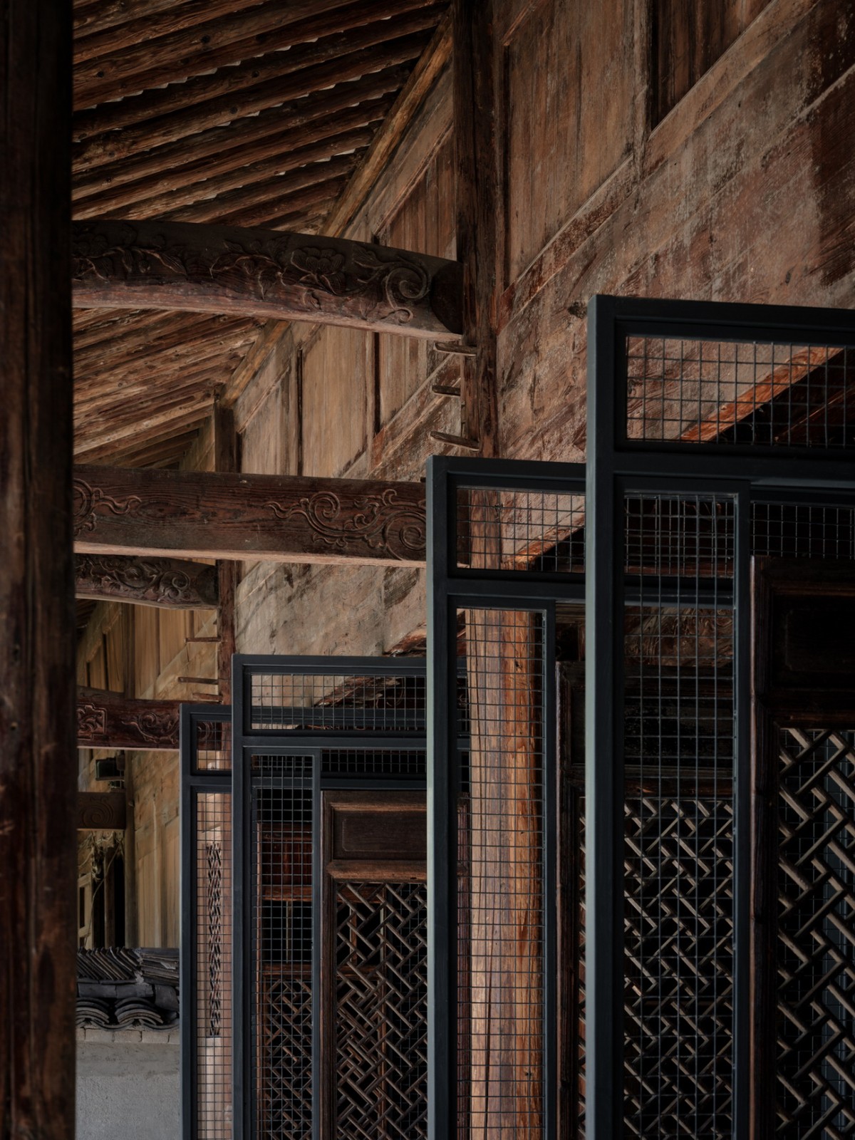 经过完整的测绘和结构安全性检测后,古民居的主体梁架结构在完成除虫处理后原地保留。大量破损的二层地板、屋顶檩条、夯土山墙、屋瓦等按照设计团队的要求使用了原始的工艺和材料进行了恢复性修缮。建筑中精美的窗棂、壁画、墀头以及雕花梁,作为在地营建传统和文化符号的代表,被完整保存用于欣赏。