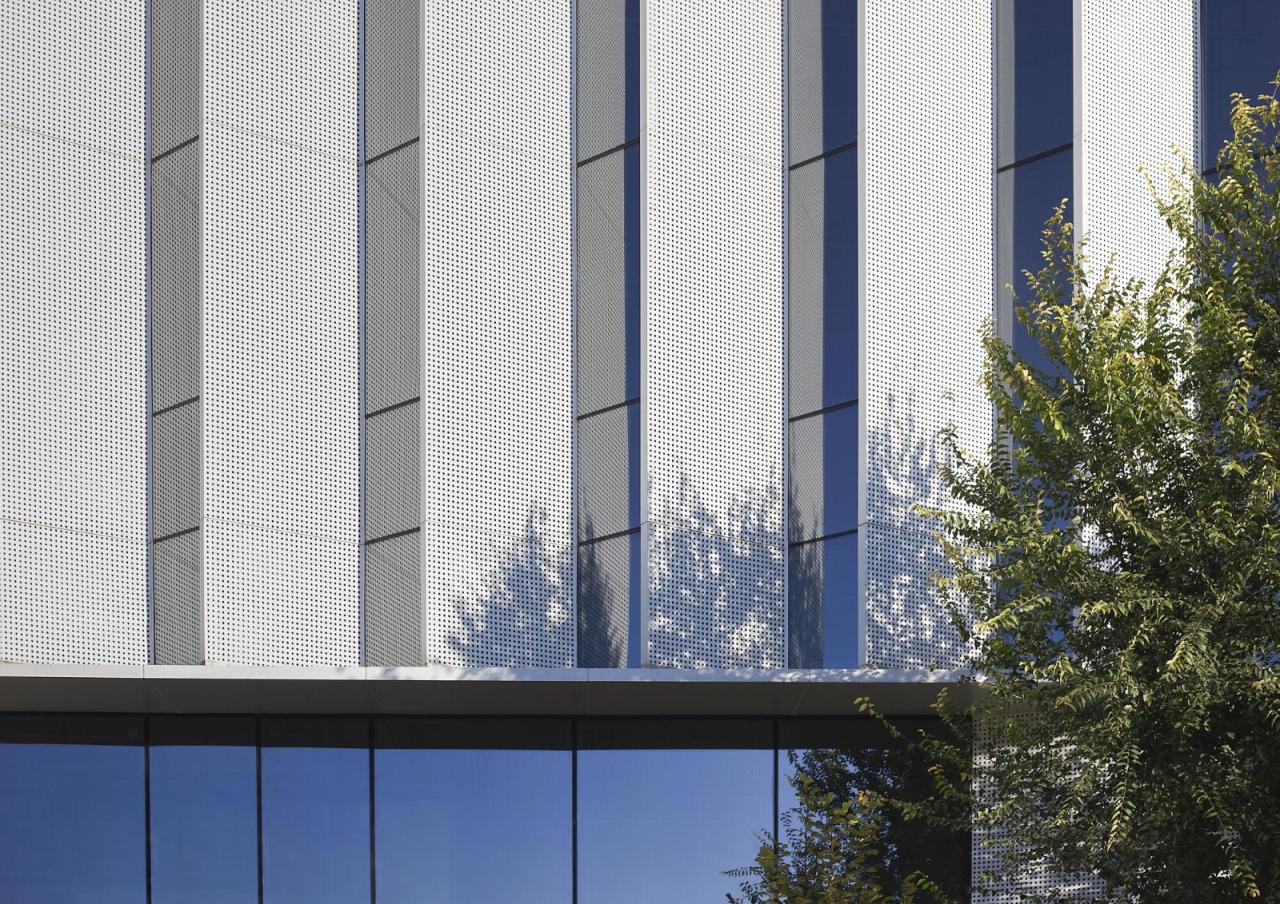 水平方向上,在四层位置,正好是叠拼上下单元相接的楼层设置公共平台层,每个单元在本层设置办公、会议和展示空间等非生产空间,外部平台空间承载了串联所有楼栋的活力连廊。“手拉手”的连接方式,将与功能契合的室内外公共空间在立体空间中贯通,每个楼栋都是整体空间系统不可分割的一部分,形成巨构体系。设计结合建筑的功能特点,赋予不同类型建筑立面及企业单元以个体特征,同时结合园区内外场地差异,体现内外有别。园区外部临主要街道立面采用竖向折板式语言,从综合服务中心到标准化生产车间,由曲线至直线,运用不同角度的冲孔金属板,突出了沿街立面的整体性和韵律感。
