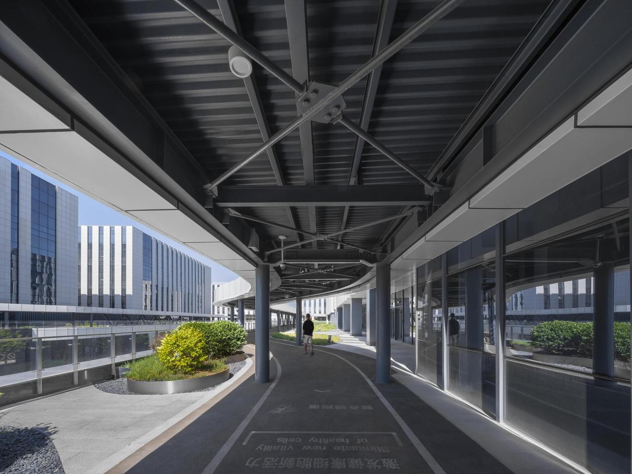 介入的主要手段是通过设置一条环绕在场地上空的“活力环廊”,串联了各单体建筑,连接了多个公共功能空间。环廊中布置一条跑道,起始于园区展示中心的共享空间,在空中将7栋标准化生产车间进行联系,连廊旁边设置了咖啡厅、茶室、活动室等休闲交流空间。“活力环廊”水平形成空中回路,竖向通过公共交通可延伸至下沉庭院、地面广场和屋顶平台。这一高低错落自由漫步的空中曲线通廊,在园区空中形成了灵动而有节奏的洄游空间。