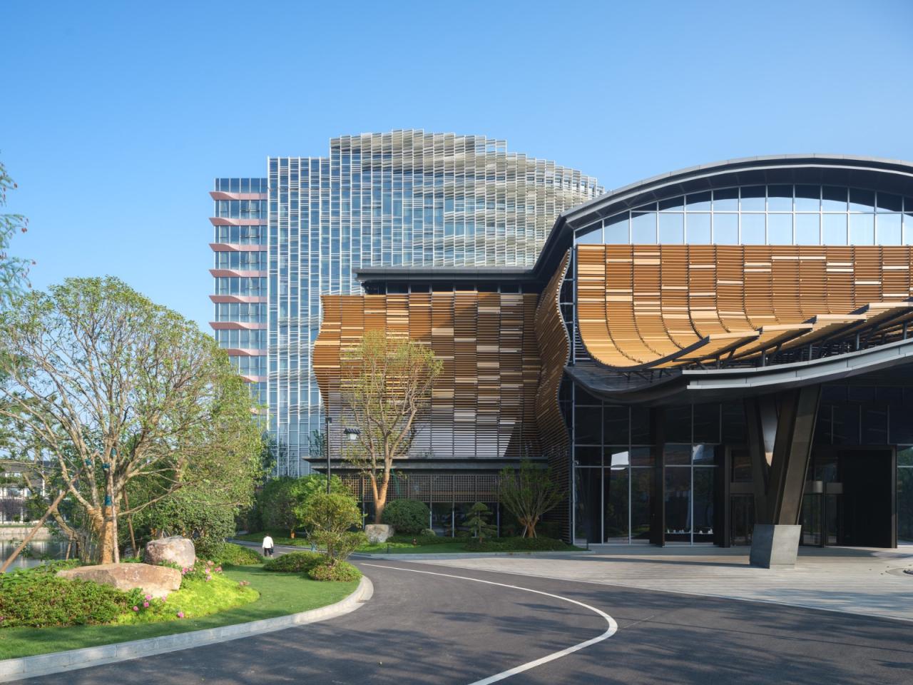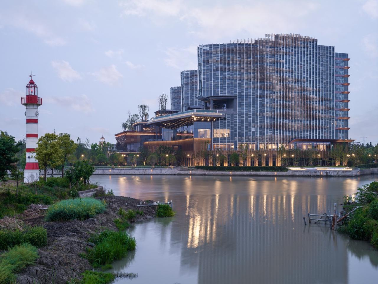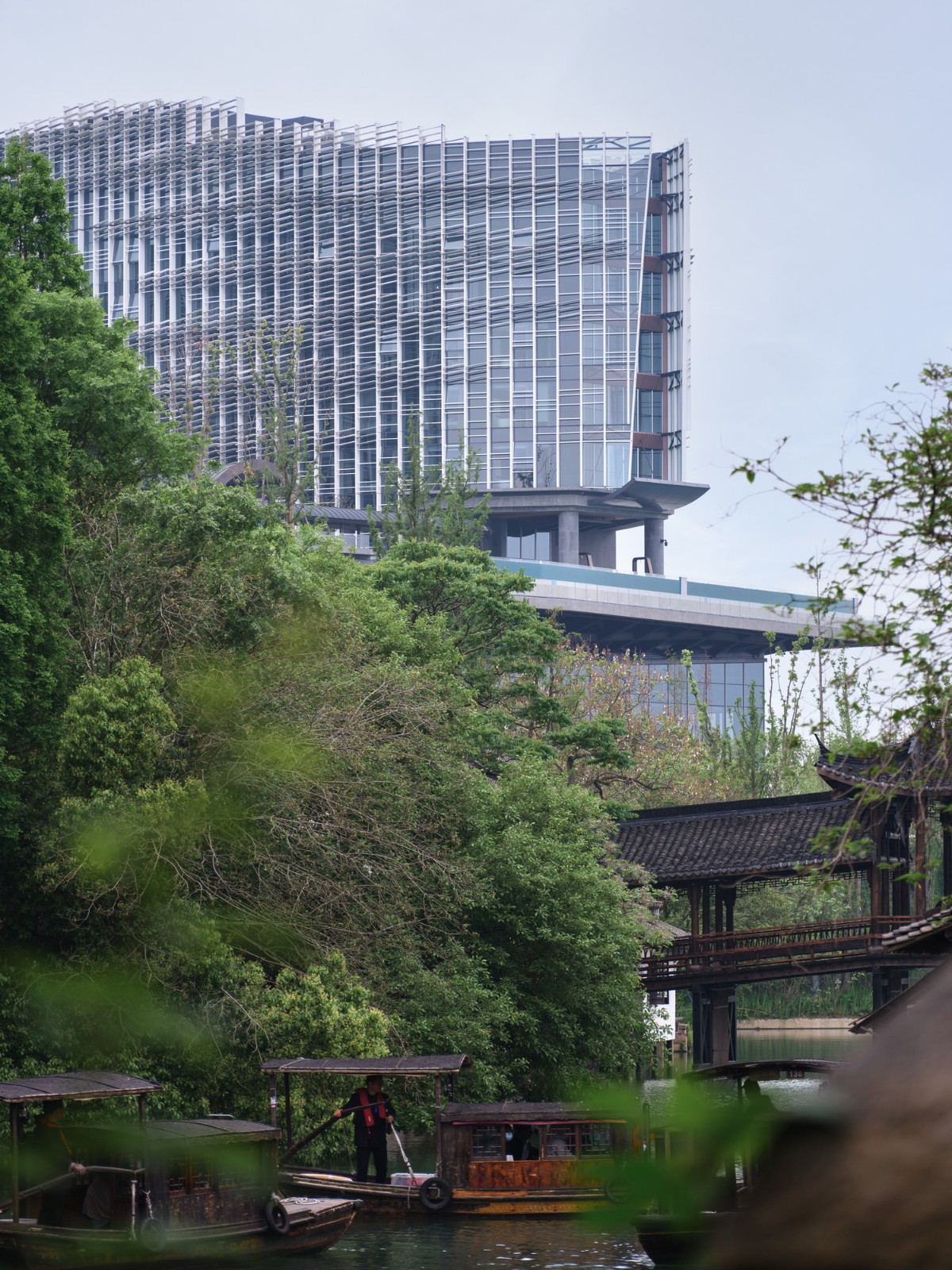 乌镇堤上酒店毗邻京杭大运河,坐落于“中国最后的枕水人家”乌镇风景区西北角。酒店是景区内体量最大的酒店,包含了 493 间客房及各类餐饮、康体功能空间。项目外立面以陆上行舟,卧枕堤上为设计概念,犹如一艘三桅船帆停靠在港湾。