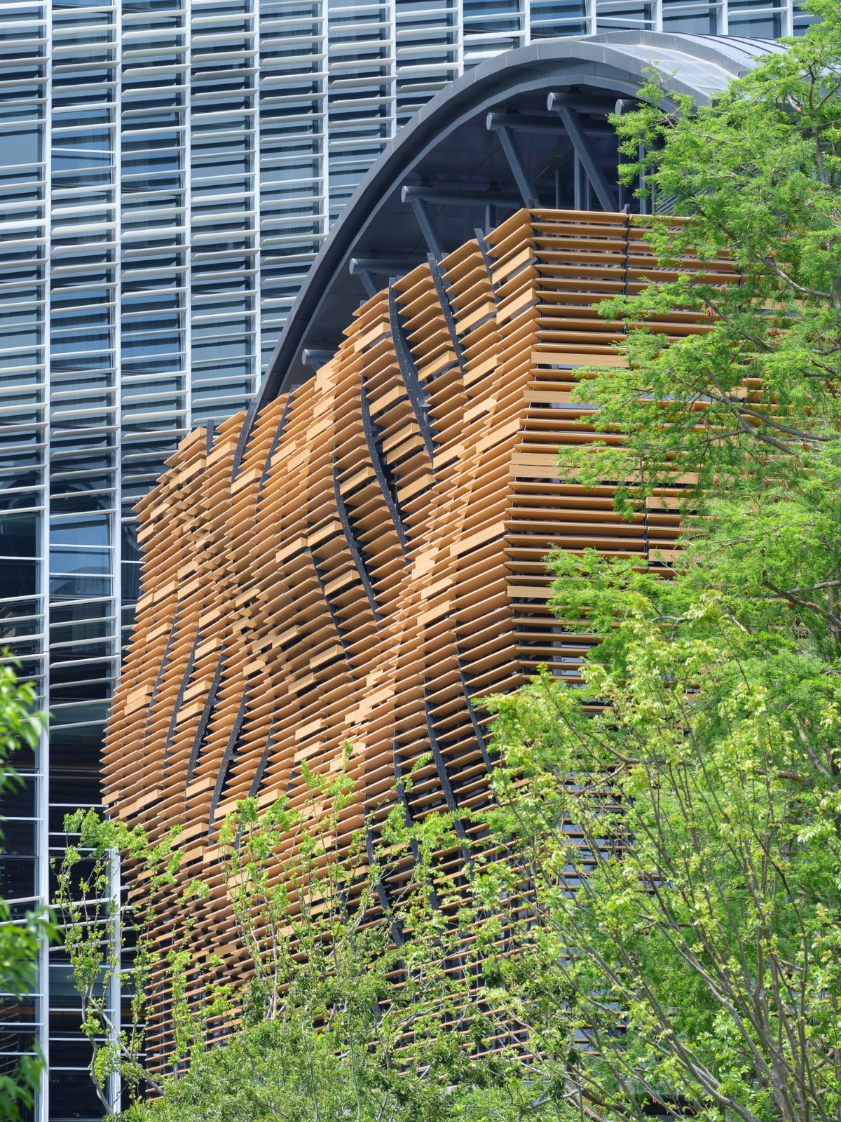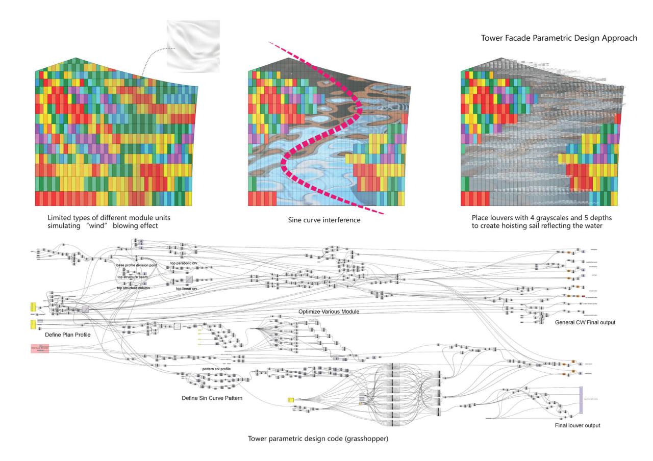 项目外立面创造性的将中国传统元素和现代的材料及建造技术结合在一起。裙楼外立面上的竹纹遮阳铝板起伏蜿蜒犹如水浪怕打船身激起的涟漪。塔楼覆上遮阳板后正似升起的风帆,行将远航,同时通过微妙的颜色和深度变化营造出阳光下帆面的星星点点、光影变幻。傍晚通过外立面泛光照明的设计更是反映出渔火人家,孤帆远影的诗意场景。
