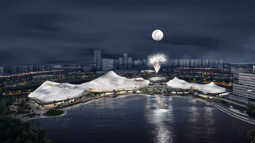 这个综合用途的南海艺术中心占地121275平方米,将分为三栋建筑,包括剧院、博物馆和体育中心。它被马岩松工作室设计为通往海滨的“公共门户”,也是佛山和广州市民的文化场所。
