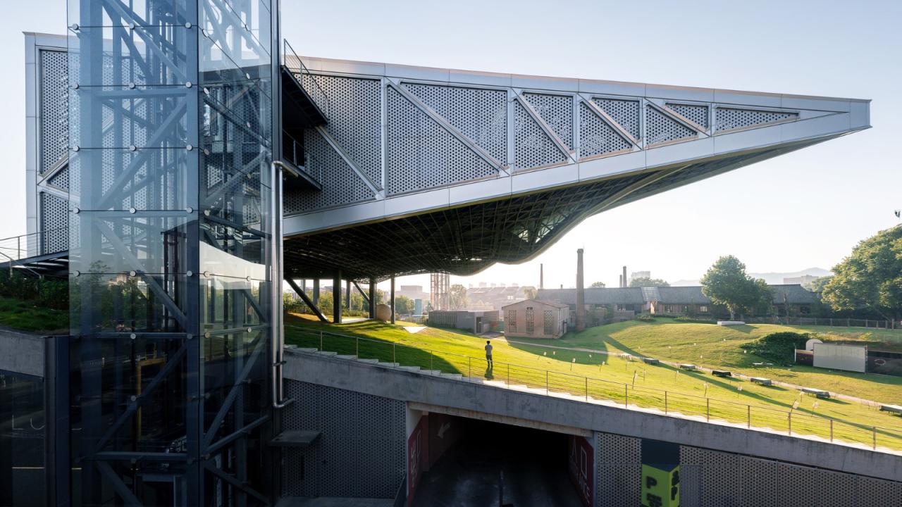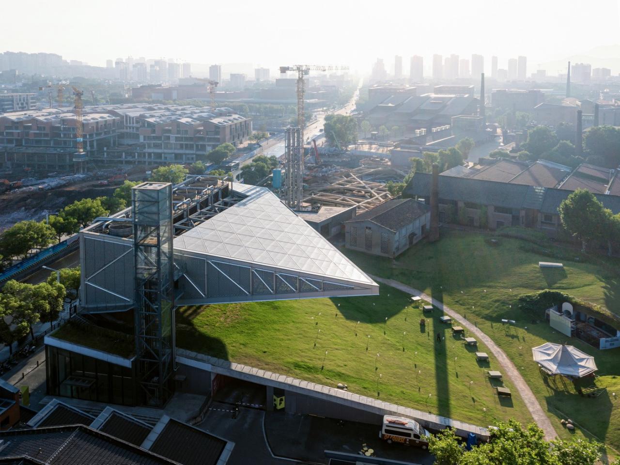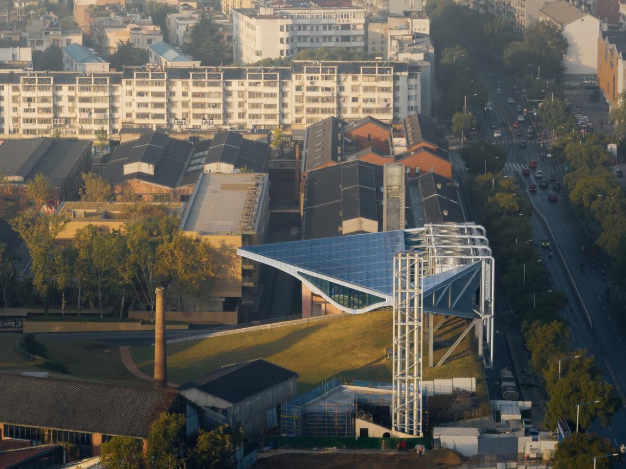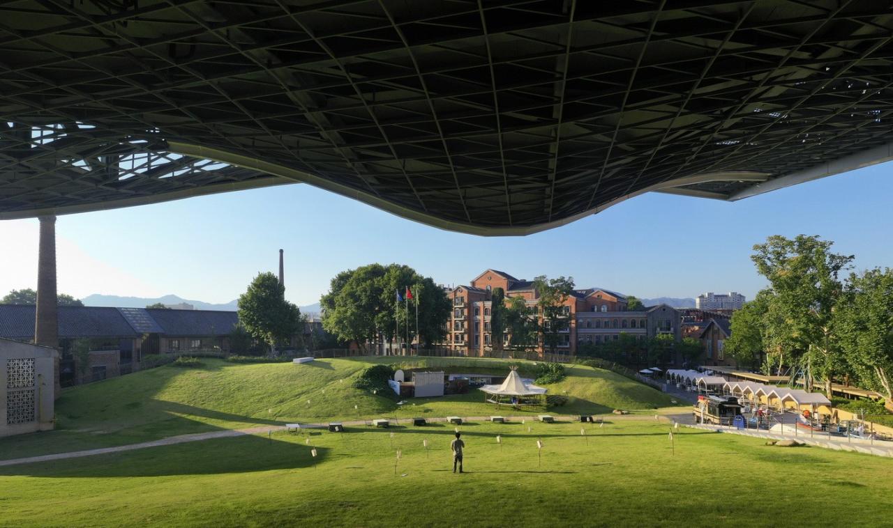 环境共融。作为陶溪川建筑群像之一,“云引擎”和而不同,与周边有紧密的关系。在“云引擎”设计方案初成时,场地西侧的景仰书院的设计也开始启动了。我在一次会议上看到了董功老师静谧的庭院效果图,忽然一惊。因为如果在这岁月静好的庭院里看见这一座探出头的金属机械,那可就不妙了。所以我们将整个建筑体型再向北边平移,并调整了建筑体型切入角度,确保从景仰书院的庭院之中刚好看不到“云引擎”探出头来。这个调整后的平面锐角也加强了建筑透视的张力效果。在现场南侧国贸酒店的大堂处,我们也协同景观起坡做了相似的视觉控制,将“云引擎”的戏剧张力约束这青青草地的范围之内,消隐在周边建筑其各自小宇宙之外。