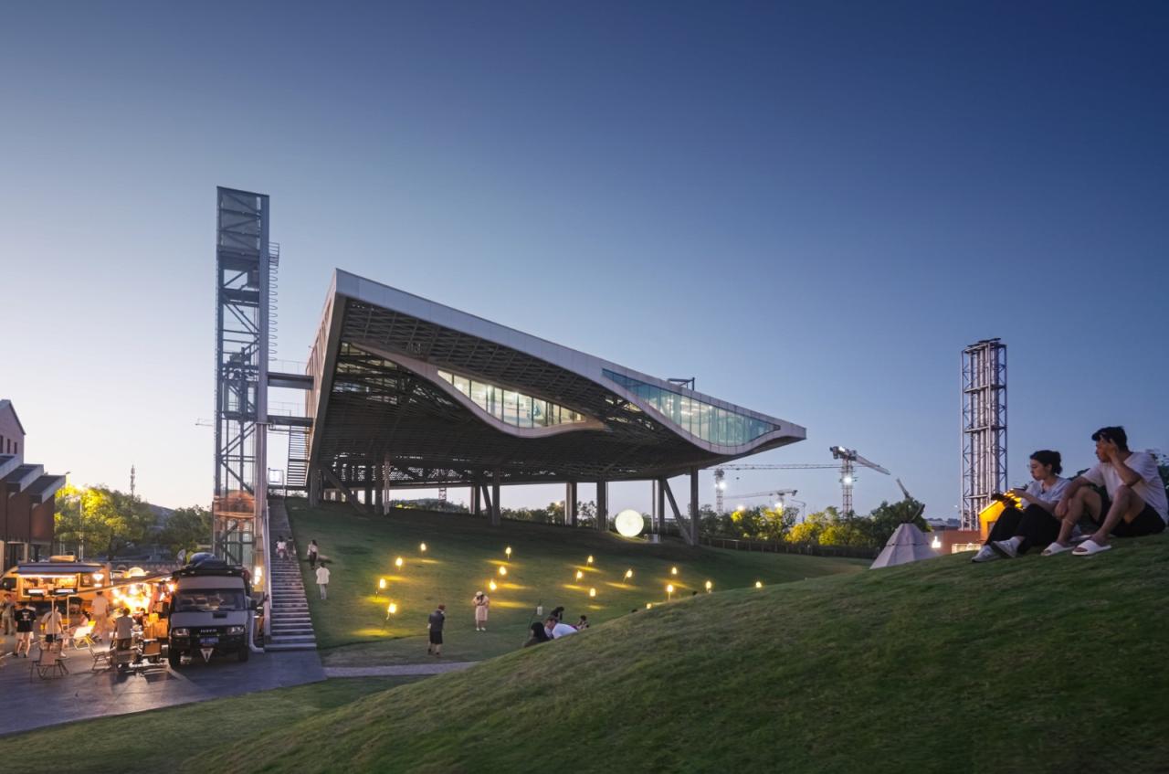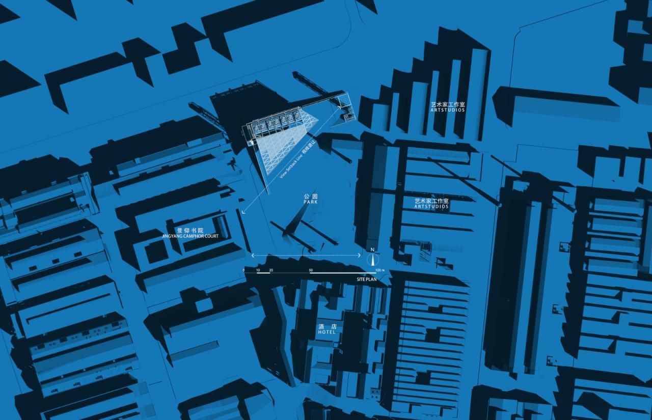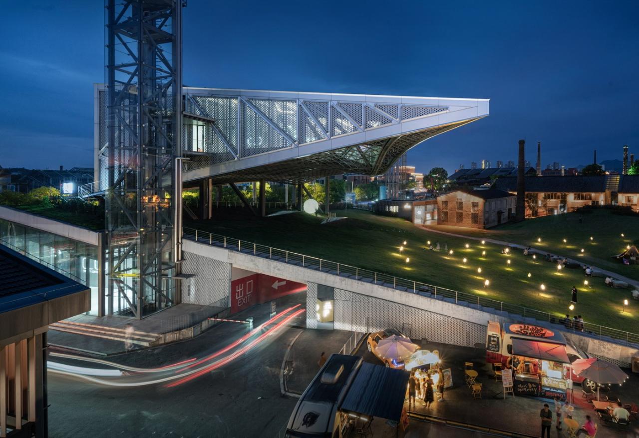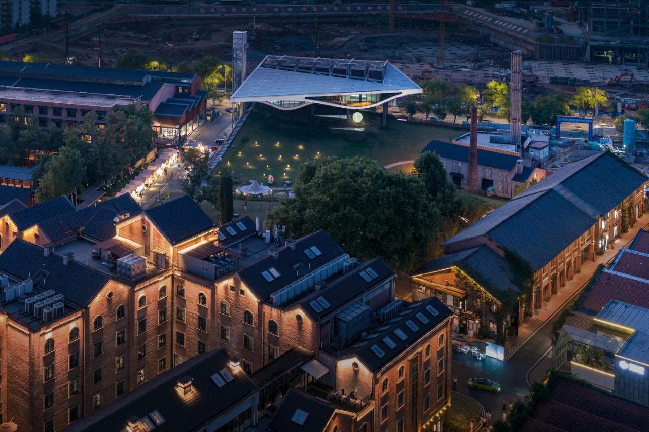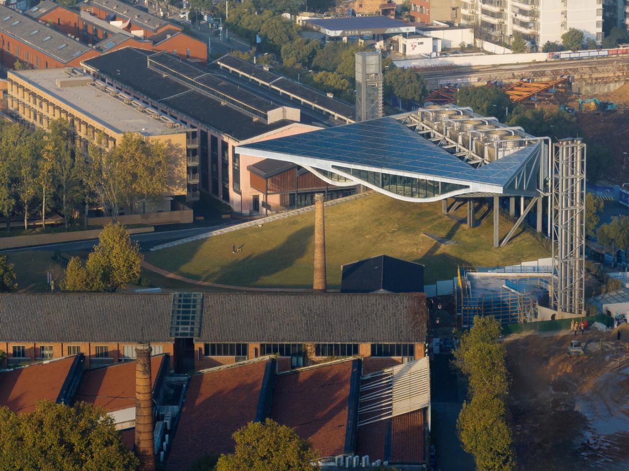 环境共融。作为陶溪川建筑群像之一,“云引擎”和而不同,与周边有紧密的关系。在“云引擎”设计方案初成时,场地西侧的景仰书院的设计也开始启动了。我在一次会议上看到了董功老师静谧的庭院效果图,忽然一惊。因为如果在这岁月静好的庭院里看见这一座探出头的金属机械,那可就不妙了。所以我们将整个建筑体型再向北边平移,并调整了建筑体型切入角度,确保从景仰书院的庭院之中刚好看不到“云引擎”探出头来。这个调整后的平面锐角也加强了建筑透视的张力效果。在现场南侧国贸酒店的大堂处,我们也协同景观起坡做了相似的视觉控制,将“云引擎”的戏剧张力约束这青青草地的范围之内,消隐在周边建筑其各自小宇宙之外。