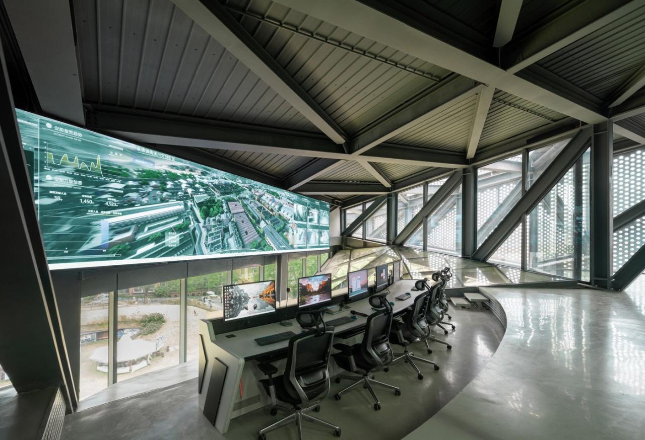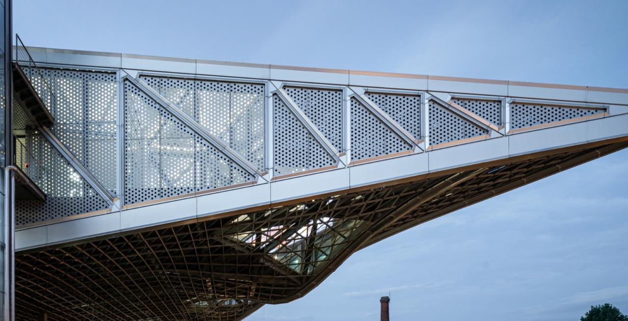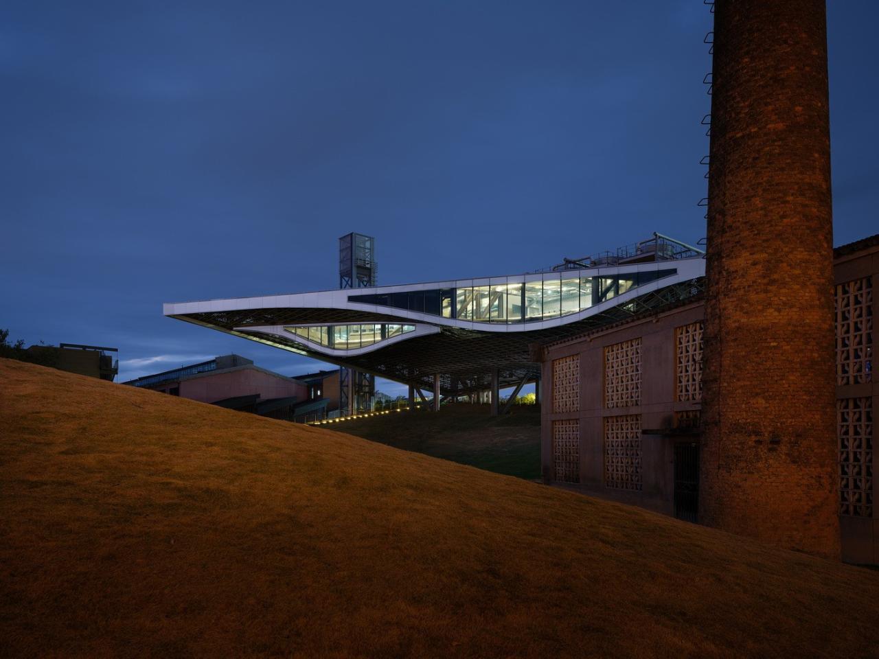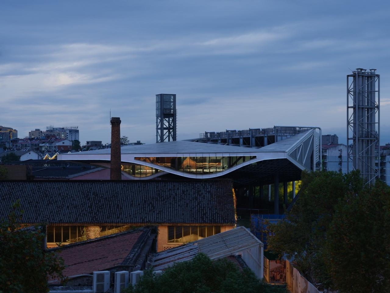 环境共融。作为陶溪川建筑群像之一,“云引擎”和而不同,与周边有紧密的关系。在“云引擎”设计方案初成时,场地西侧的景仰书院的设计也开始启动了。我在一次会议上看到了董功老师静谧的庭院效果图,忽然一惊。因为如果在这岁月静好的庭院里看见这一座探出头的金属机械,那可就不妙了。所以我们将整个建筑体型再向北边平移,并调整了建筑体型切入角度,确保从景仰书院的庭院之中刚好看不到“云引擎”探出头来。这个调整后的平面锐角也加强了建筑透视的张力效果。在现场南侧国贸酒店的大堂处,我们也协同景观起坡做了相似的视觉控制,将“云引擎”的戏剧张力约束这青青草地的范围之内,消隐在周边建筑其各自小宇宙之外。