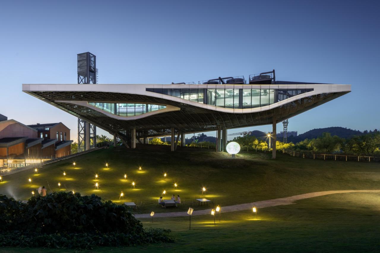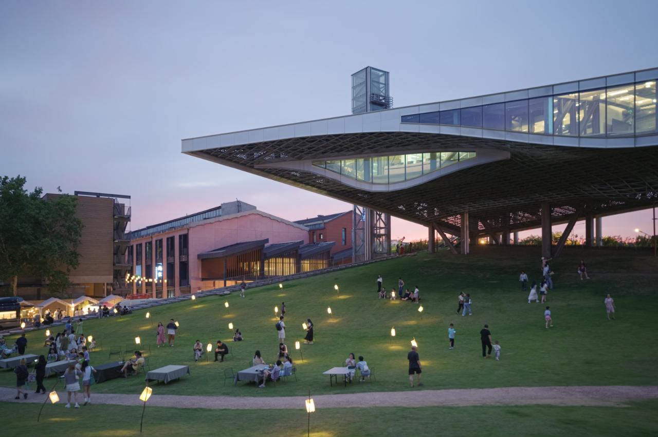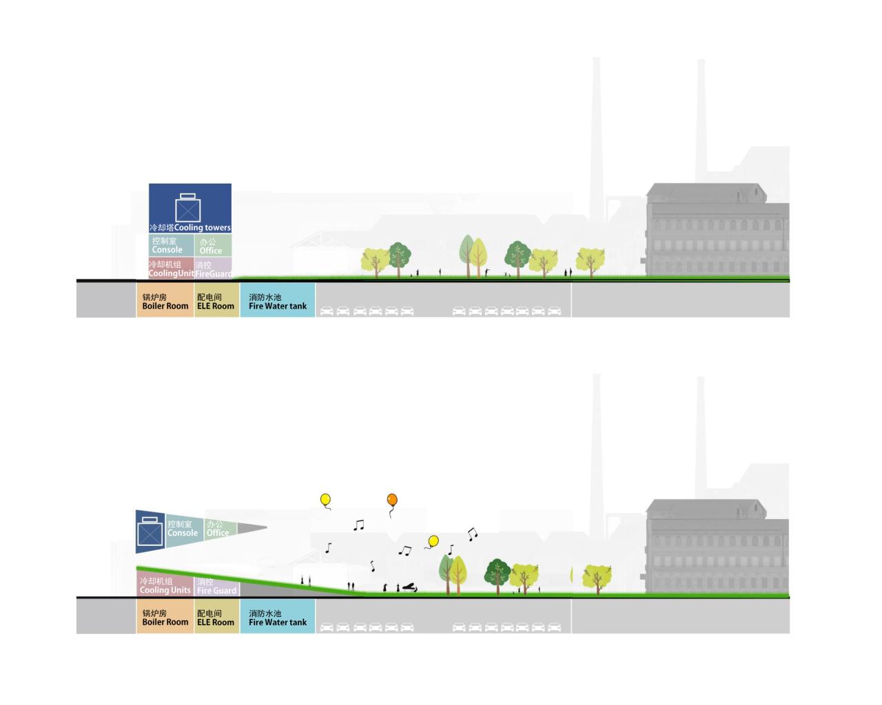 我们将建筑体量一分为二:冷却机组、配电、锅炉间和消防水池埋在地下与绿地连接成草坡,就像将草地向上撕开一角;而冷却塔、控制中心悬浮于空中,建筑体量根据所需空间大小排列,成楔形。尽管建筑内部不对公众开放,但通过两个体块的切分,建筑所占用的公园面积又还给了公众,公园总面积不被减少。在炎炎夏日,这个巨大的“遮阳棚”下是非常舒适的乘凉灰空间,也是草地上各种活动的看台。