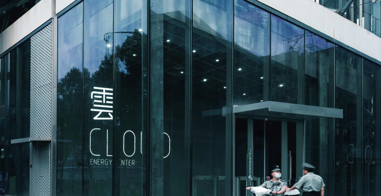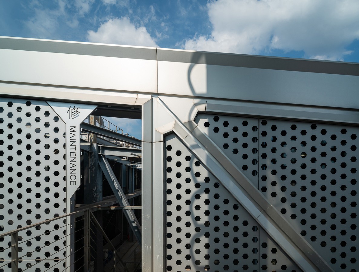 在“云引擎”的设计中,我们希望将设备之美率真地展现出来,与建筑融为一体,呈现整体的机械感。在立面的细节里,我们用中英文真实标注了其功能:例如在冷水管上标注“冷”,在检修通道刻写“修”,建筑细部如同设备操作说明书。