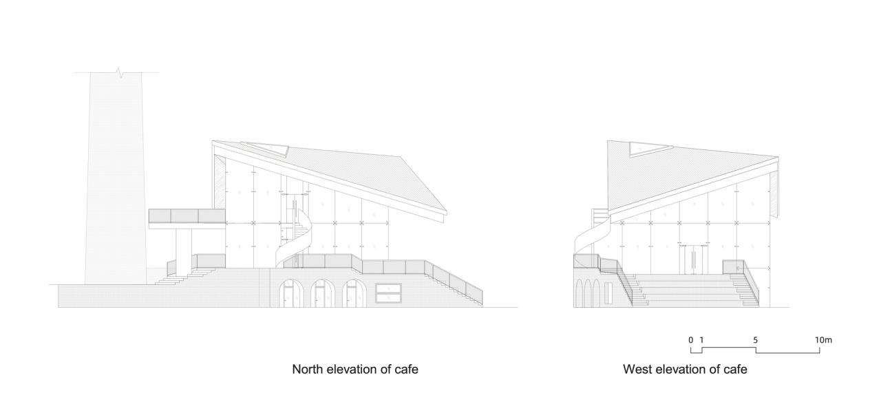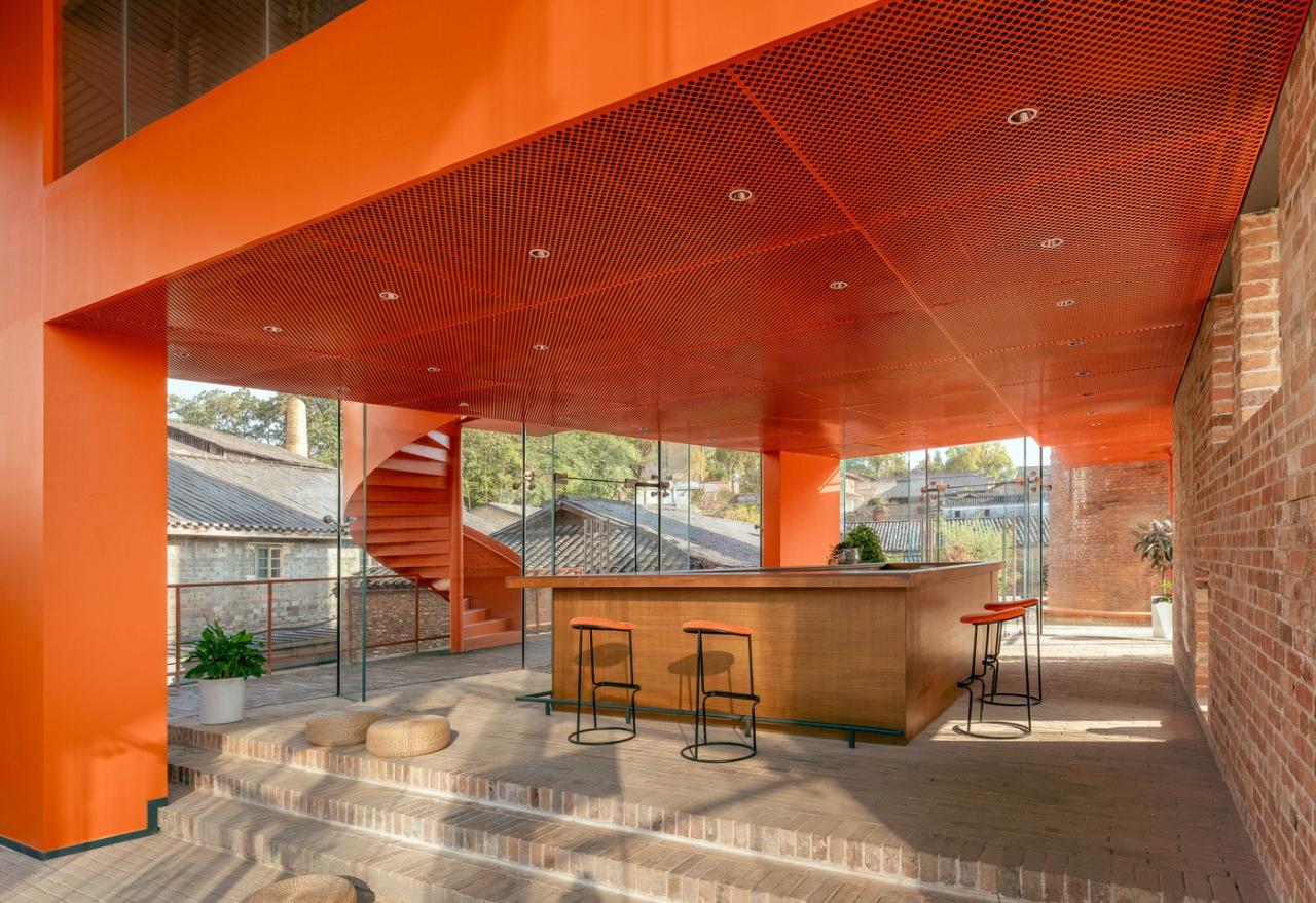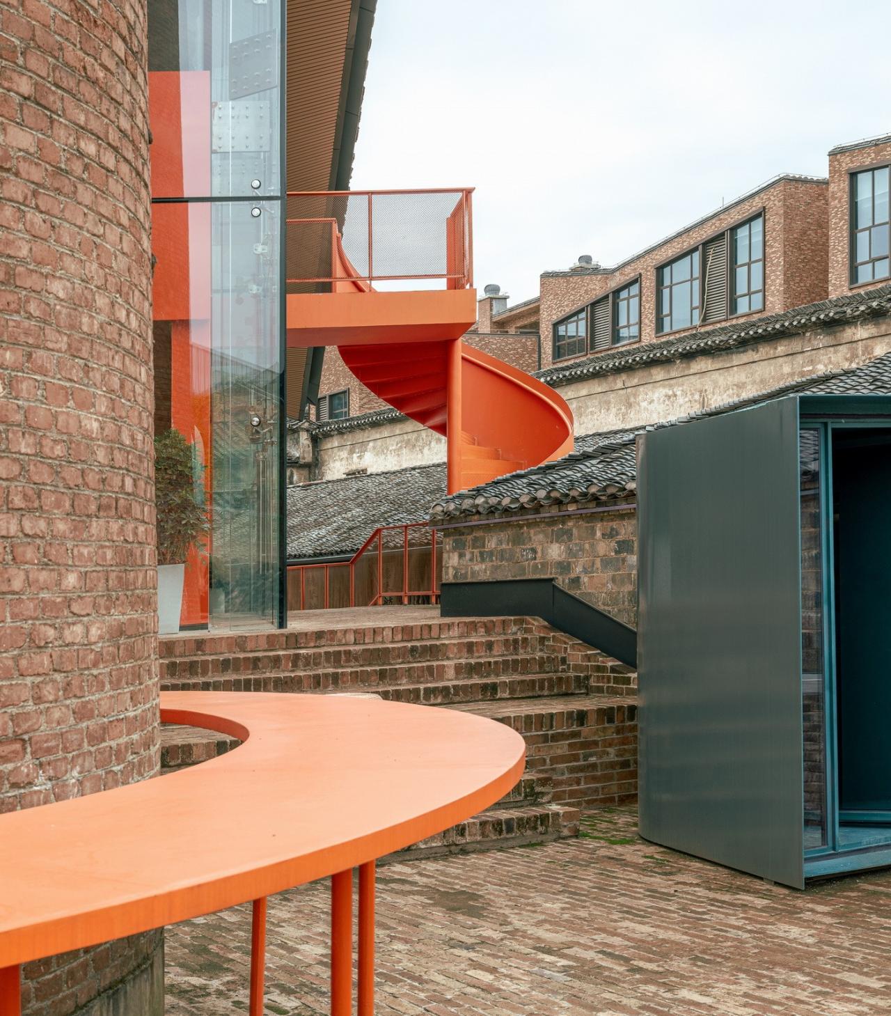 咖啡厅地下一层为砖砌基座,落位于原有建筑基底之上,延续了原有的空间肌理。基座采用砖拱立面和大台阶的做法,是烟筒广场向内院的延伸。同时二层的橙色夹层往烟囱延伸形成室外平台,完成了新建建筑与现有场地完整的锚固。该设计巧妙的融合了新旧元素,在尊重历史环境的同时创造了一个独特而现代的空间地标。