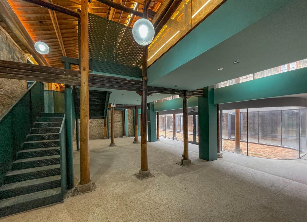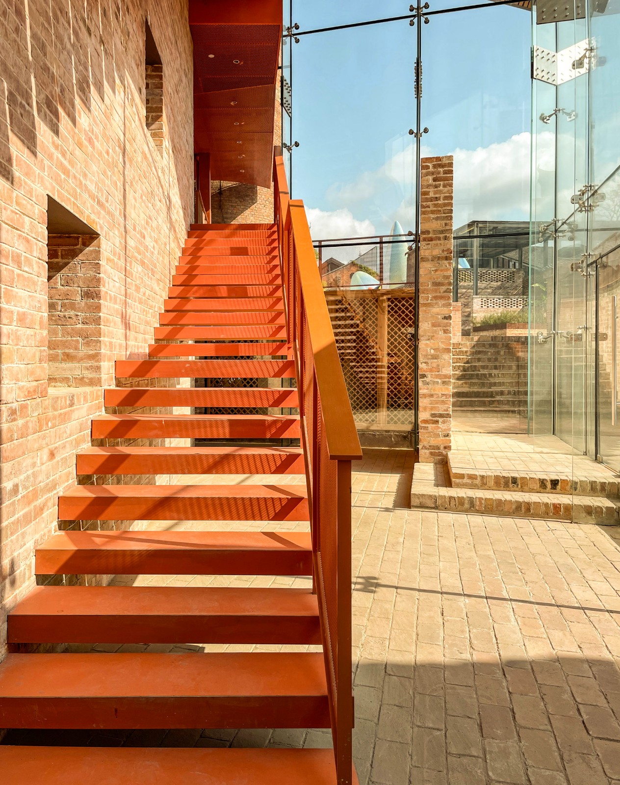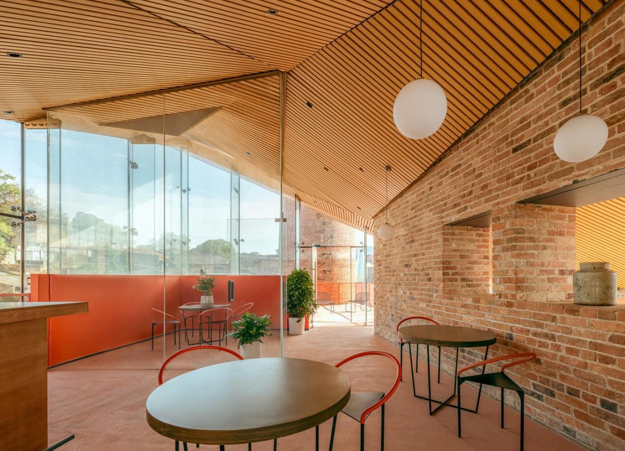 咖啡厅地下一层为砖砌基座,落位于原有建筑基底之上,延续了原有的空间肌理。基座采用砖拱立面和大台阶的做法,是烟筒广场向内院的延伸。同时二层的橙色夹层往烟囱延伸形成室外平台,完成了新建建筑与现有场地完整的锚固。该设计巧妙的融合了新旧元素,在尊重历史环境的同时创造了一个独特而现代的空间地标。