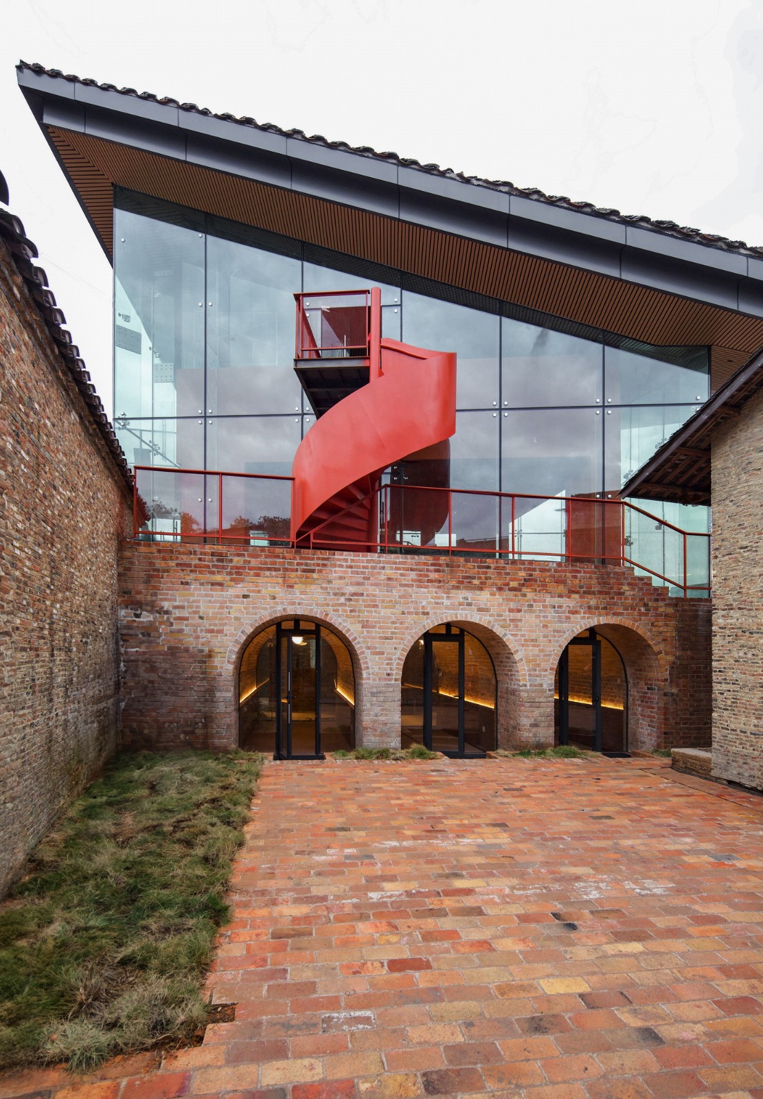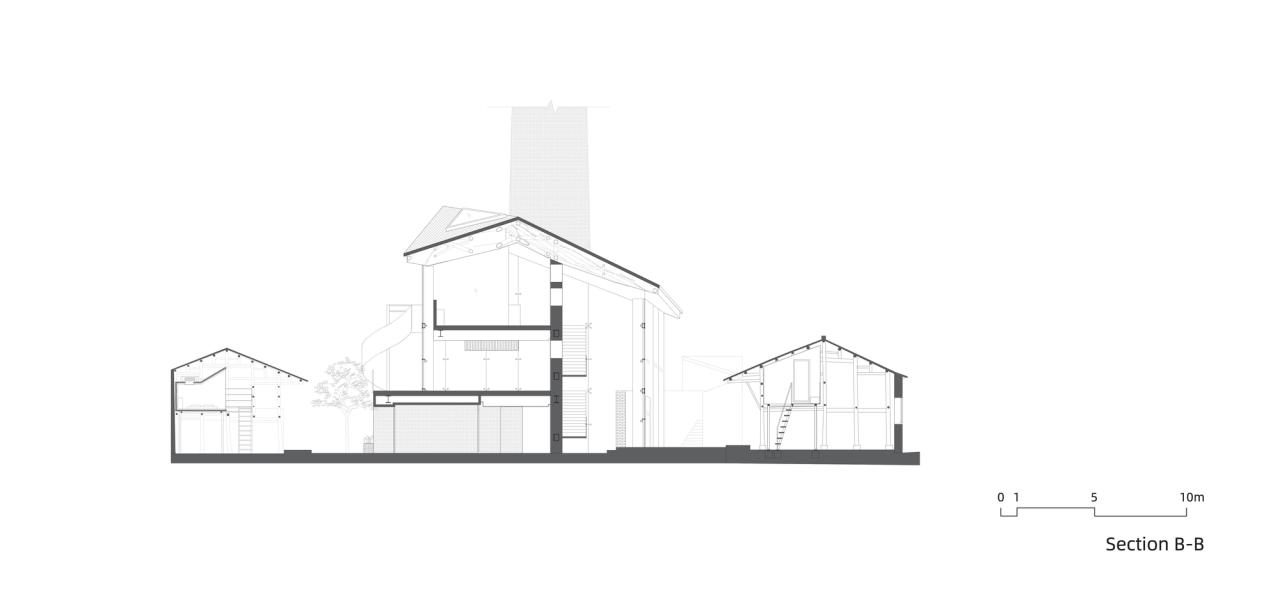 院落改造的插建最重要的是烟筒咖啡厅的置入。一座三层的双坡顶玻璃建筑,包含展览和咖啡空间,在形成标志性的同时,与周边历史环境无缝融合,成为公共空间的重要锚点。玻璃外立面的透明性彰显了一种开放性,与周边坚固的传统砖墙建筑形成鲜明的对比。对角双坡的屋顶采用传统青瓦做法,犹如漂浮的大伞一般。屋顶之下的透明空间,连接了院落内外,是烟筒广场公共空间的一种积极延展。