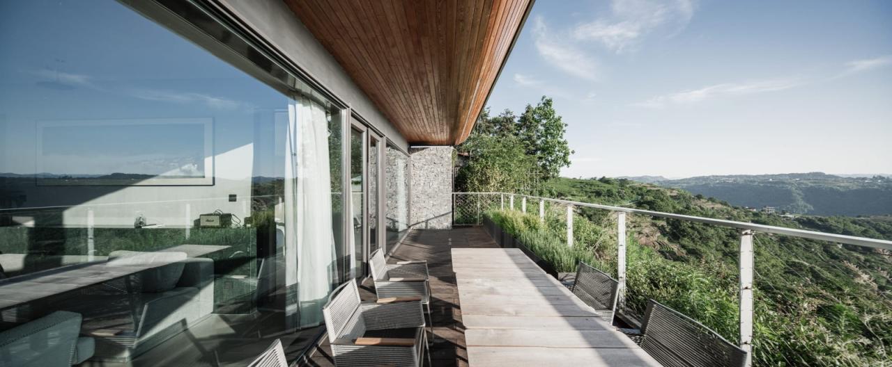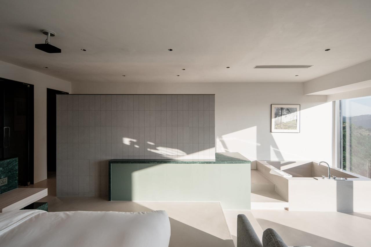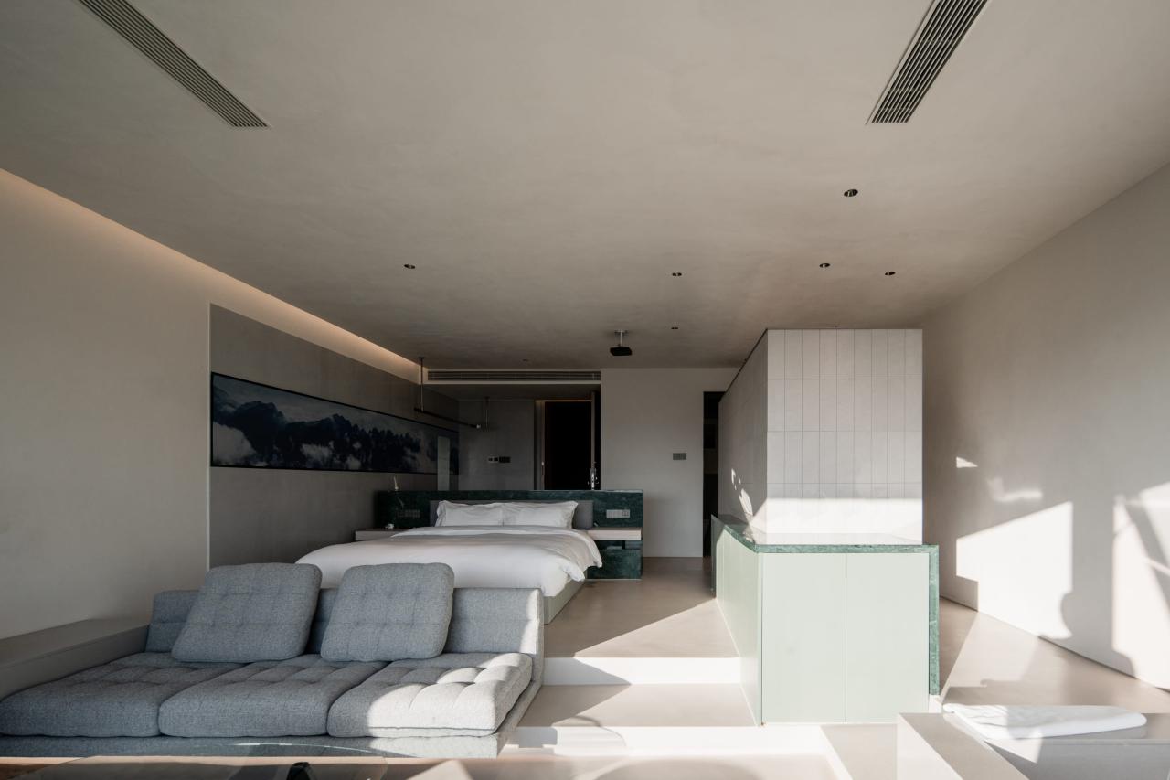 室内设计最大化外部风景的观赏体验,由场地特征提取出来的“翠绿”与“云雾”提炼转换为室内空间与材质的语言,由自然山野强调空间享受。谦和低调的用色与软装,营造人与自然相处的平和心境——“云行不自知,树静谢风迟。行至路穷处,恰是观景时”。