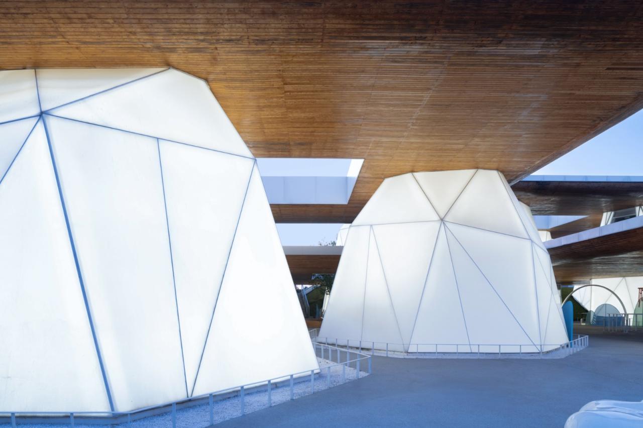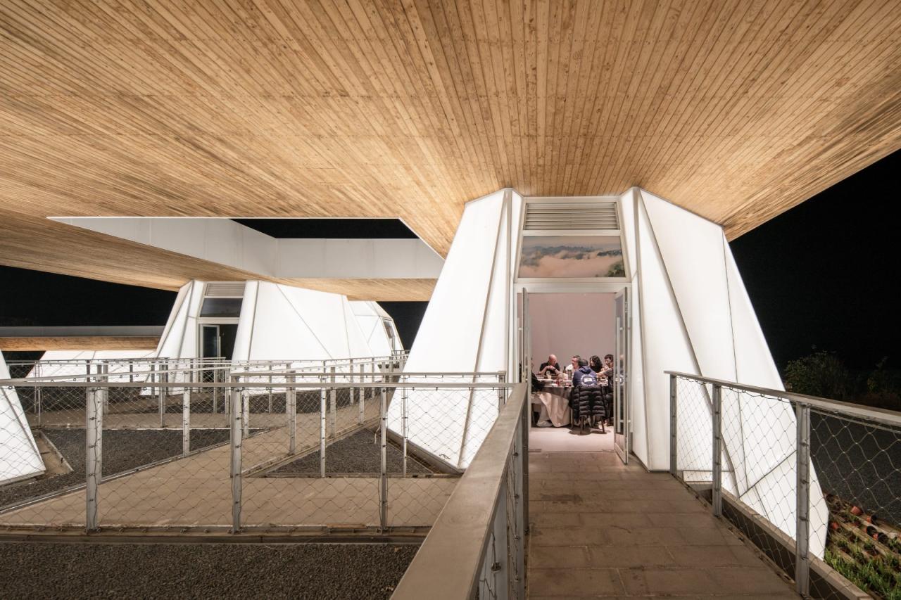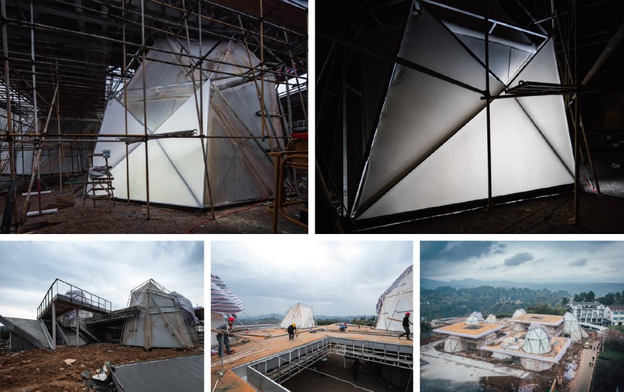 钢框架结构的所有主要构件均在工厂预制完成,通过装配式的构件精度,减少了现场施工的耗时,并削弱对周边村民和环境的干扰及影响。云峰外表面的膜材在通过多种的耐候性、透光性、防火性试验后,最终选择了PTFE膜材,其质地轻便、易于运输和安装,而在工厂裁剪成所需形状后,可以快速在现场安装固定。