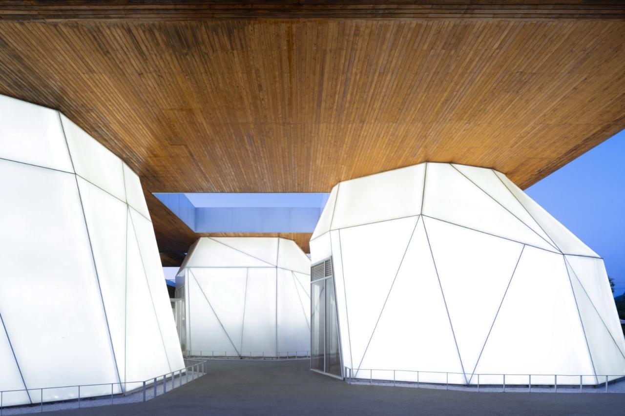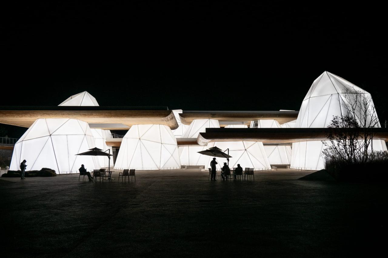 建筑的结构选材出于其不规则形体、环境抗性、施工便捷等多方面的考虑。云峰的非标形体采用钢结构主体覆半透明性材料PTFE,以雕塑感的形式,在自然光下呈现出柔和的半磨砂质地。而膜下均匀排布LED灯带,透过PTFE膜在光线作用下产生半透明的朦胧效果,使建筑成为自发光体,为入夜后的各种活动提供自然均匀的光环境,也使整个建筑在夜间成为过往冷清乡村中的一个活力地标。