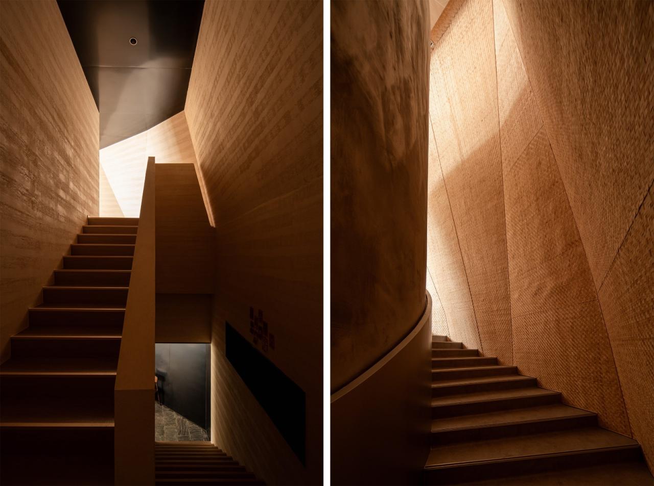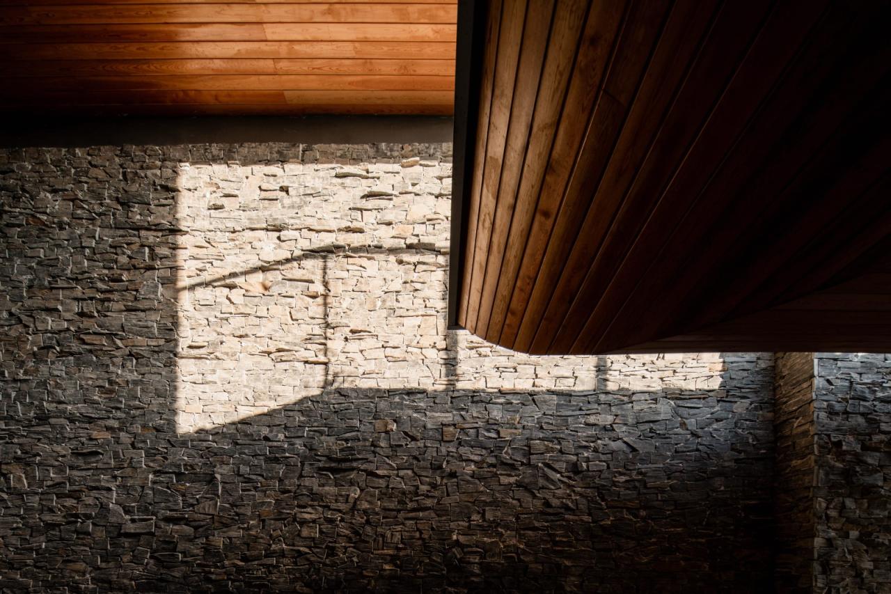 下观景台进一步向外拓展,作为屋面向下跌落新的片状平台,并由此生成新的建筑体量。民宿建筑采用了与云峰不同的材料语言,以本地出产的天然毛石和深色烧杉板为主,将建筑体量完全隐匿于山体中。