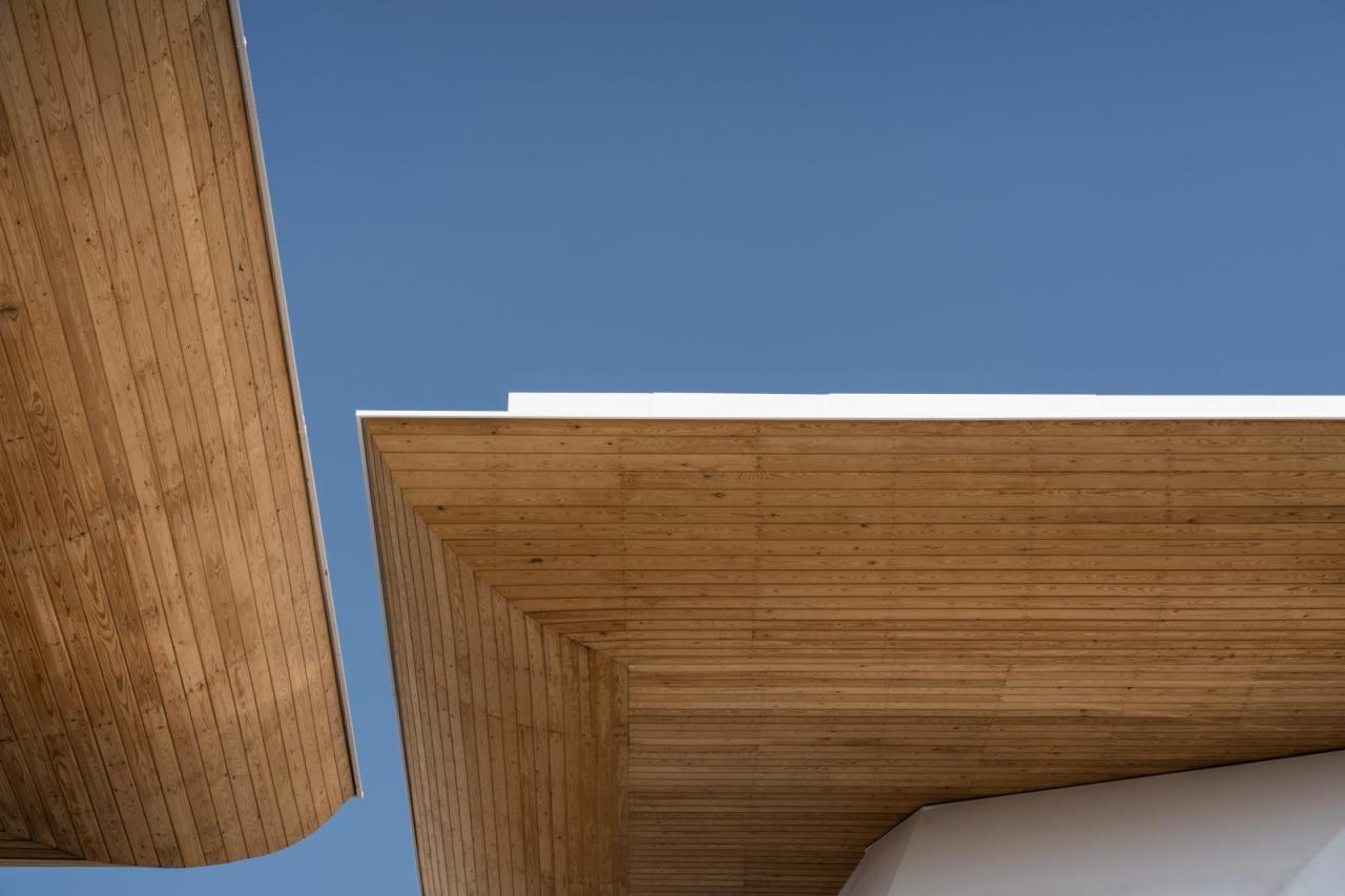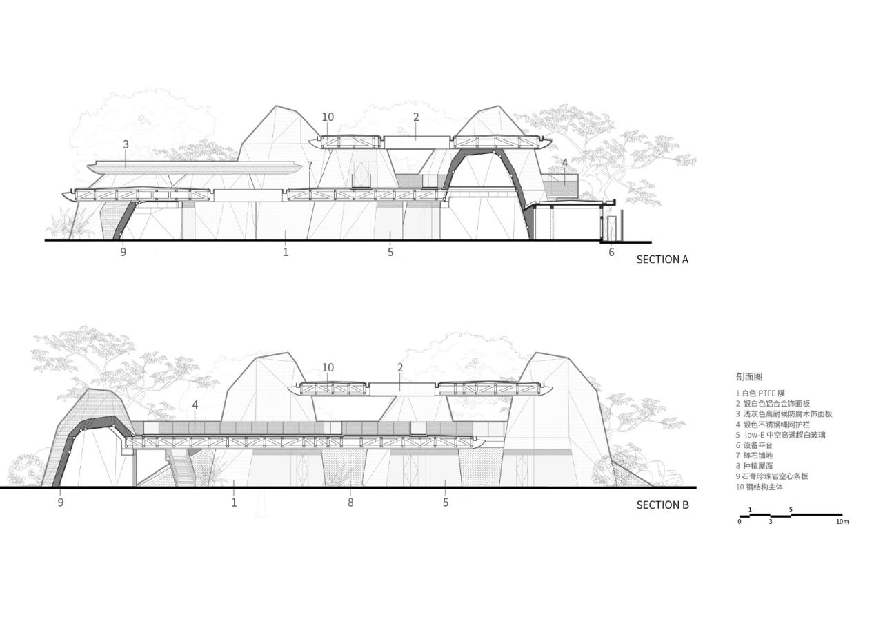大屋顶下表面则采用原木色碳化防腐松木板,为近人尺度增添温暖质朴的视觉质感。大屋顶上部则以金属屋面作为基层,并根据是否上人的需求,分别设置了以砾石作为保护层的上人屋面和采用单元式泡沫种植模块的非上人植草屋面,既减小了屋面构造厚度和荷载,同时也营造出云上草甸的观赏效果。