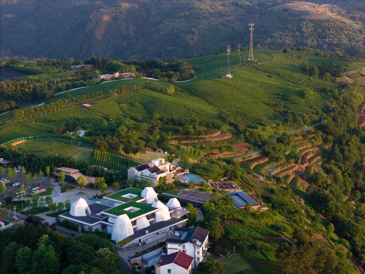 客房均直面悬崖和云海,获取极佳的景观视野。片状的屋面延续了与云峰相同的材料语言,层层跌落的形体关系则依坡就势,与悬崖边的自然茶田相呼应。