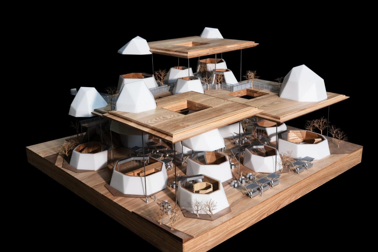 “云峰十二重”建筑单元的原型从户外露营帐篷获得启发,设计上以简洁的几何切削式为其塑形。群组的雕塑感体量仿佛一组十二座高低不同的“飞来”冰峰,也与远处的“十九峰”遥相呼应。