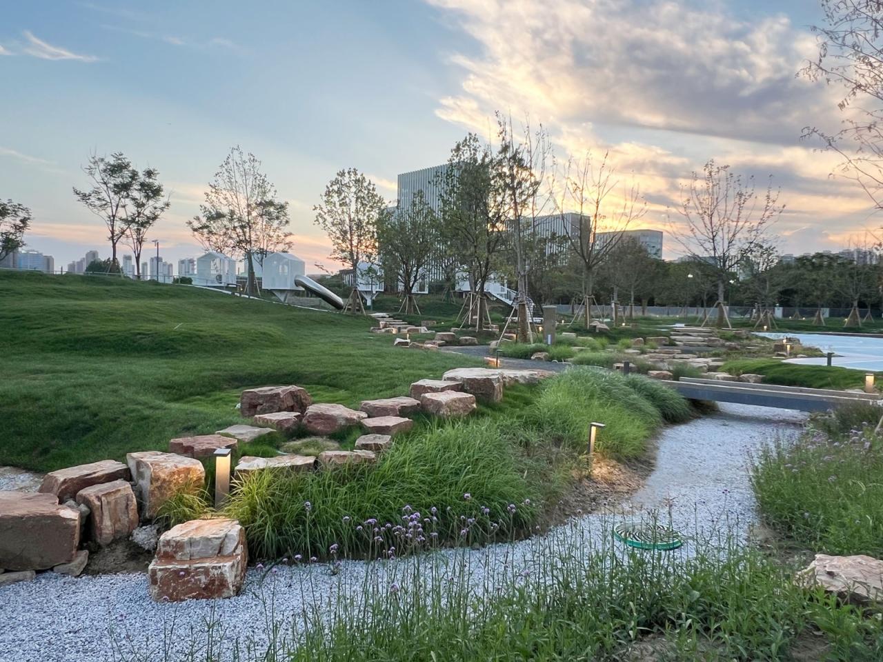 学校的中轴长度达到 550 米,是一条全开放式设计的景观廊道,融入了两端城市天际线。花园、庭院、天桥、地下、平台空间连接了南北两侧的建筑,创造出最具活力和多变的校园公共活动空间。赛道乐园是中轴西端 8000 平方米的无动力乐园,包含运动活力、游乐探索、自然体验三个片区,为学生提供充满吸引力的户外活动空间,让成长在游玩过程中自然发生。地质花园和旱溪栈道融入雨水渗透、收集、再利用等可持续设计。