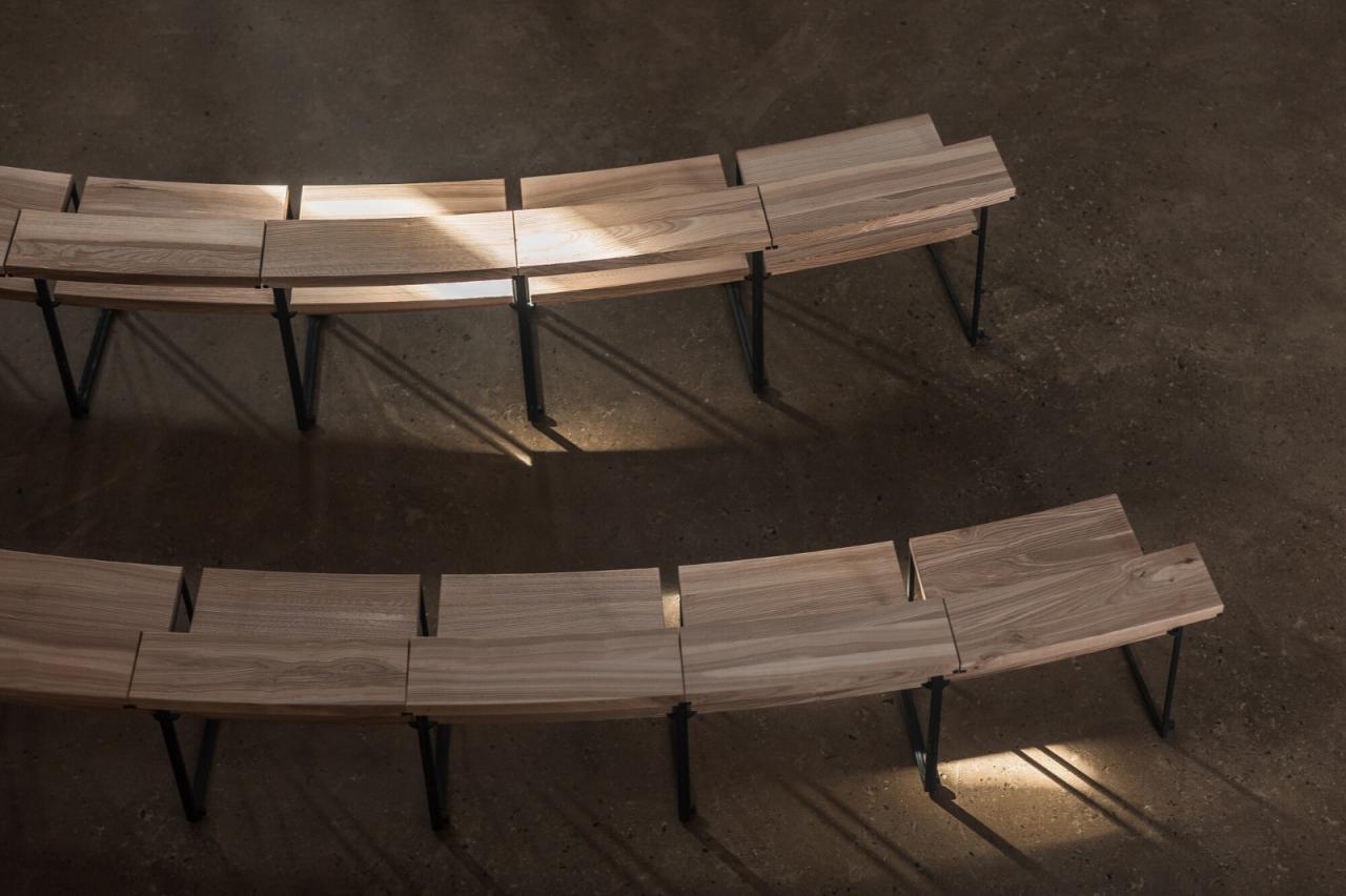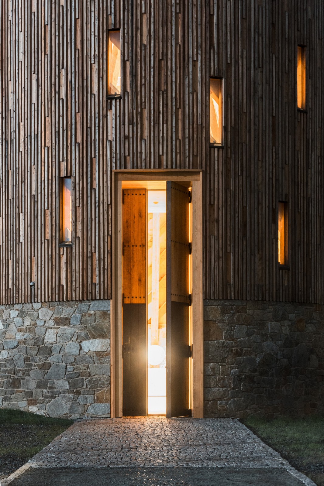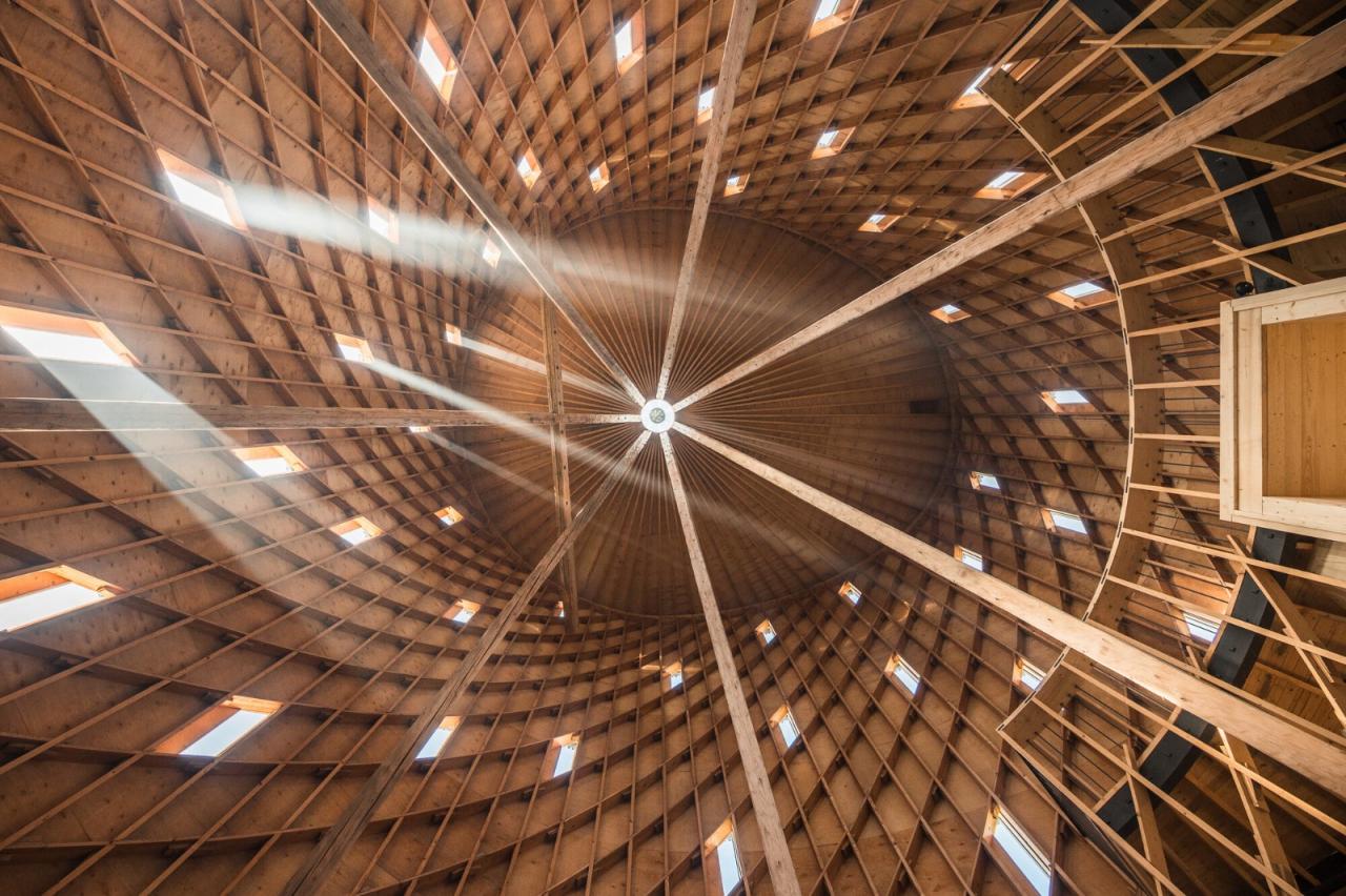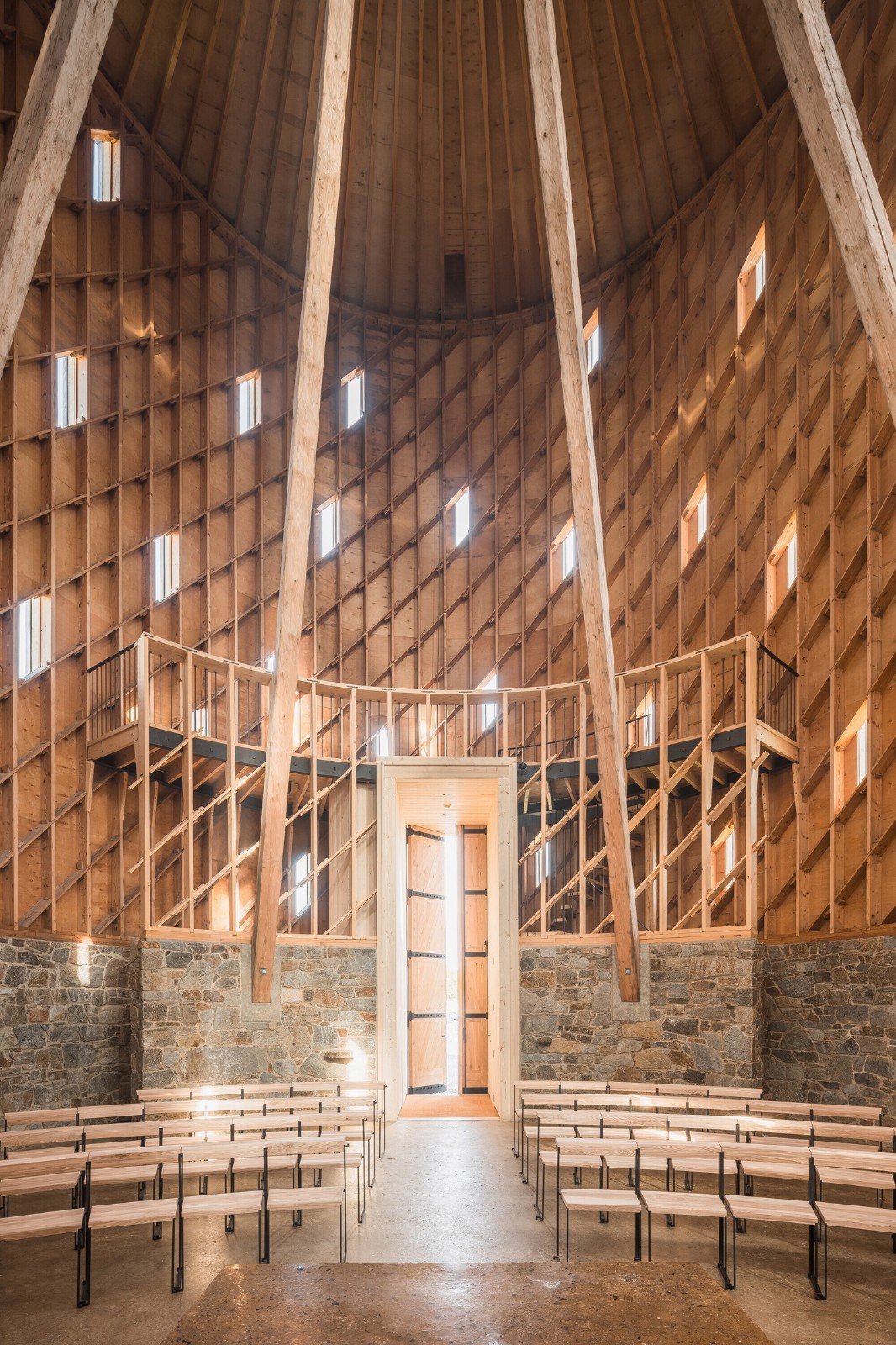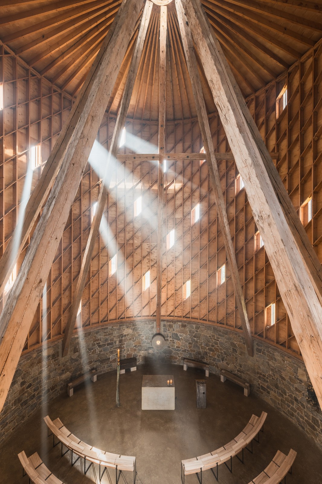 这座建筑将传统与现代很好地融为一体。其建造灵感源于中世纪传统建筑技术,在此基础上,设计团队将其与现代技术相结合。地板由压实、夯实的泥土制成,而墙壁则由采石场的石头制成。由一千个木质元素组成的支撑层状结构采用数控(CNC)铣削工艺制作而成。十五米长的横梁是手工雕刻的。走近教堂,一道五米高的门首先映入眼帘,穿过这道门人们便进入了一个充满活力而又神圣的空间。教堂顶部的横梁和周围的结构将人们的视角不知不觉引向高处。这座教堂超越了时间,置身其中,人们感受到的是光、声音和气味的交织。材料是天然的、可触摸的,并充满了工艺细节之美。材料选择的一个关键因素是它们能够自然地老化,随着时间的推移而散发出更迷人的生命力。
