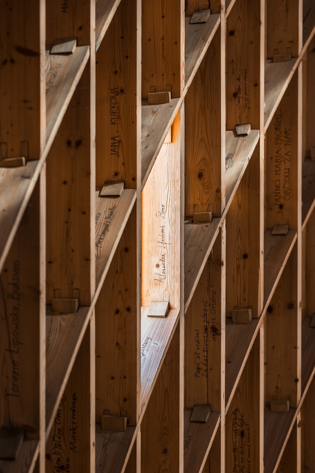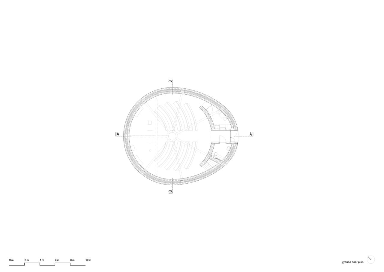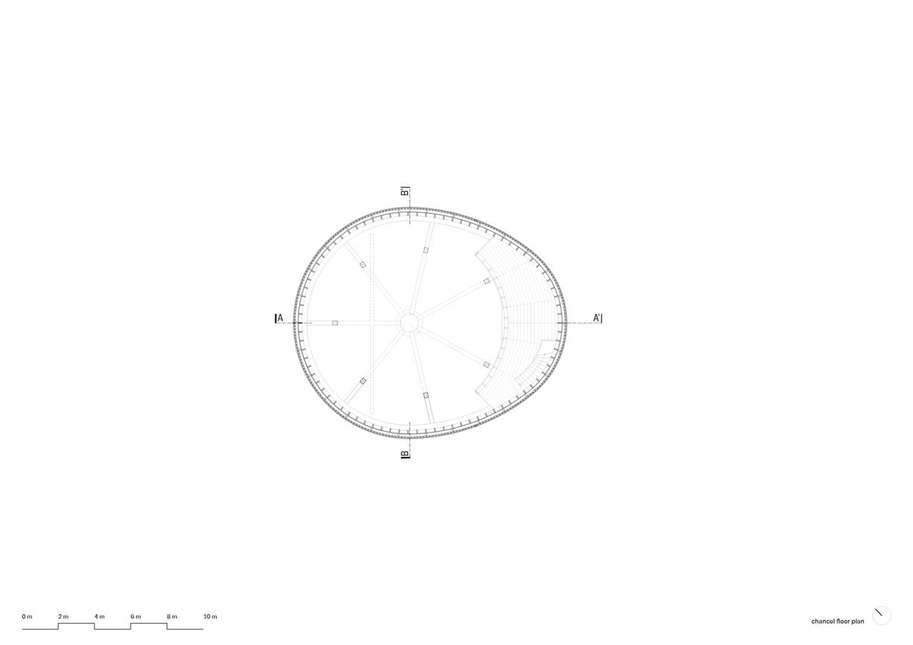 南摩拉维亚那轻轻起伏的景观广阔无垠,一眼望去,无尽的田野绵延不绝。内斯瓦奇尔卡小镇诞生于巴洛克时期,从那以后它的地形几乎未曾改变,它的海拔高度高出周围村庄,因此从远处就能被看到。在这个地区罕见的自然材料,如石头和木材,具有象征意义:将信仰带入这片干涸的土地。设计团队选择了一个中心结构的概念,并将该教堂矗立在山顶,远远望去,这座教堂仿佛一座灯塔,既在空间上起到指引作用,也无形中成为了人们精神上的依托。