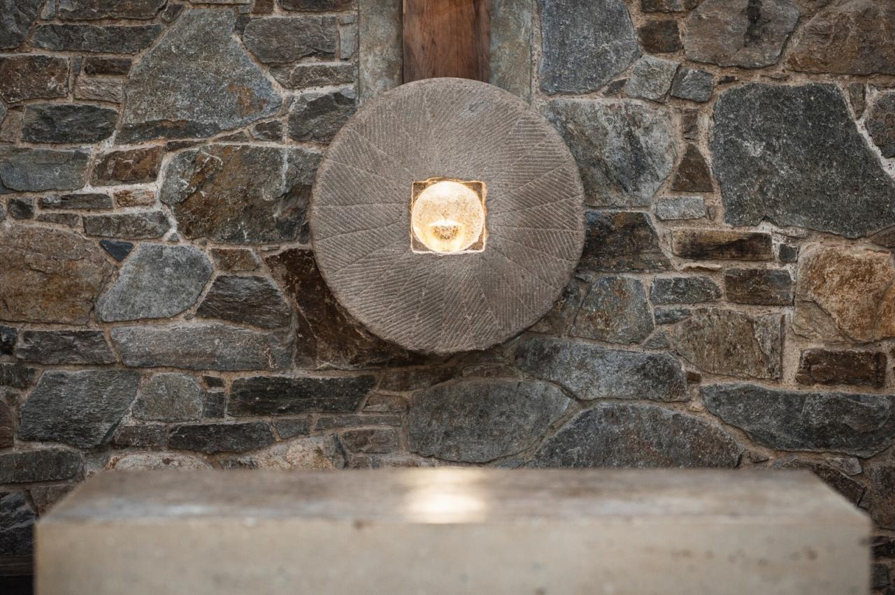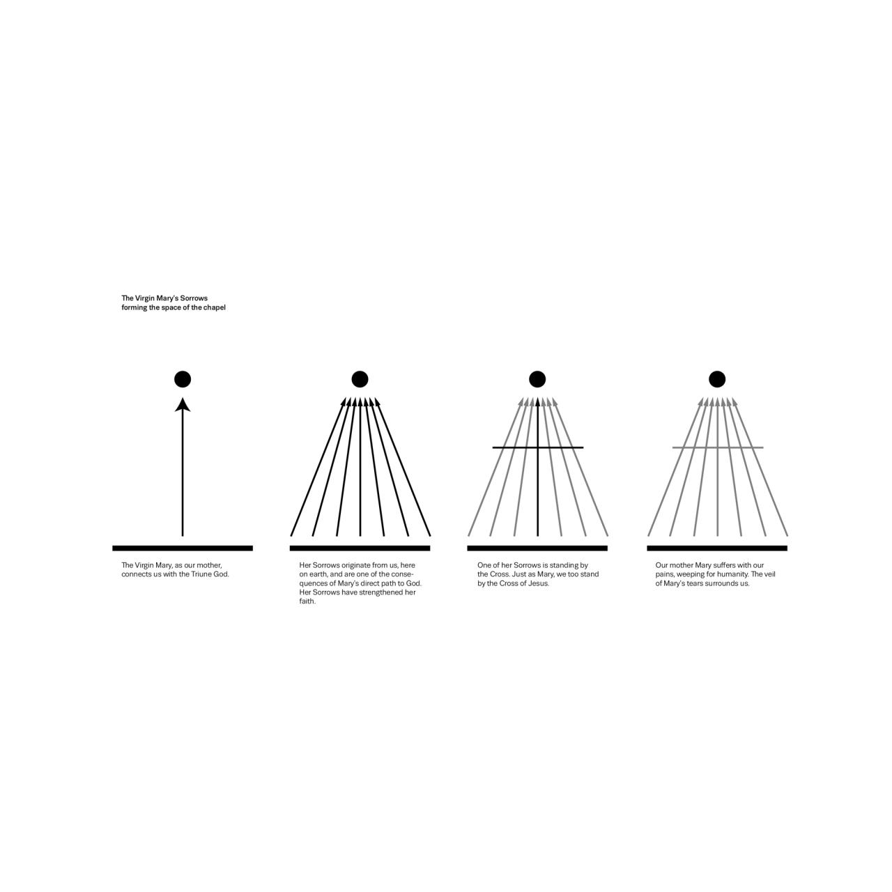 当地人选择了圣母怜子像作为小礼拜堂的守护神,象征着她所承受的苦难。她的故事和情感在空间中得到体现。设计团队建造了一座庙宇,该庙宇下部由片麻岩石制成,代表着人的固执、不顺从、难以塑造。从这些石头中,七根横梁升向天空,象征着圣母玛利亚的七苦,将人与上帝相连。精致的木结构与小窗户交织在一起,让阳光始终能够渗透进小礼拜堂内。建筑周围环绕着一圈小径,还有苹果树形成的一条通向小礼拜堂的大道,教堂后面的果园与周围的田野相连。