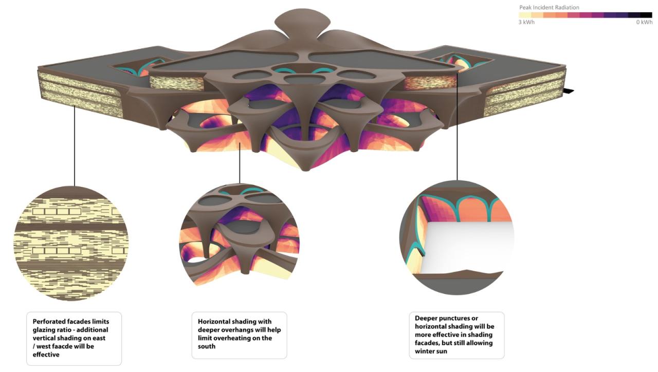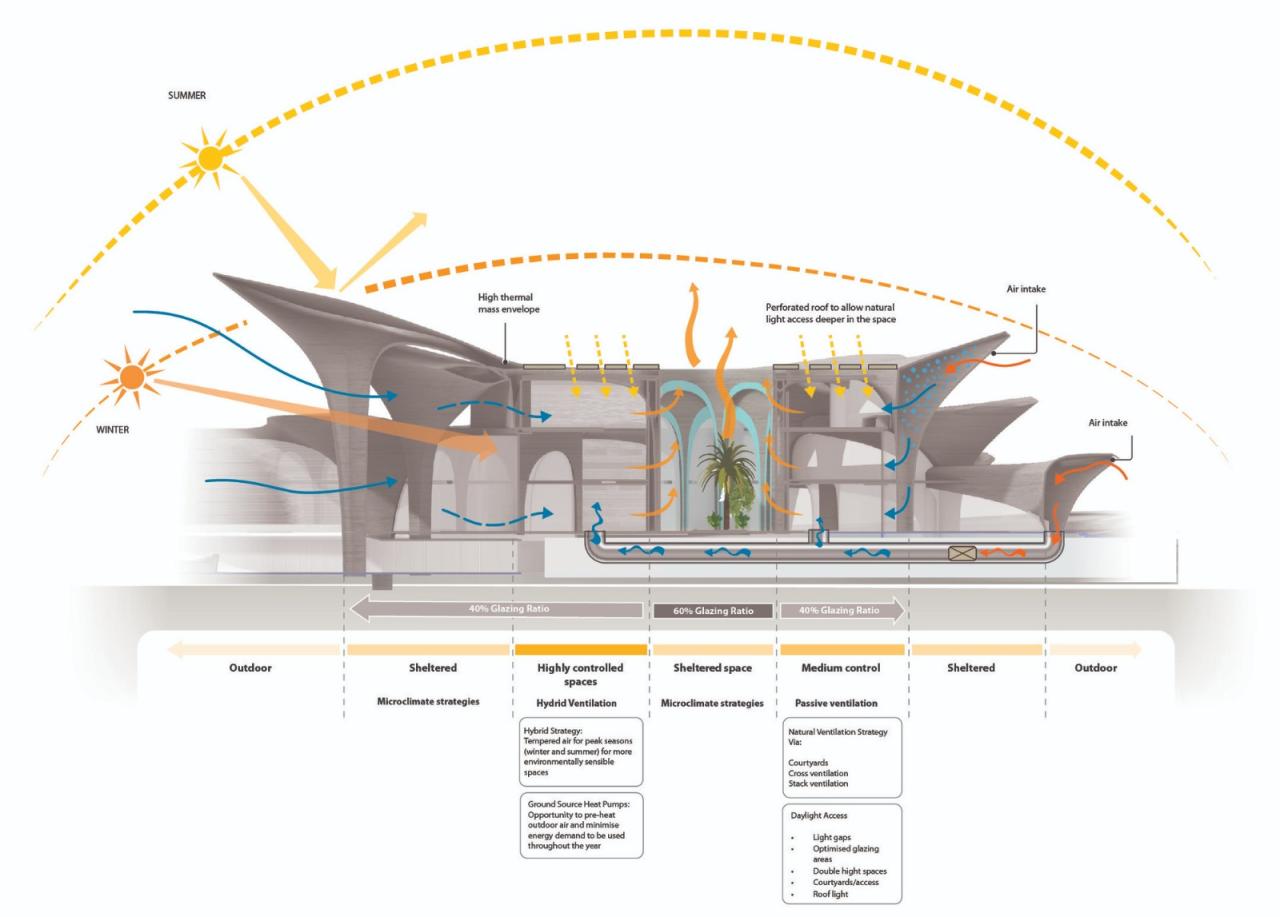 受其所处位置的地中海气候及大陆性气候影响,该项目的设计遵循被动式建筑原则,旨在为访客、工作人员和学生提供最佳的学习和生活环境,同时最大限度地减少能耗。设计团队从中亚和中东乡土建筑中用于调节室内气温的风塔中获得启发,将该中心支撑拱的几何形状和构造设计为空心结构,该结构带有开口,可捕捉风并将冷却通风引入建筑。在最热的月份,该自然通风系统将空气在进入建筑内循环之前对其进行冷却,保证了室内的凉爽。在无风天气条件下,这些空心拱形结构会产生压力梯度,将热空气向上抽出,形成热烟囱,使较暖的空气通过每个拱顶部的开口逸出。这些冷却原理通过昼夜循环得到增强,在抽出热空气的同时,将较冷的空气留在下方。结合该中心结构的高热容量,可以在最小能耗下保持室内处在一个较为舒适的温度。庭院和天窗将自然光引入中心的核心区域,而深屋顶悬挑则在夏季为立面提供了有效的遮阳,同时该悬挑设计在冬季也允许阳光进入建筑,从而温暖内部空间。