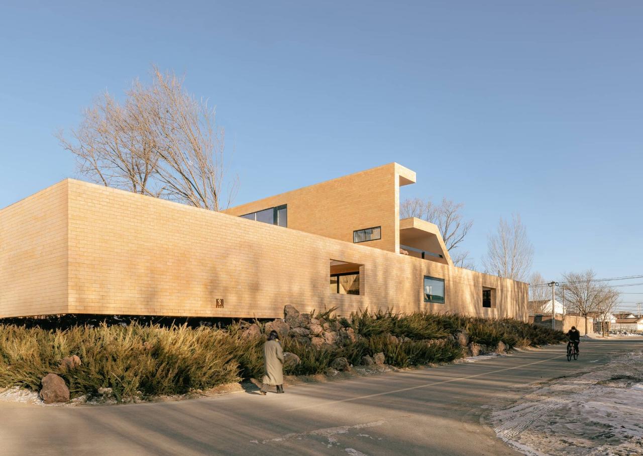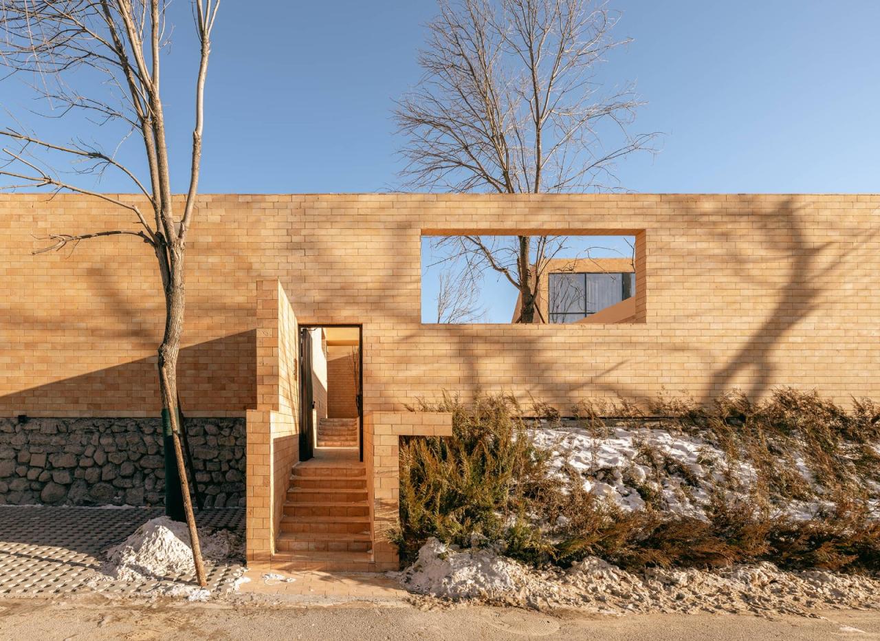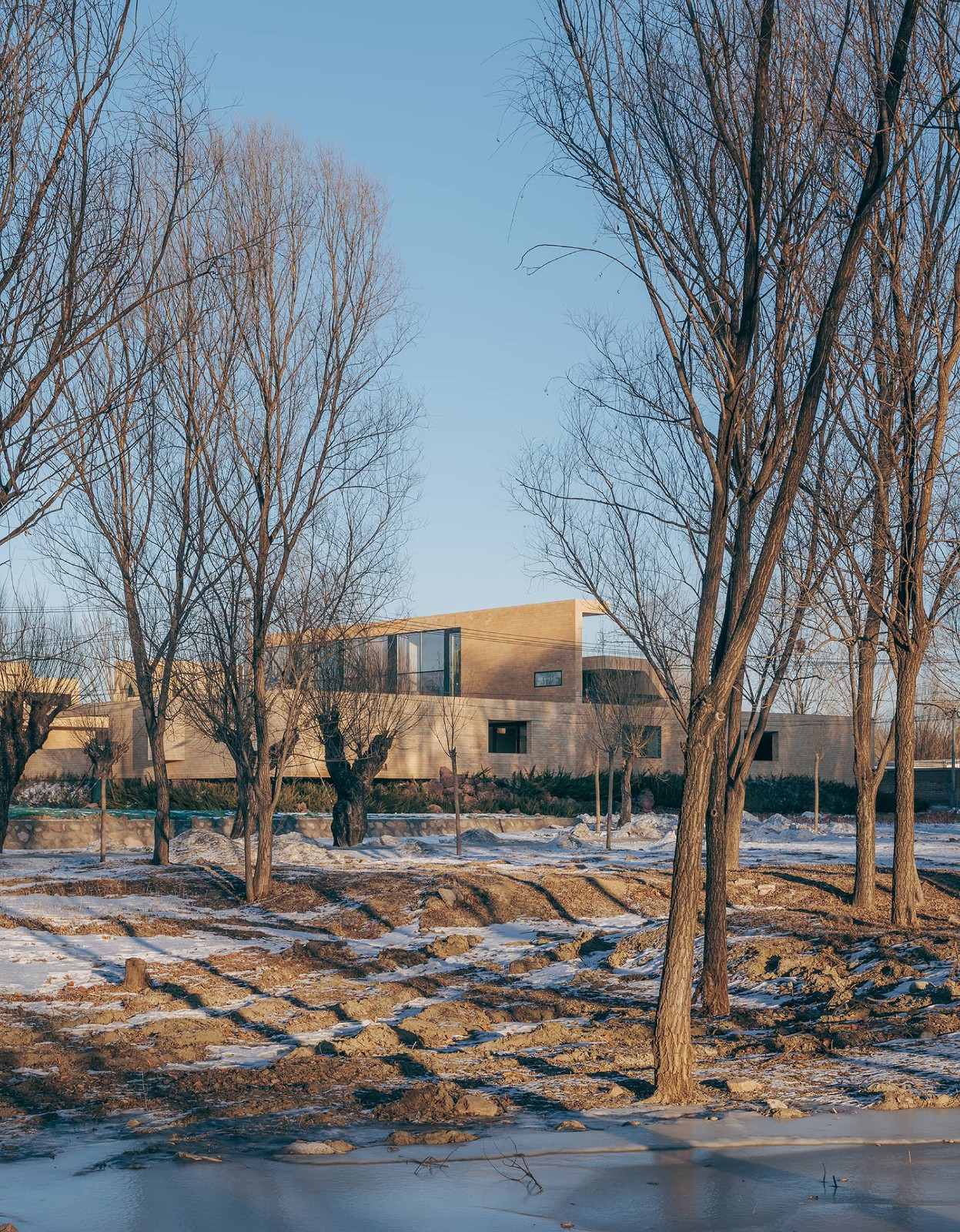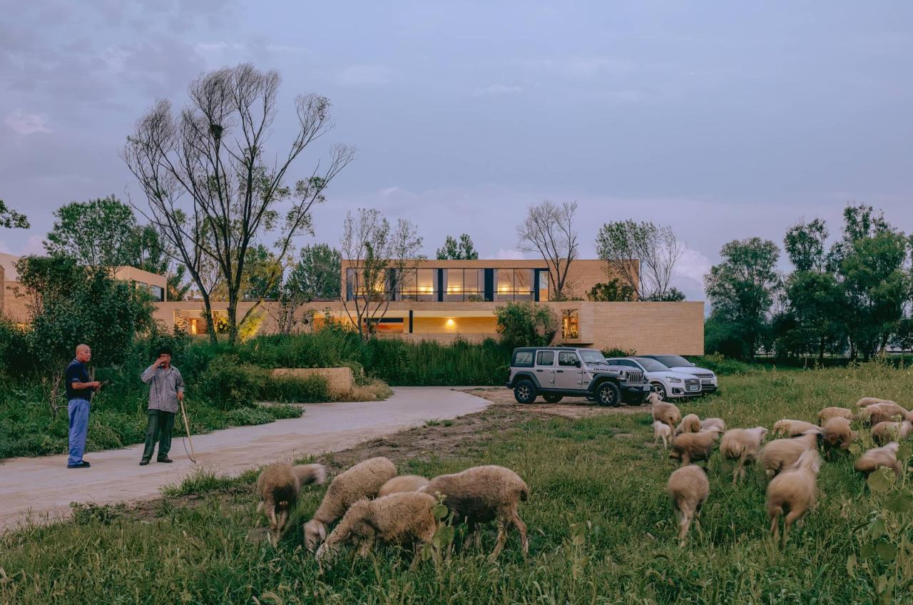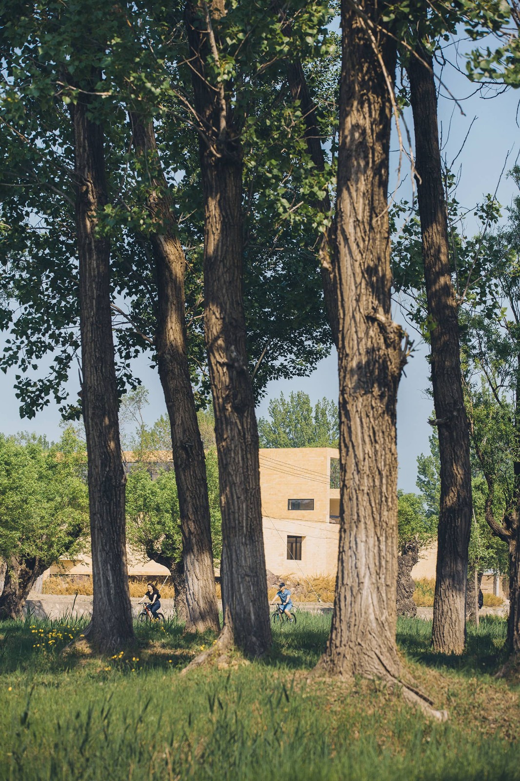 给酒店大堂的二层设置室外景观露台,视线面向西侧柳林与野鸭湖方向打开,绿意葱葱尽收眼底。景观庭院作为乡野风景的延伸,墙上的方窗同样会框出西边的夕阳与枝条。对场地原来的树木位置进行准确定位后,在院中重新配置植物,还原过去场地里枝叶间的风声,也为连续的空间节奏打下松弛的节点。