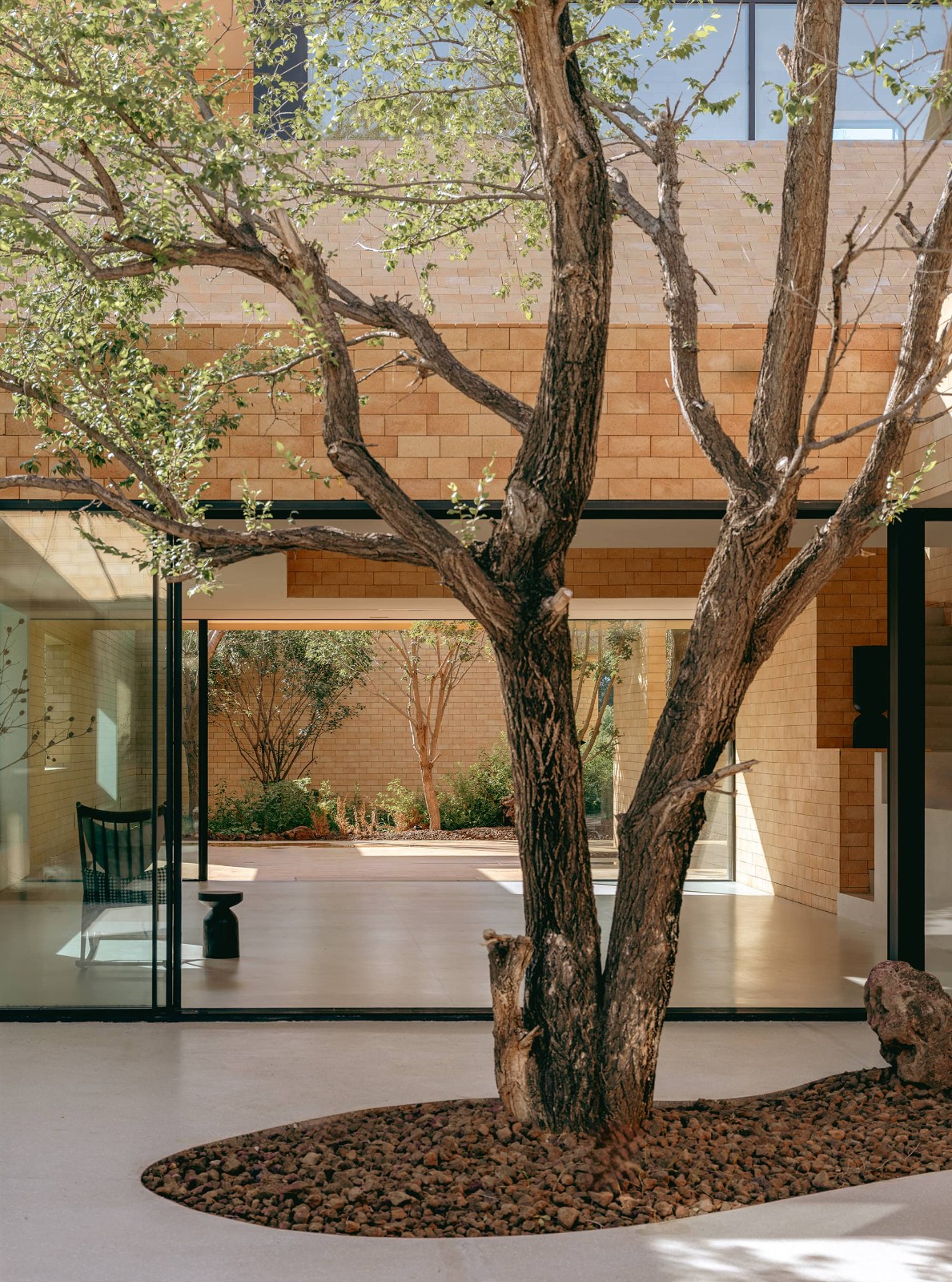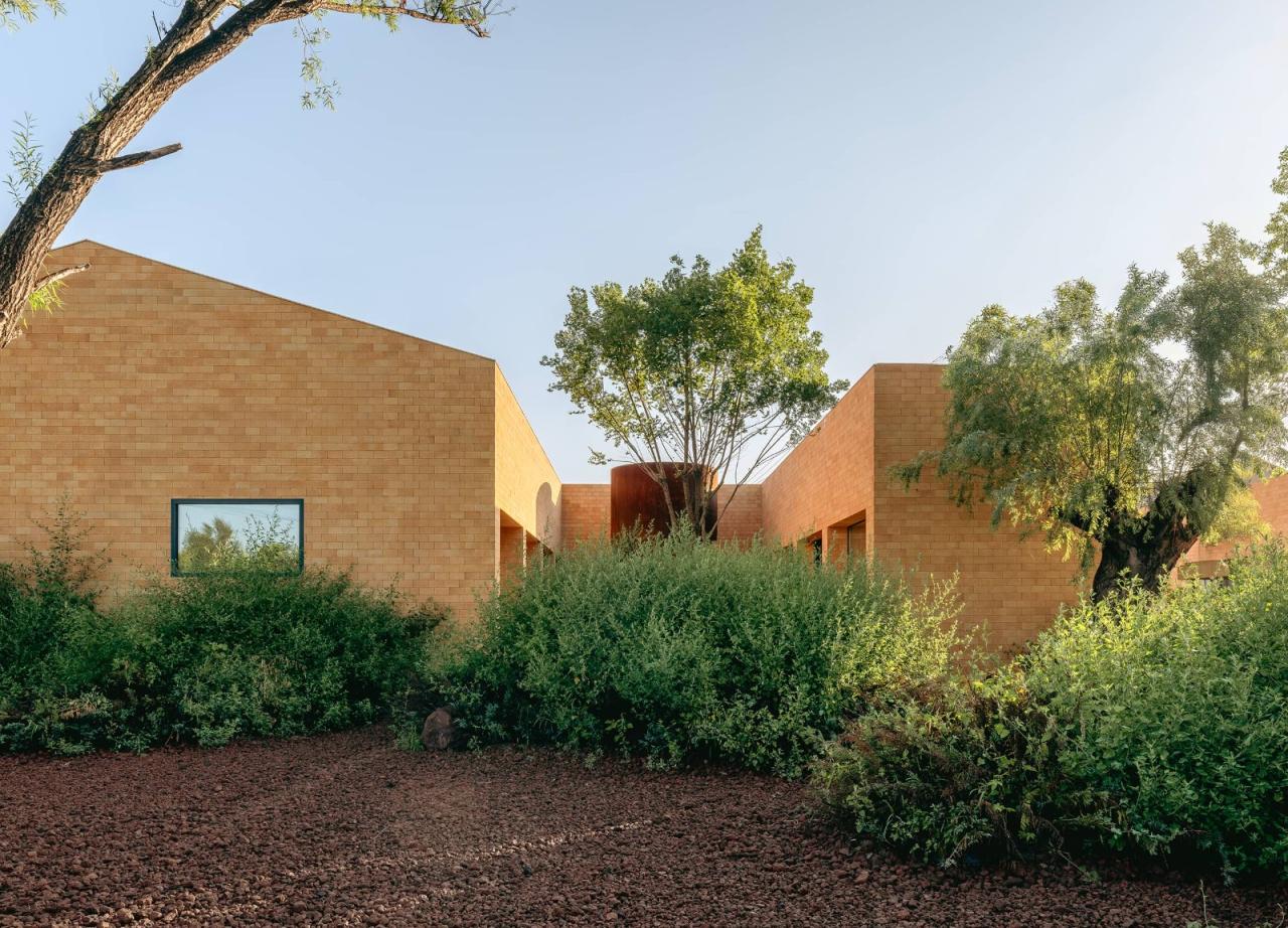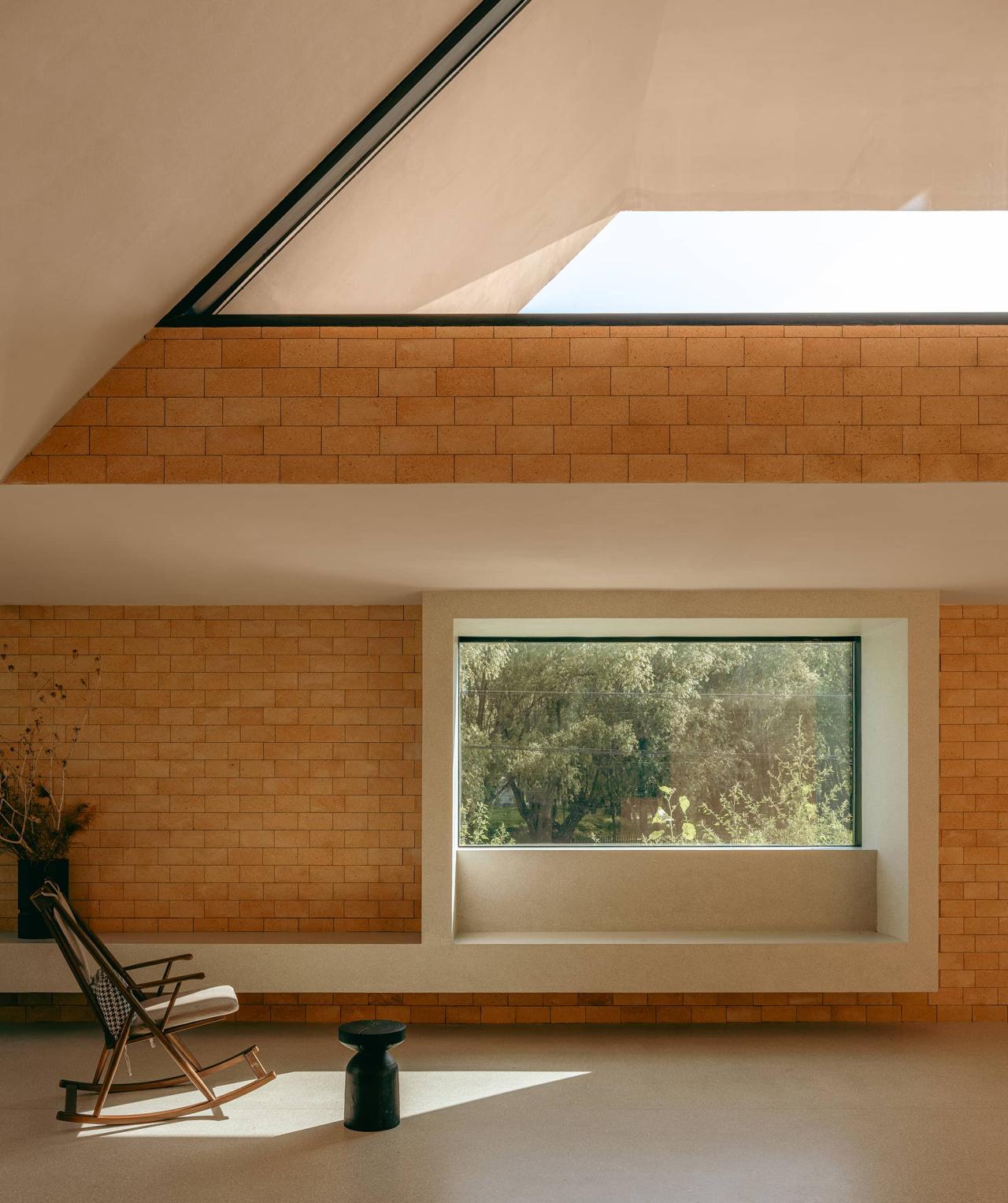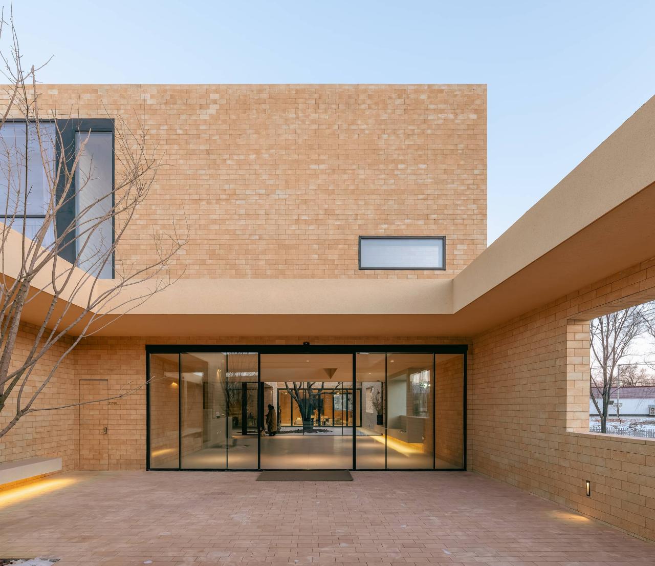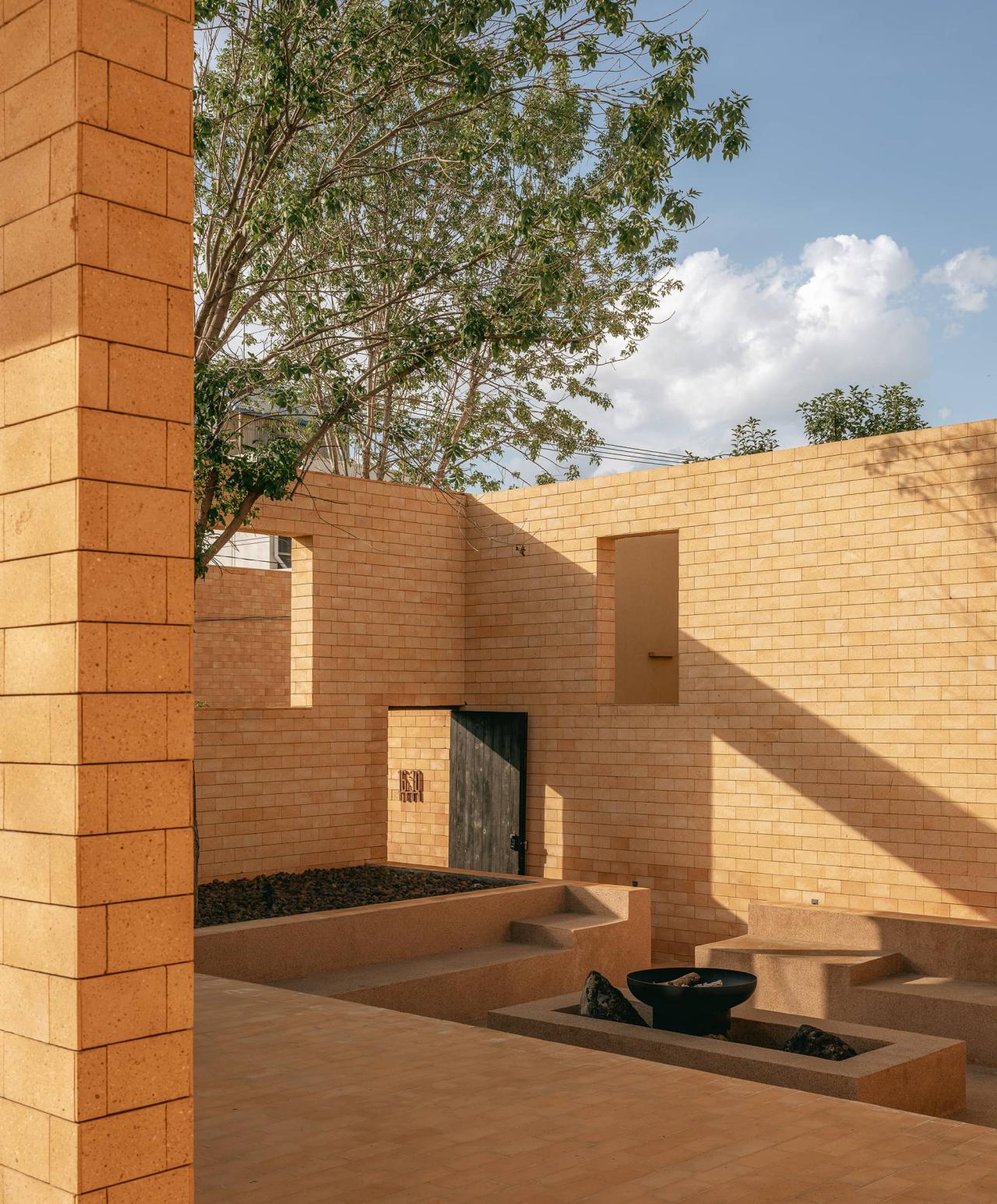 给酒店大堂的二层设置室外景观露台,视线面向西侧柳林与野鸭湖方向打开,绿意葱葱尽收眼底。景观庭院作为乡野风景的延伸,墙上的方窗同样会框出西边的夕阳与枝条。对场地原来的树木位置进行准确定位后,在院中重新配置植物,还原过去场地里枝叶间的风声,也为连续的空间节奏打下松弛的节点。