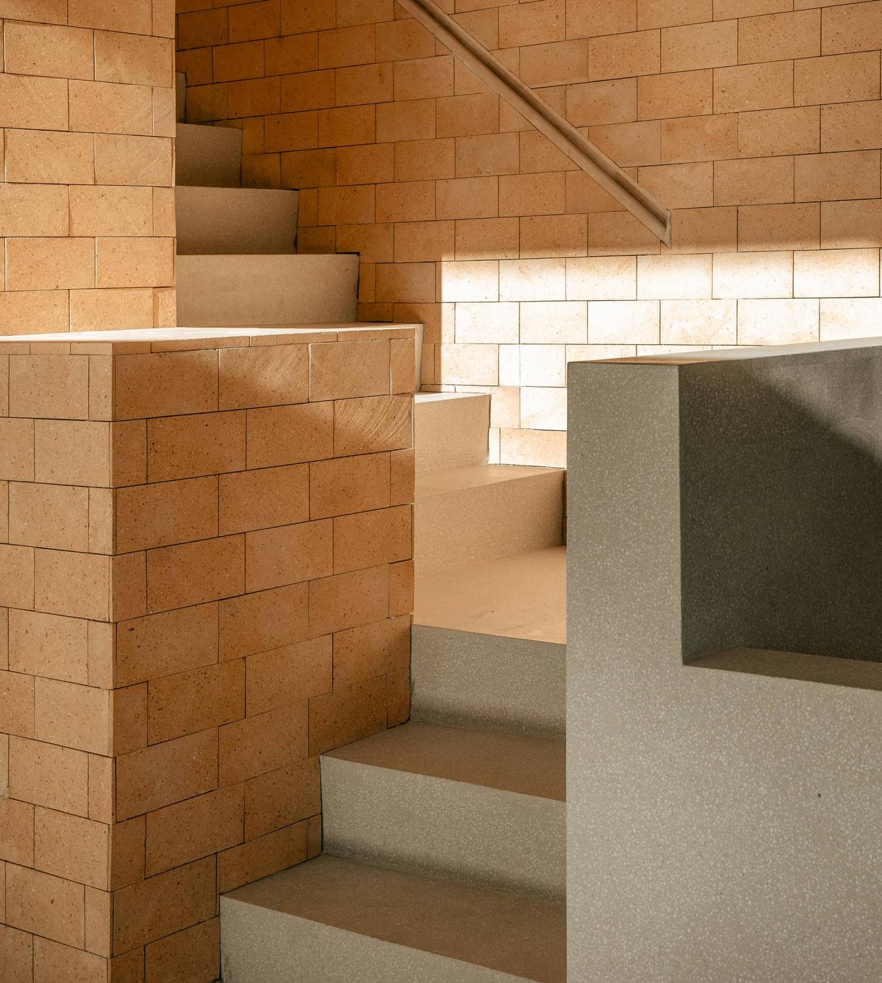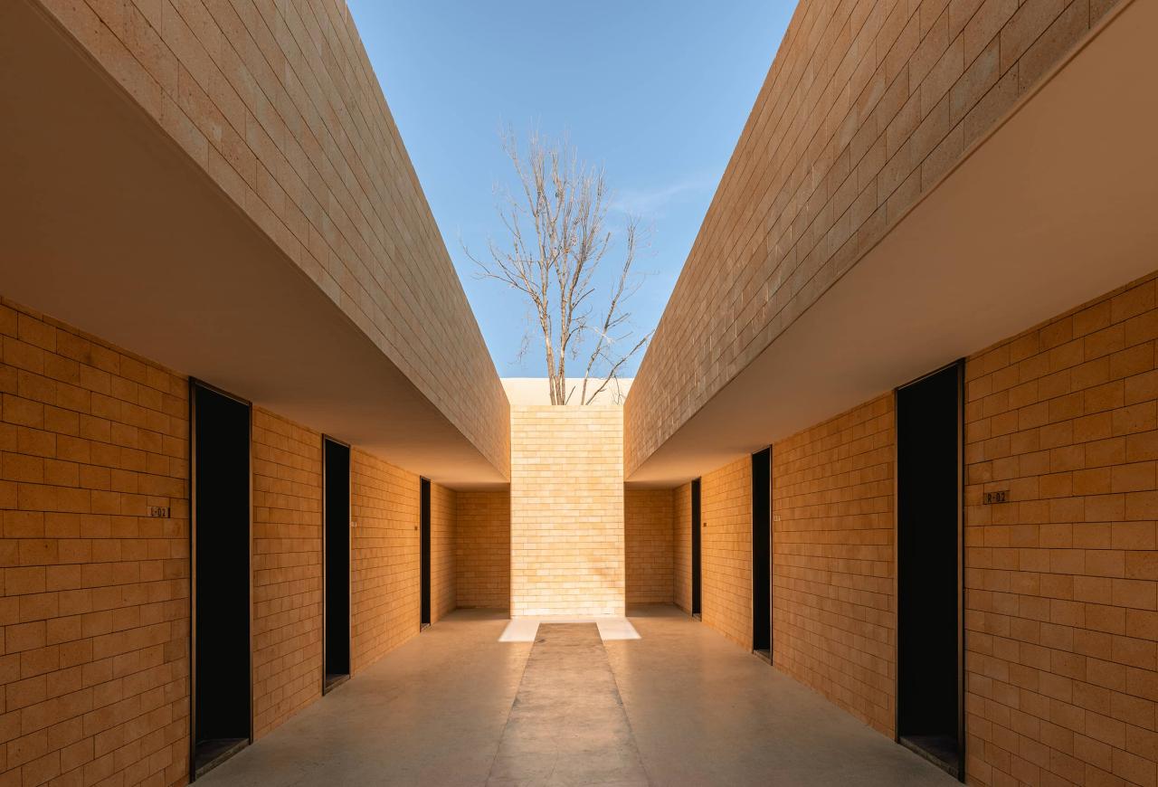 由于场地标高高于村路将近2米,我们借势将这道连续的外墙抬离地面,墙体落于场地标高,但高悬于村路之上,利用场地与村路之间的标高差异,形成一人高的空隙作为酒店主要入口。抬高的墙体为酒店内部与周围环境创造了自然过渡空间——住客穿过树林,从自然环境中钻进院子,沿着坡道迂回向上,抵达酒店大堂。