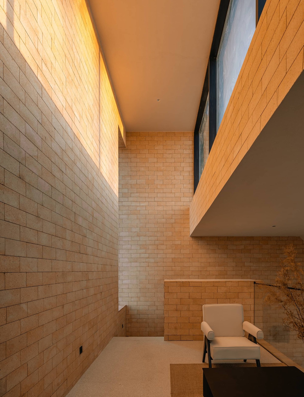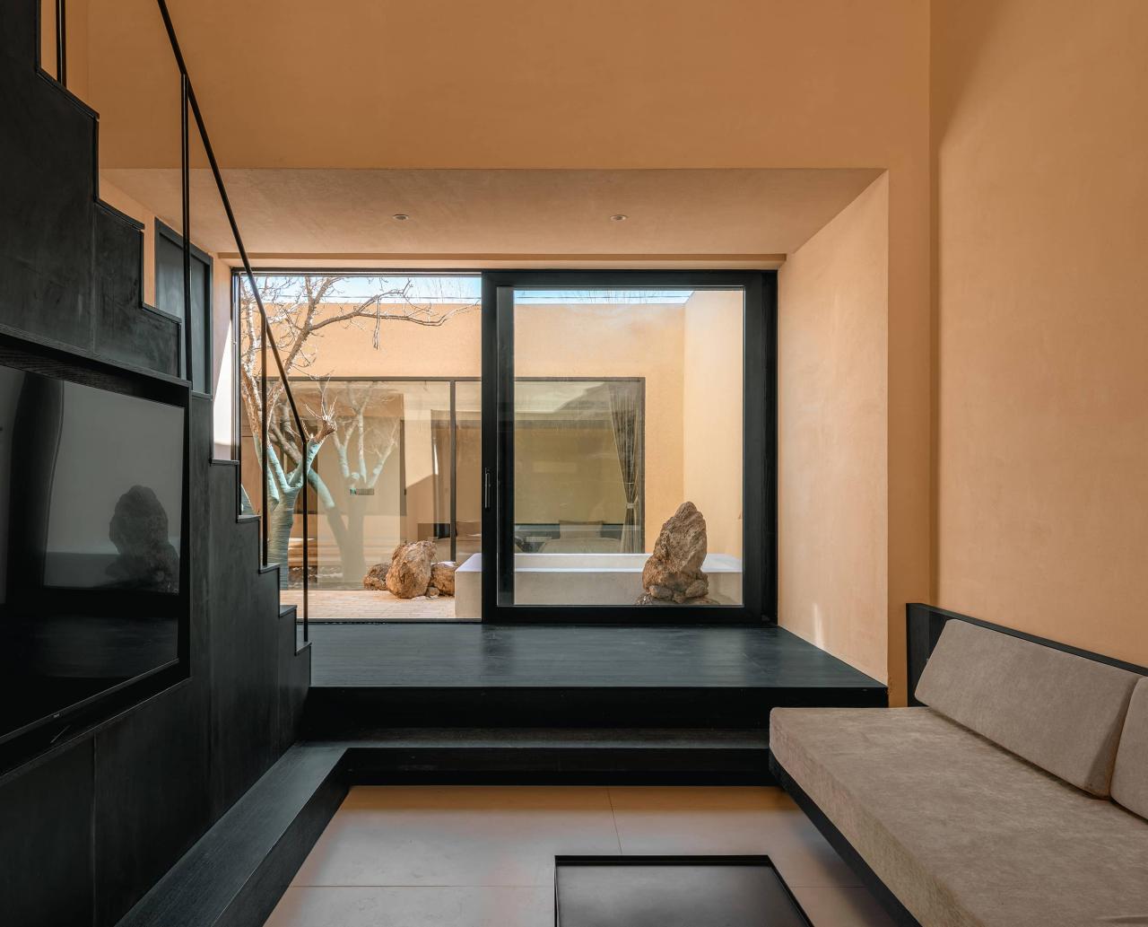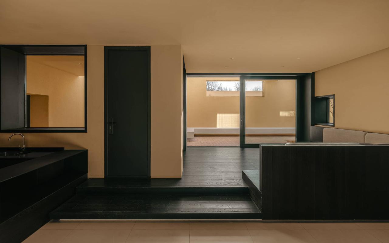 在入口待客区,酒店大堂、休息休闲区等功能空间与院落沿着墙体依次交替在同一轴线上,室内外同种墙体饰面的使用和超大尺度玻璃推拉门,使得室内空间与景观庭院层层递进,室内外的边界被弱化消弭,人行其中,在连续的空间中流动。