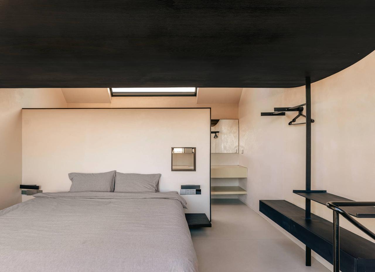 套房客房为三层的loft空间,由旋转楼梯串联。首层是起居室,连接着专属独立庭院,亦通往酒店公共活动区;最高层面向窗口的汤池宛若一叶漂浮的小舟,船底是中间层卧室的弧形天花板,卧室与汤池共享竖向垂直的开放窗口,窗外村庄群山凝碧,影子正漫过田野。