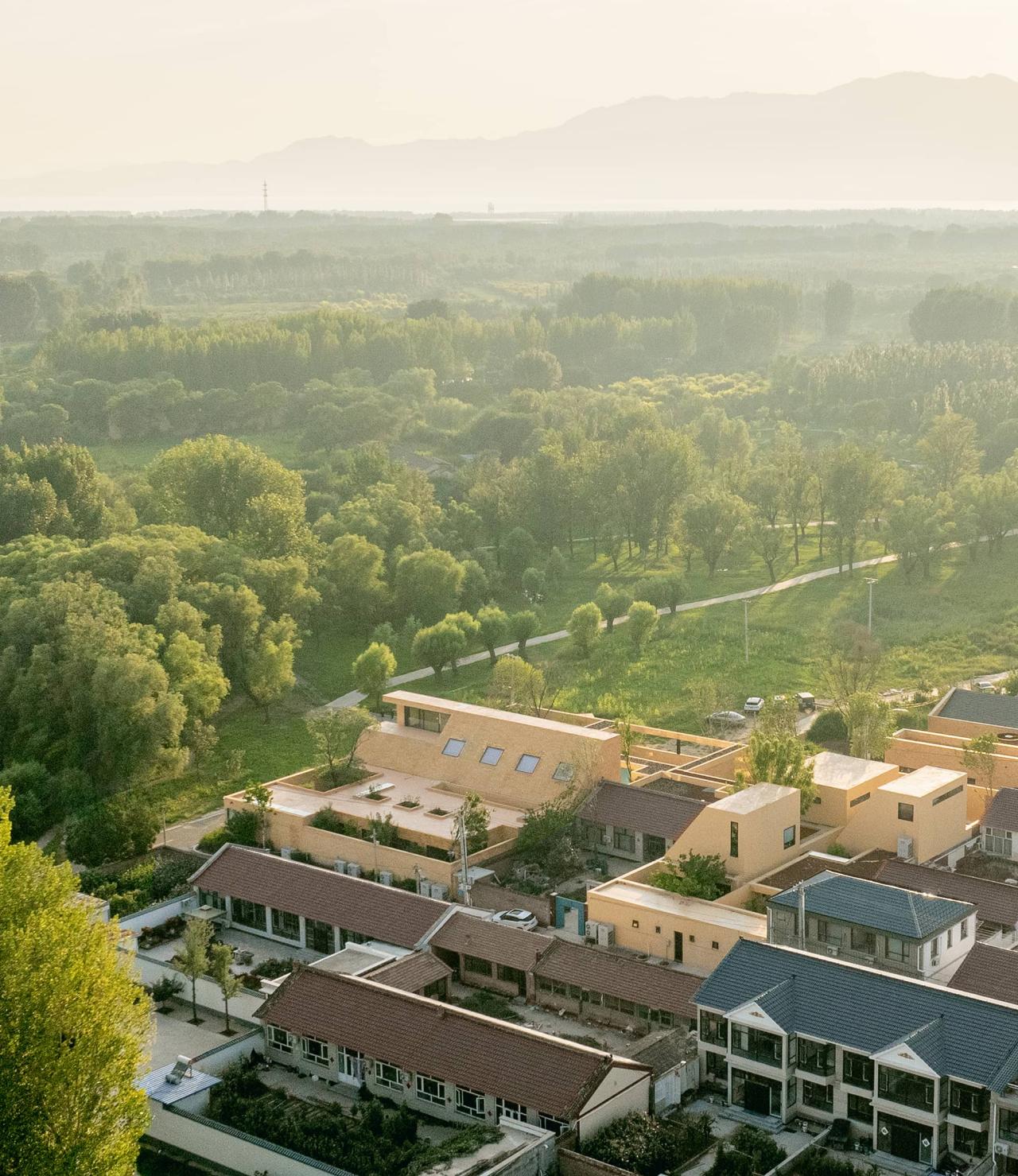 ARVO 16:30 酒店项目位于马营村边缘的西北角,与村外山野一路之隔。这次我们收起以往设计中的一丝跳脱,没再试图给山谷停一座飞船或者在大地上画匹大马,而是模仿隐入自然的马营城堡,将村中几个院子归整到一处,也搭一座城堡,在里面接住探出围墙的树,外观上看起来几乎完全融进村庄场景。淡黄色的建筑和村里老玉米的中黄、夯土城堡的土黄深深浅浅地同色辉映,让建筑充分接纳村庄的原有生活状态。
