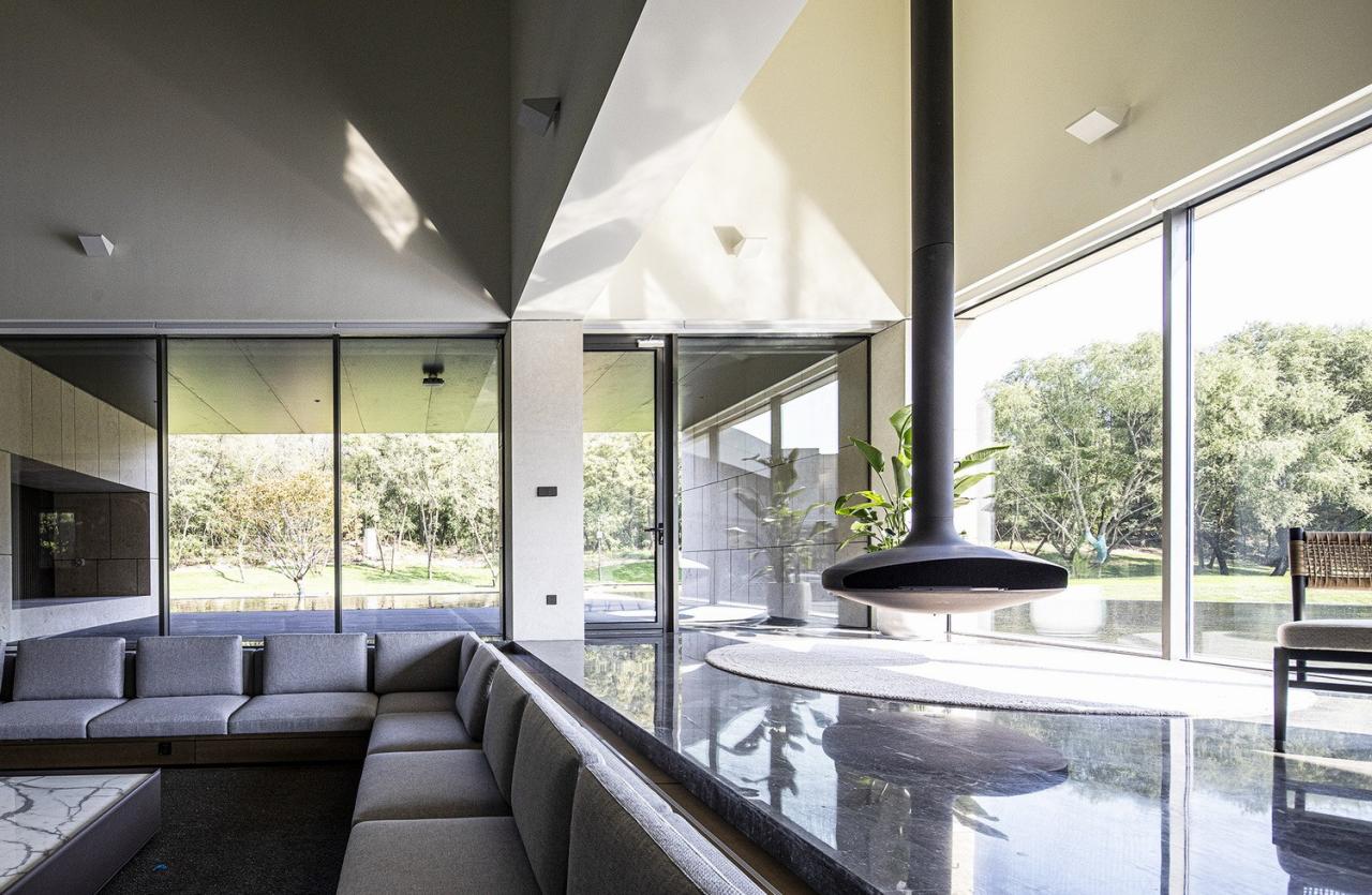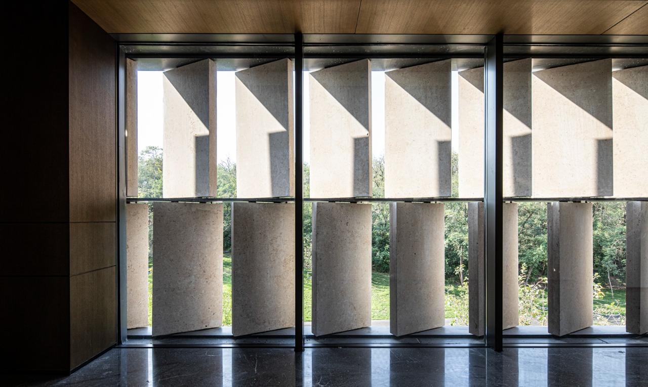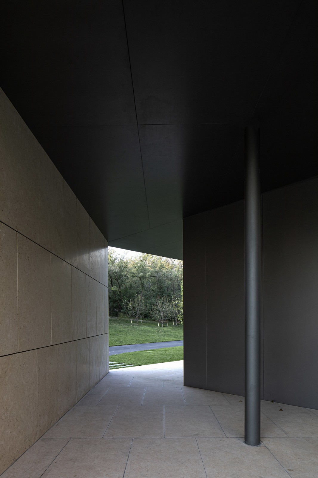 这条抽象的水平线之上的石头外墙塑造了坚固且沉重的体量,更反衬下部的空与透。透过长长的挑檐看出去,远处松散的自然建立了一定的秩序,使其抽象化,形成一线浓缩的景观带,将周围环绕的野性景观收集到同一组合之中。