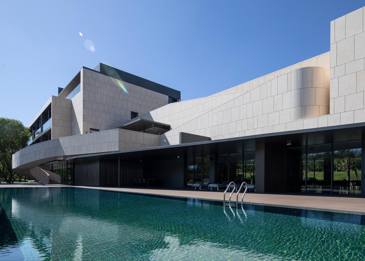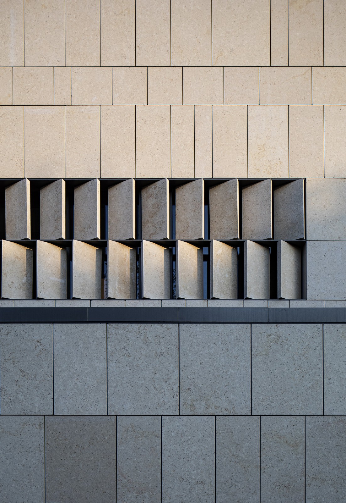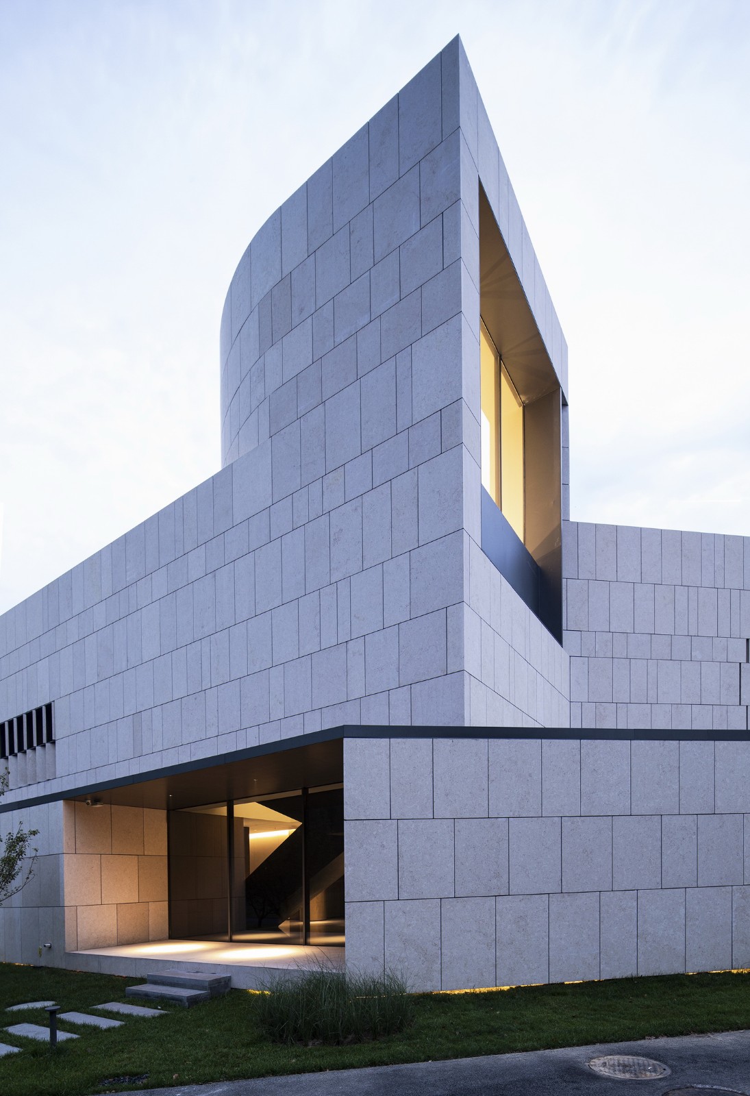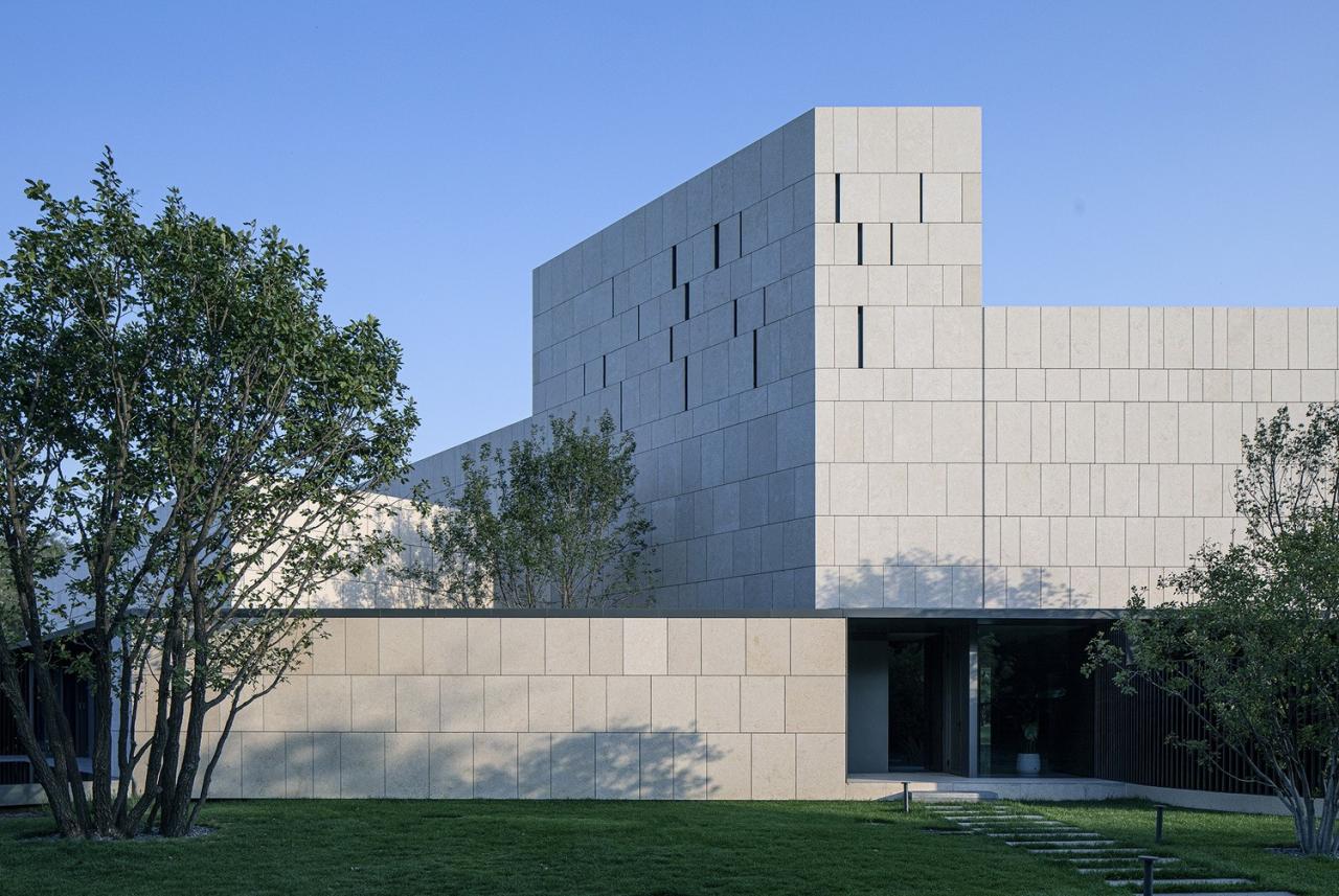 建筑外墙被设计成米黄色石材,作为北方,米黄色的石头更容易让人在寒冷的冬季联想到一丝暖意,这样的选择同时也是业主的美好期待,这也正反映了北方人和这片土地的共同性格,坚实的外墙,厚重的体量。