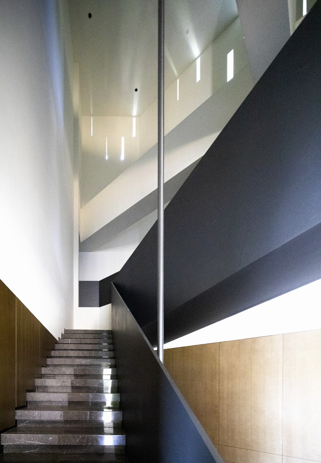 在建筑的中段设计了一个醒目的室外楼梯和坡道,这不仅是消防疏散的需要。更重要的是将二层以上的空间和地面建立了一个直观的联系,可以在上下的日常交通中移步换景,游走于自然之中。