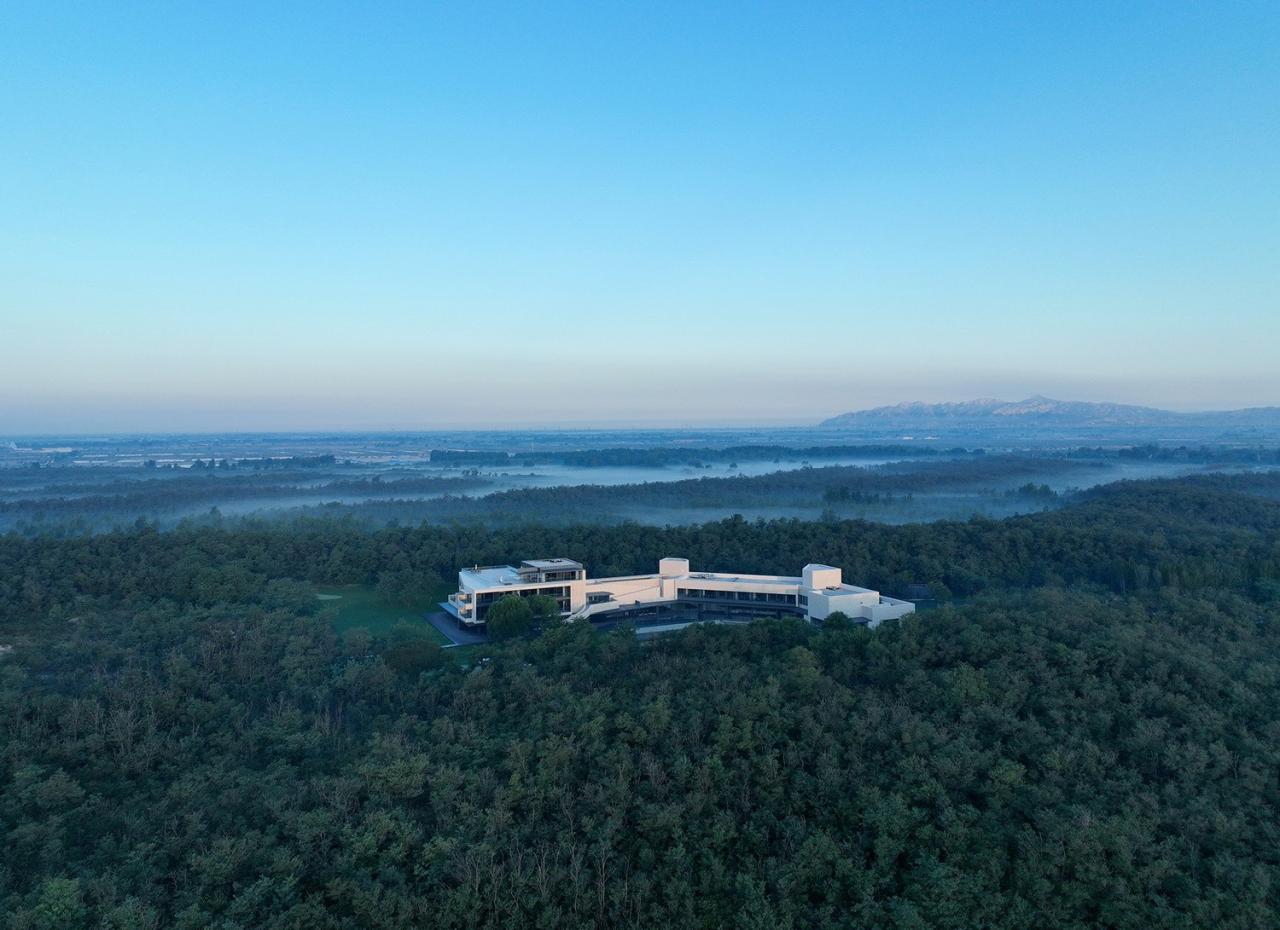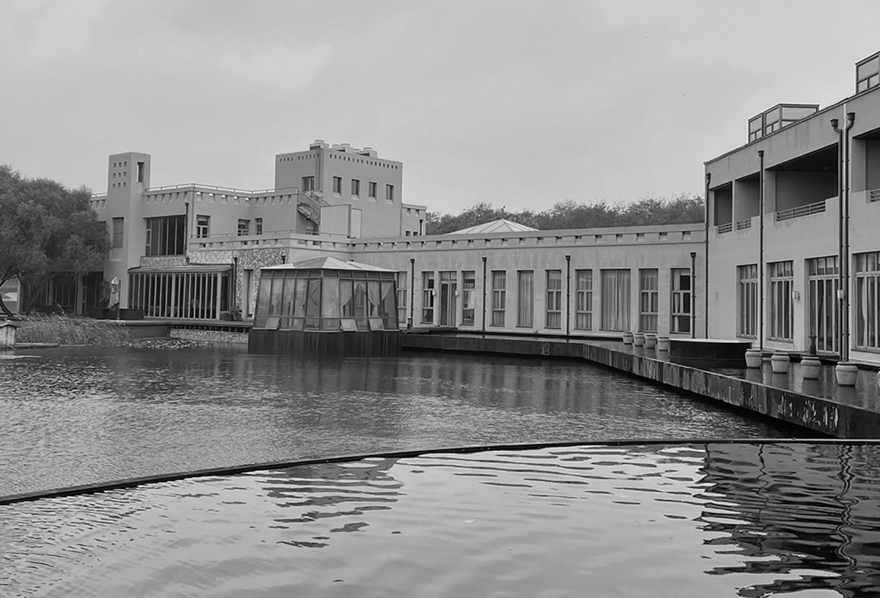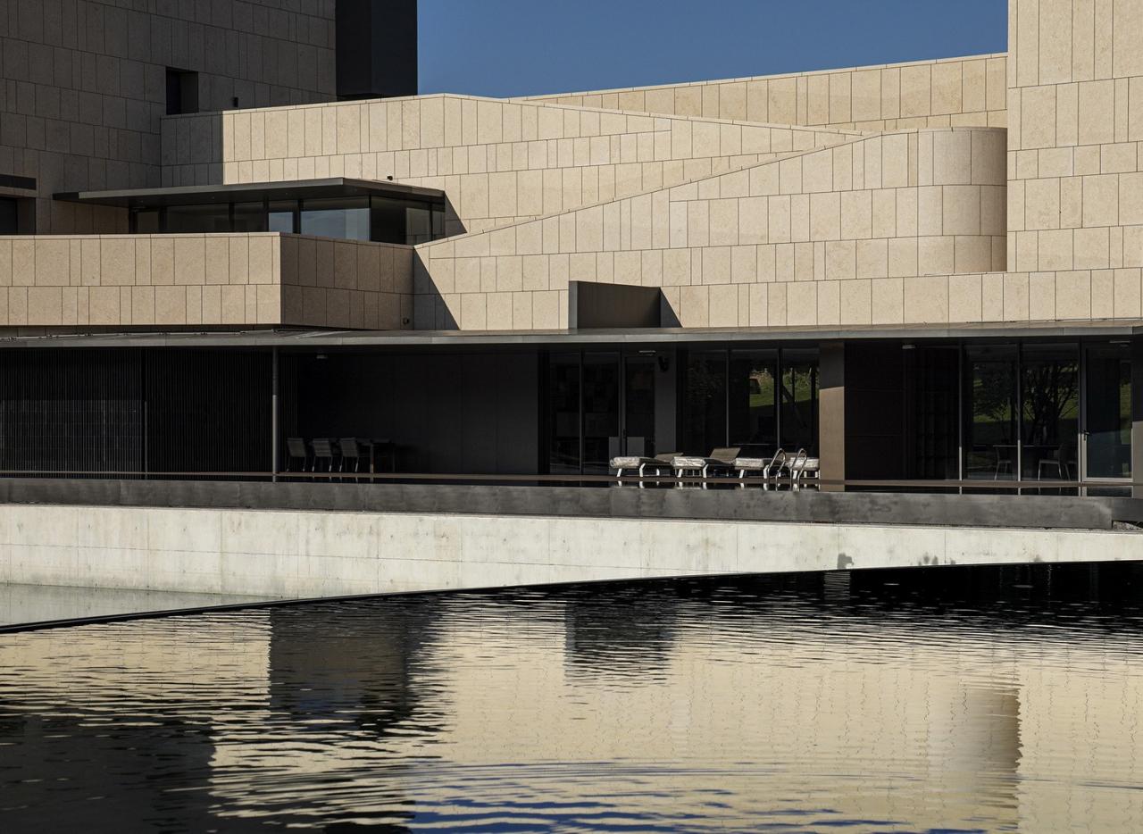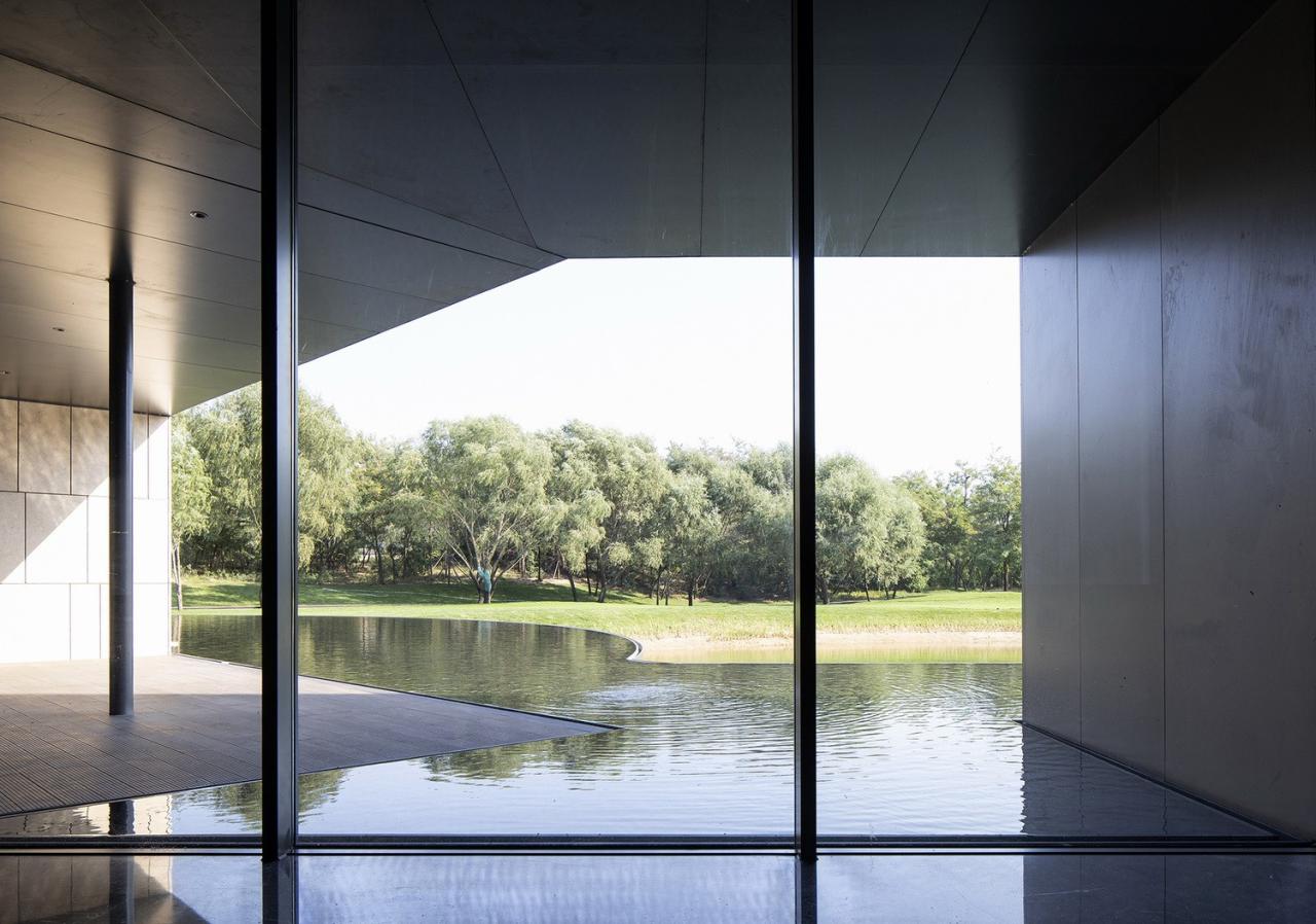 原有建筑沿着刺槐密林边缘线性分布,主体被拉长至百米,且建筑的南侧和东侧均伴有优质水景。但原有建筑的室内布局为单侧走廊,存在大量冗长的过道空间。立面处理也十分封闭局促,建筑周边低缓延绵的微坡景观被托斯卡纳风情的细碎竖条开窗切分得支离破碎。得天独厚的原生景观被毫不吝惜地拒之门外。