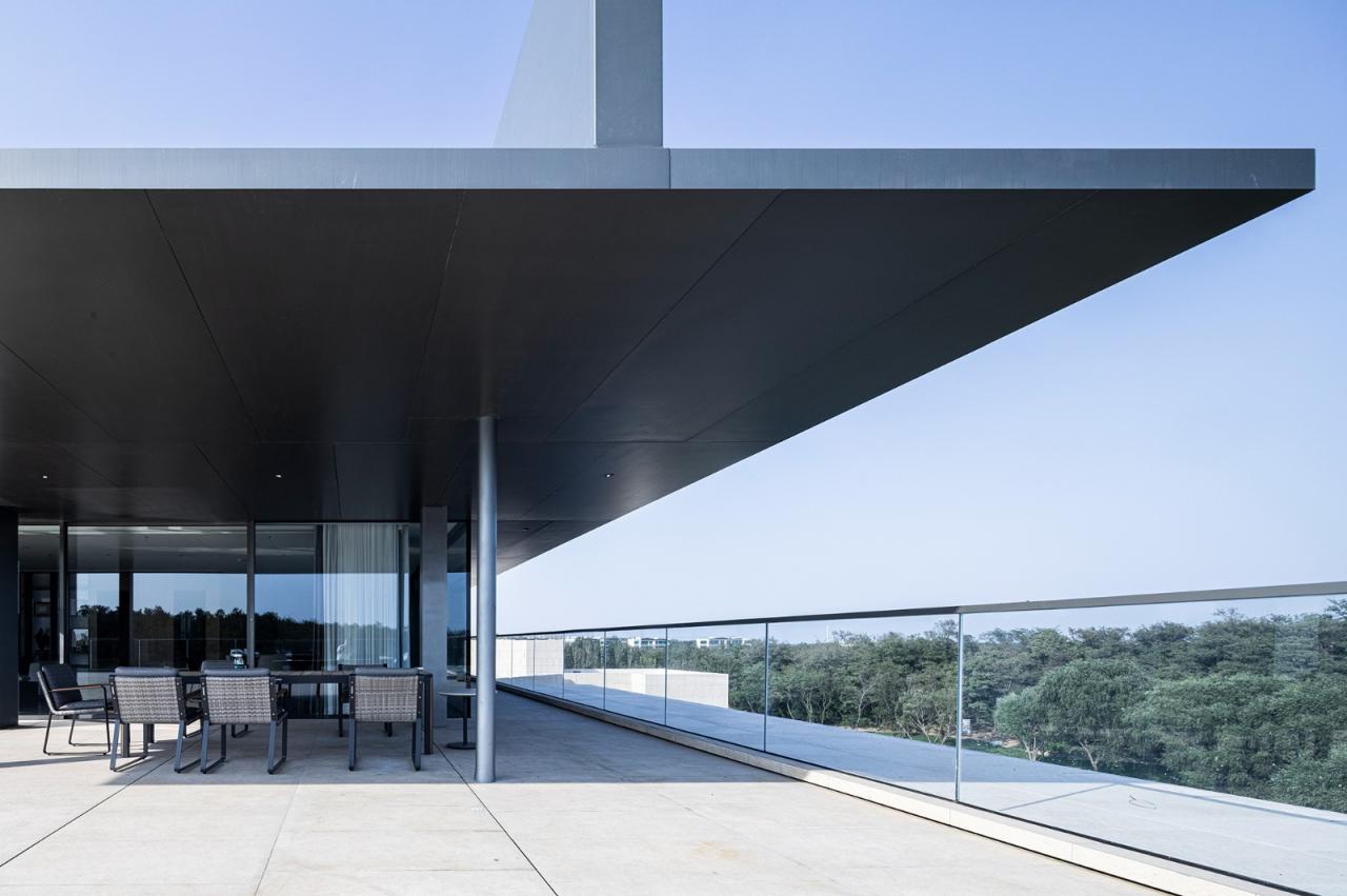 建筑的上部顺应原始建筑体型特性,分为两个独立的部分,一部分是公共的客房区,另一部分作为相对私密的私人居所,中间布置了一个露天羽毛球场。建筑的屋顶在这样的环境中是可贵的,它提供了多样的景观视角和空间体验。